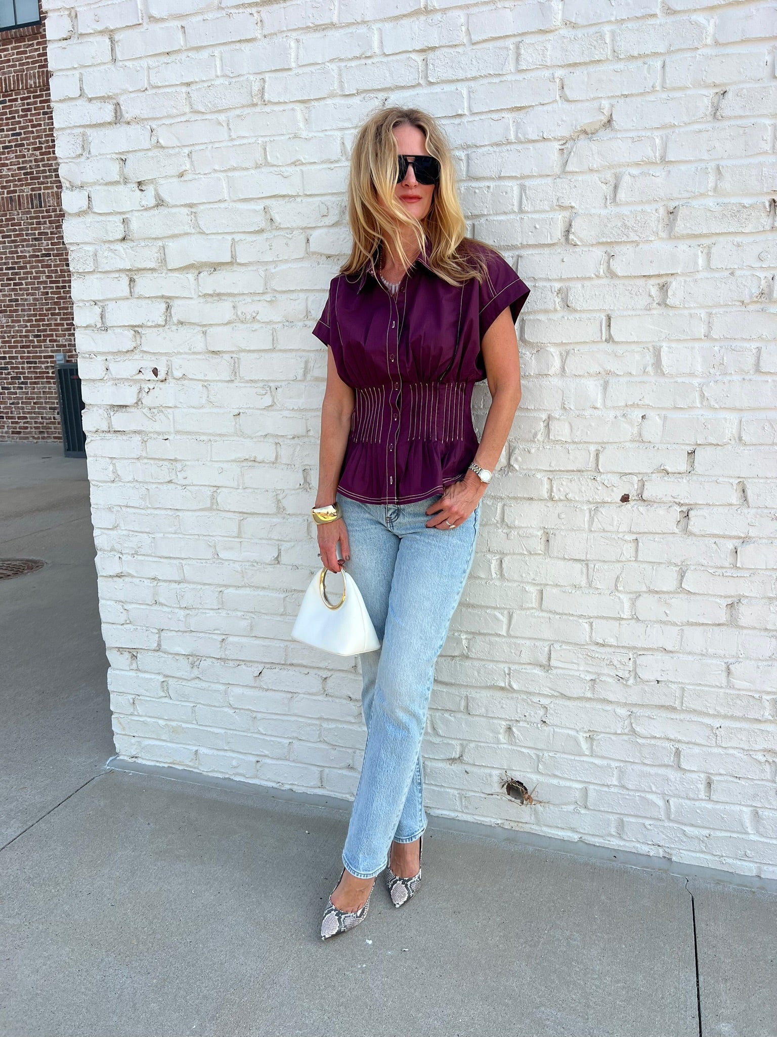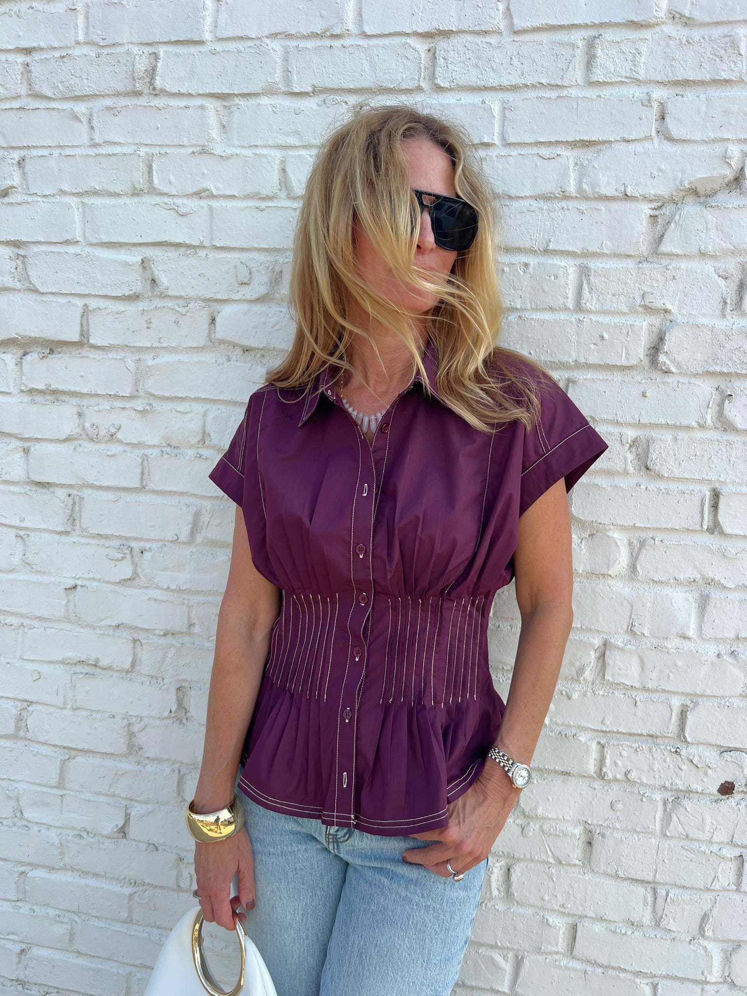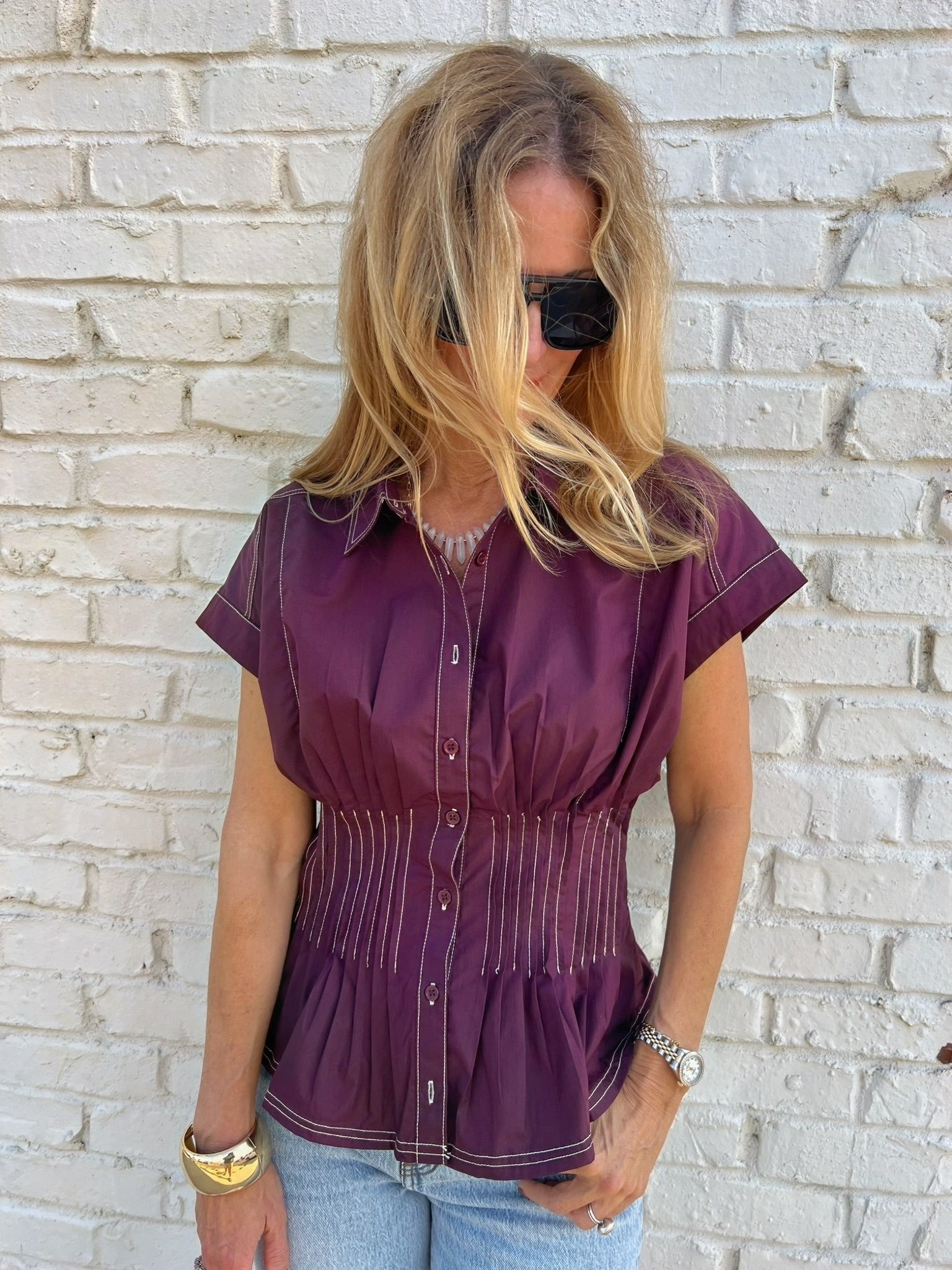 Tailored with a twist—this wine button-front blouse features structured pleating through the bodice, contrast stitching, and a cinched waistline that flares into a subtle peplum hem. The cap sleeves and rich color make it perfect for pairing with denim or tucking into skirts for a more polished vibe.