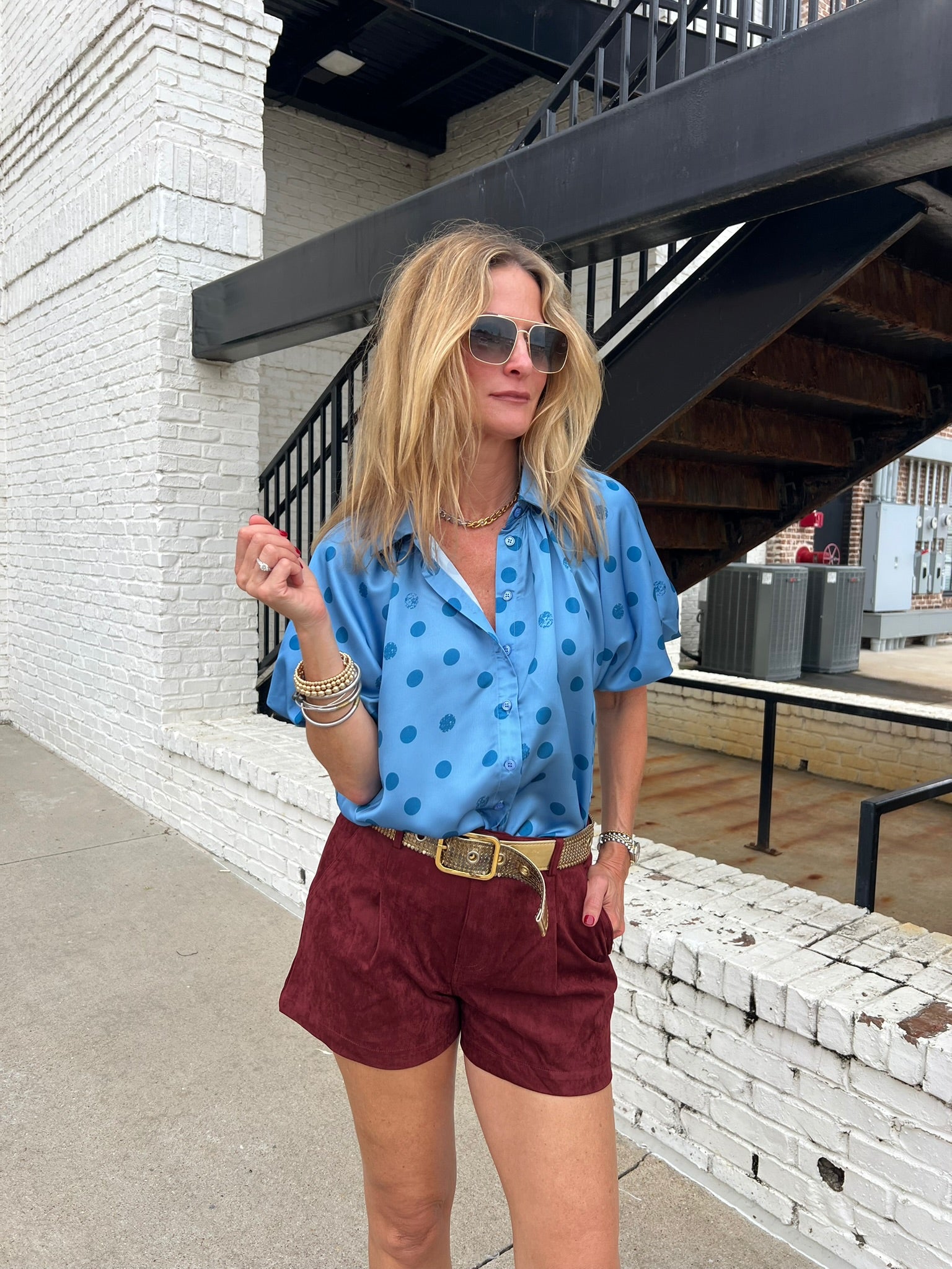 Playful meets polished in this silky button down. Designed in a bold blue with tonal polka dots, this blouse features a relaxed fit, short sleeves, and a classic collar for an easygoing yet elevated vibe. Tuck it into tailored shorts, denim, or skirts for a look that pops with personality.