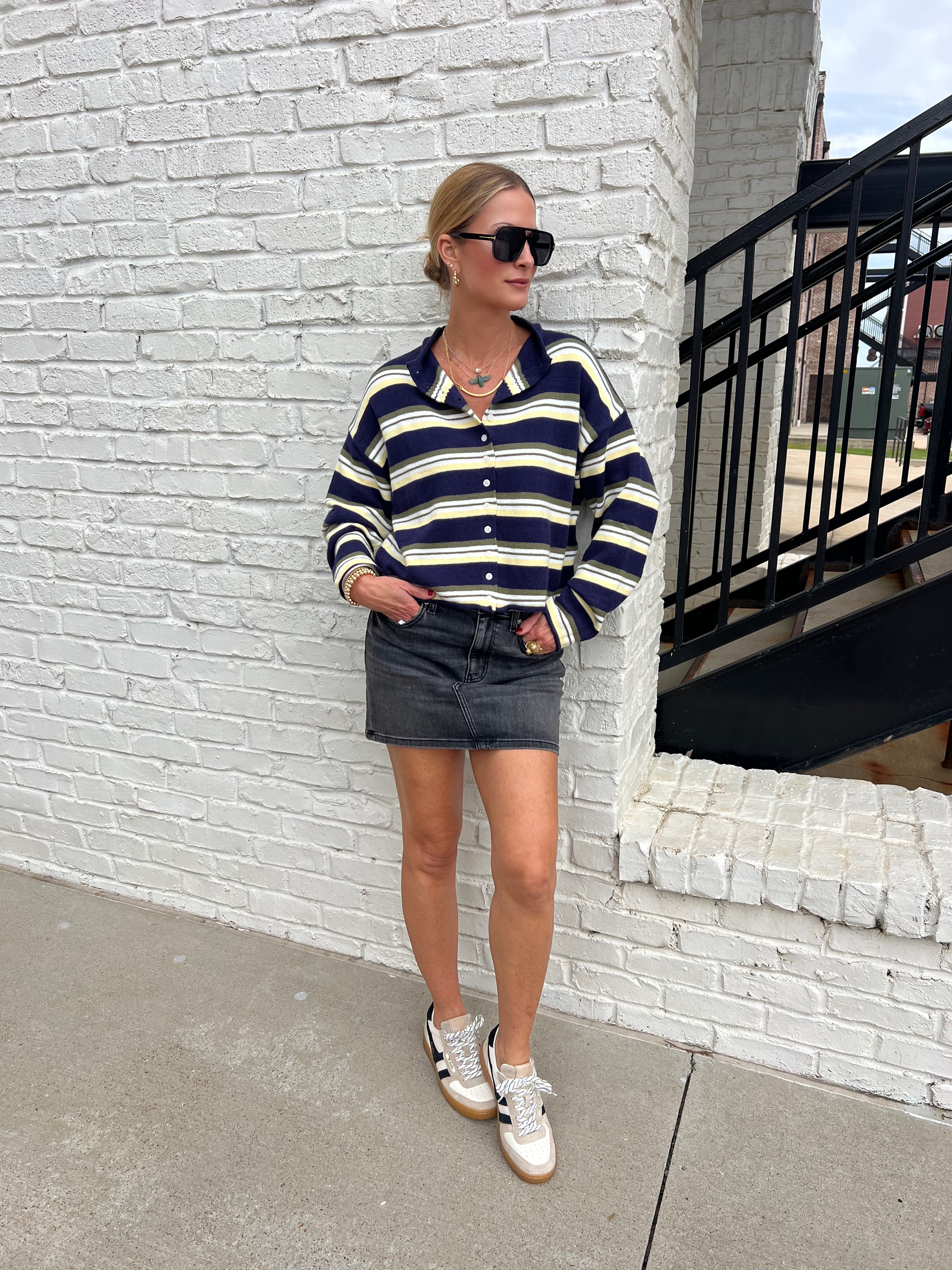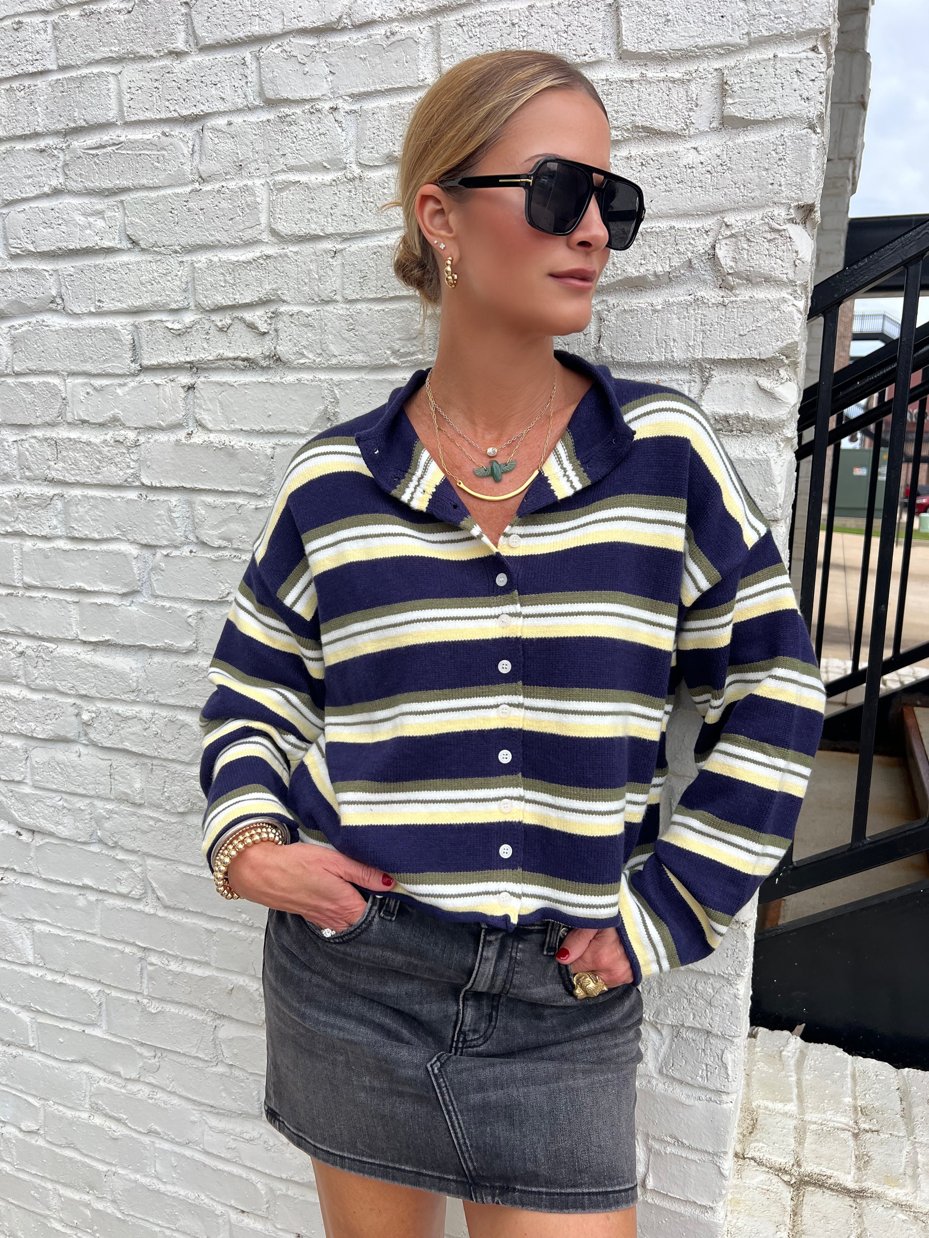 This striped button-front cardigan brings preppy-meets-cool energy to your fall wardrobe. Featuring navy, olive, and ivory stripes with a slightly cropped cut, it layers easily over tanks, tees, or dresses. Wear it open for a relaxed look or buttoned up for a polished finish.