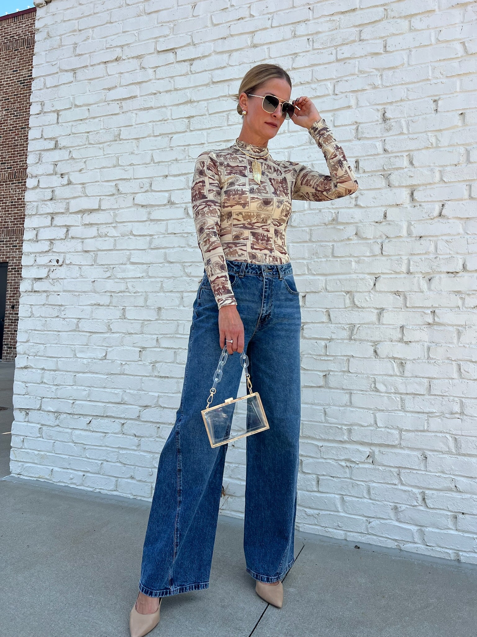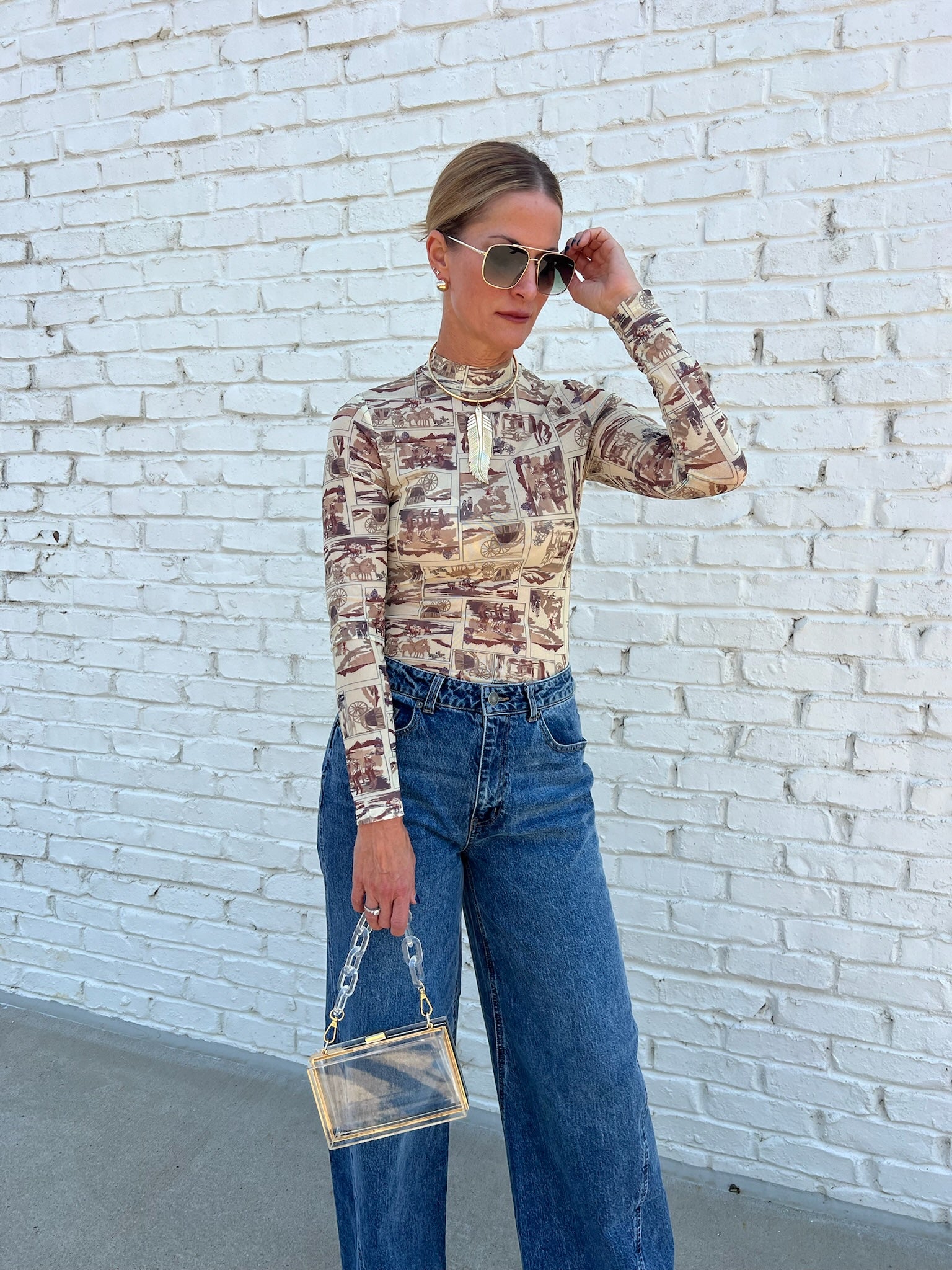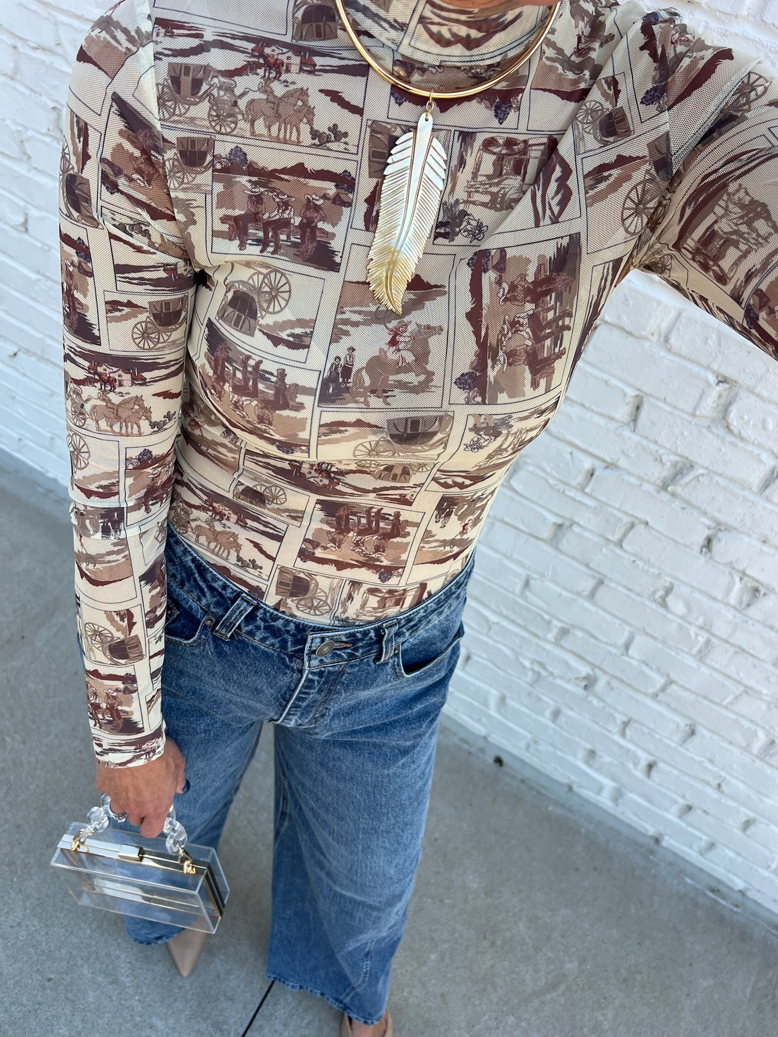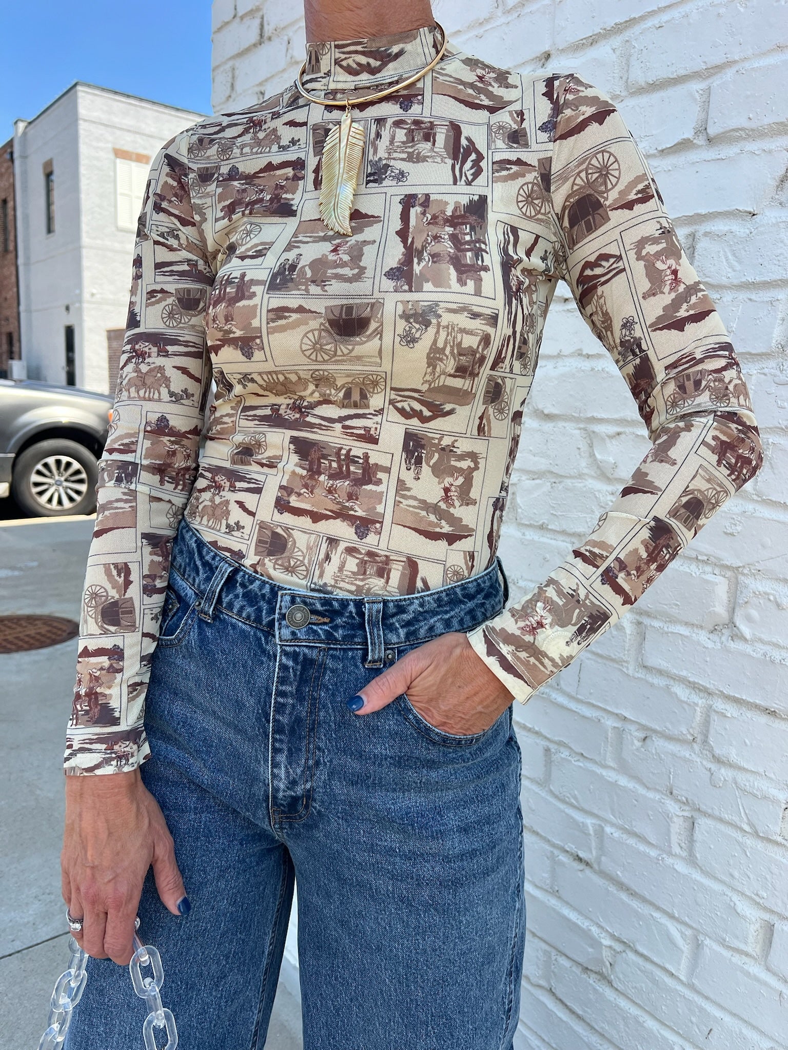 This Sage The Label mesh top features a sepia-toned Western print with vintage-inspired scenes that make it truly unique. Designed with a mock neckline, sheer long sleeves, and a fitted silhouette, it’s an easy piece to tuck into denim or pair under jackets for a standout layered look.