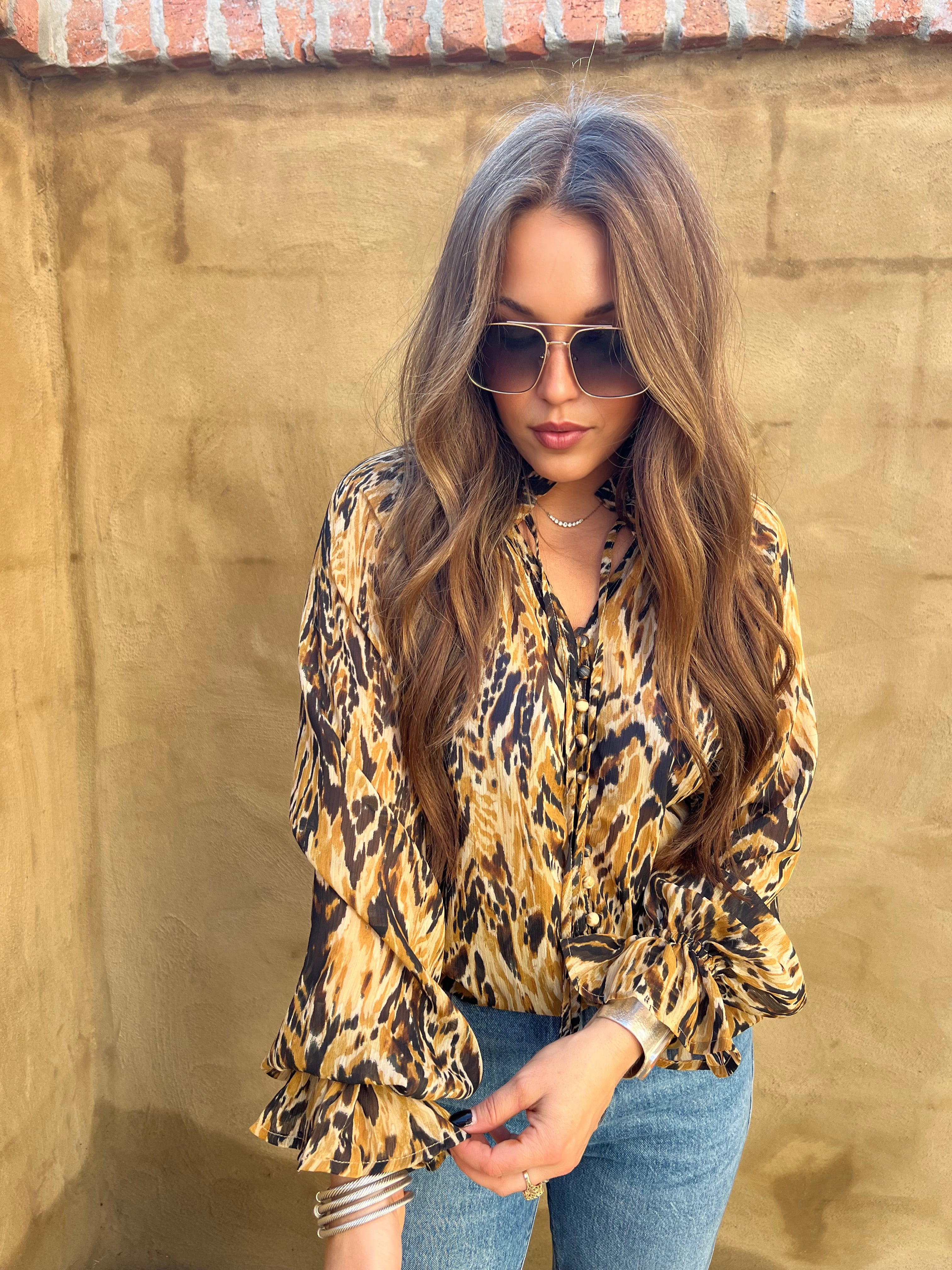 There’s something about this blouse that just moves differently. The Ivy Button Down Blouse brings a warm mix of amber, gold, and onyx tones in a painterly, abstract pattern that feels equal parts wild and refined. The lightweight fabric flows effortlessly with every step, while the delicate fabric-covered buttons and billowy sleeves give it that subtle touch of luxury. The relaxed fit makes it easy to tuck, half-tuck, or wear loose for a more undone feel.