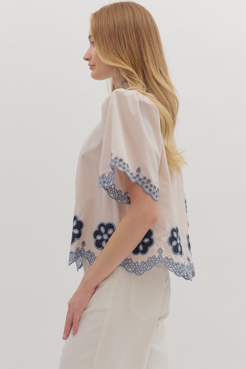 Entro | Elvyn Floral Embroidered Flutter Top Ecru