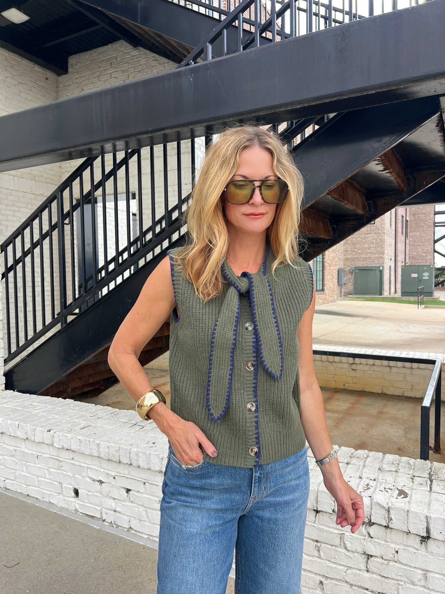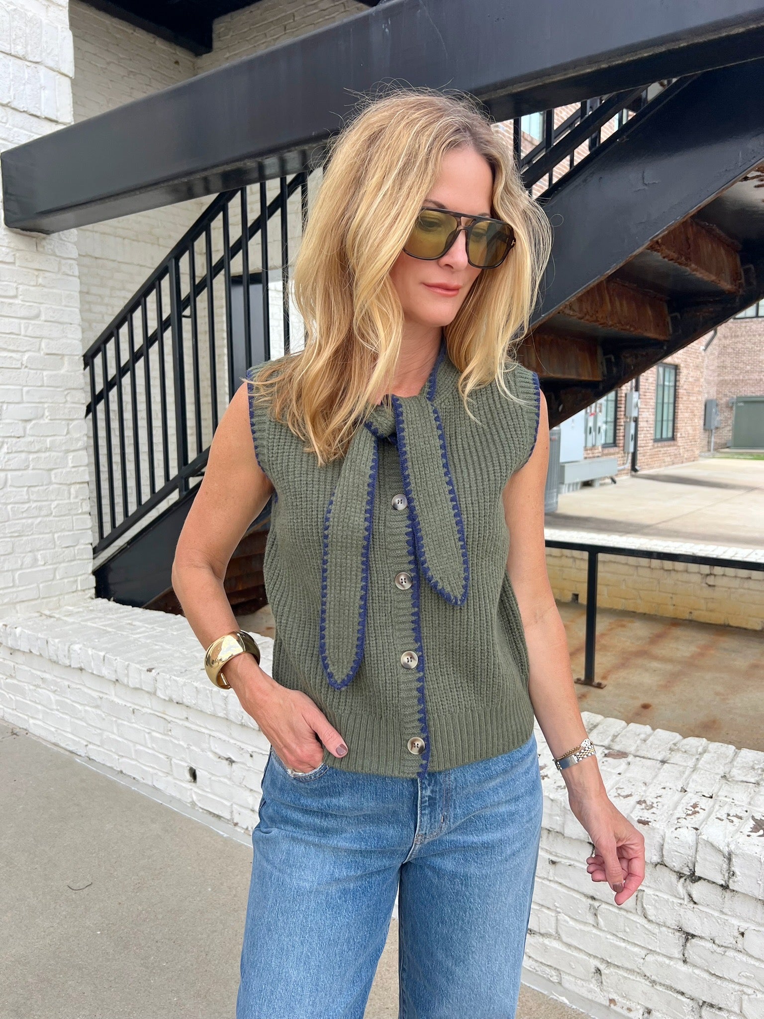 Chic and unexpected 🖤 This sleeveless knit vest features a button-front design, ribbed texture, and contrast stitching that makes the edges pop. The standout detail? A playful tie-neck bow that brings polish with a modern twist. Pair it with denim for a cool casual look or layer it over a crisp blouse for extra sophistication.