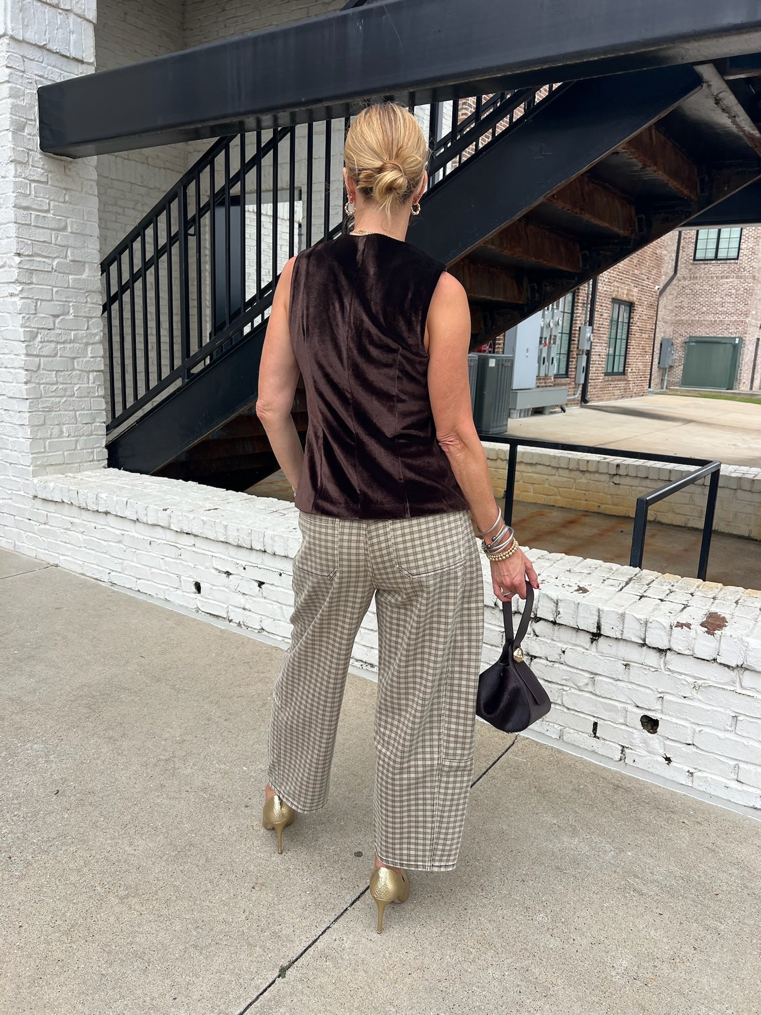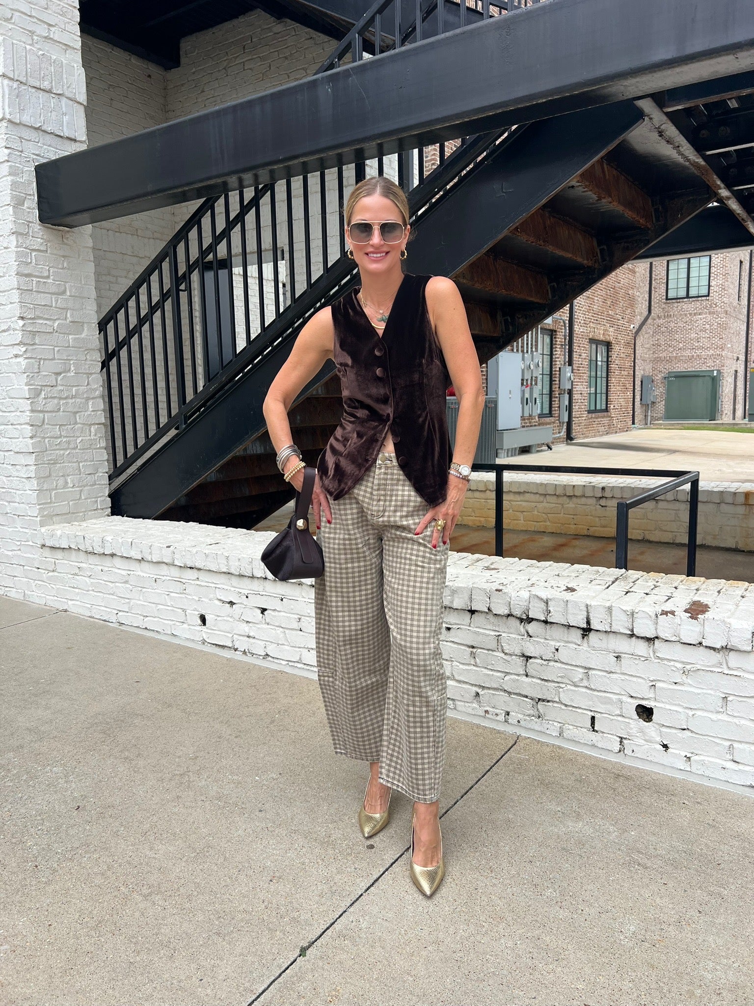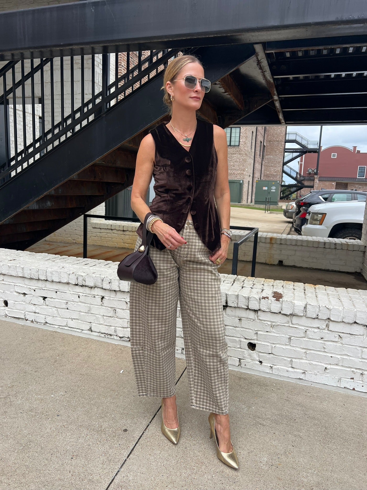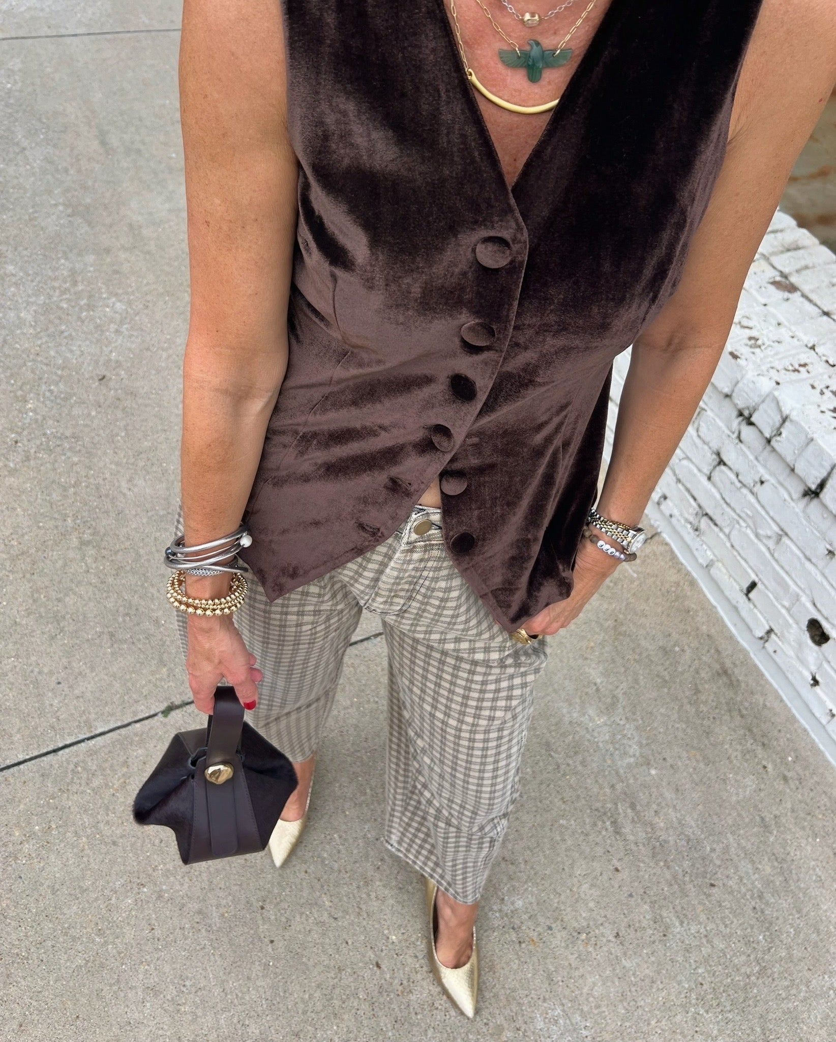 Rich textures meet timeless tailoring. This chocolate brown velvet vest is all about luxe layers with a modern twist. Featuring a flattering V-neckline, bold covered buttons, and an asymmetric hem, it’s the perfect piece to dress up your denim or polish off tailored trousers. The soft velvet adds dimension and depth, while the structured cut keeps the look sharp and sophisticated. Style it solo with statement jewelry or layer it over a crisp button-down when the temps cool off.
