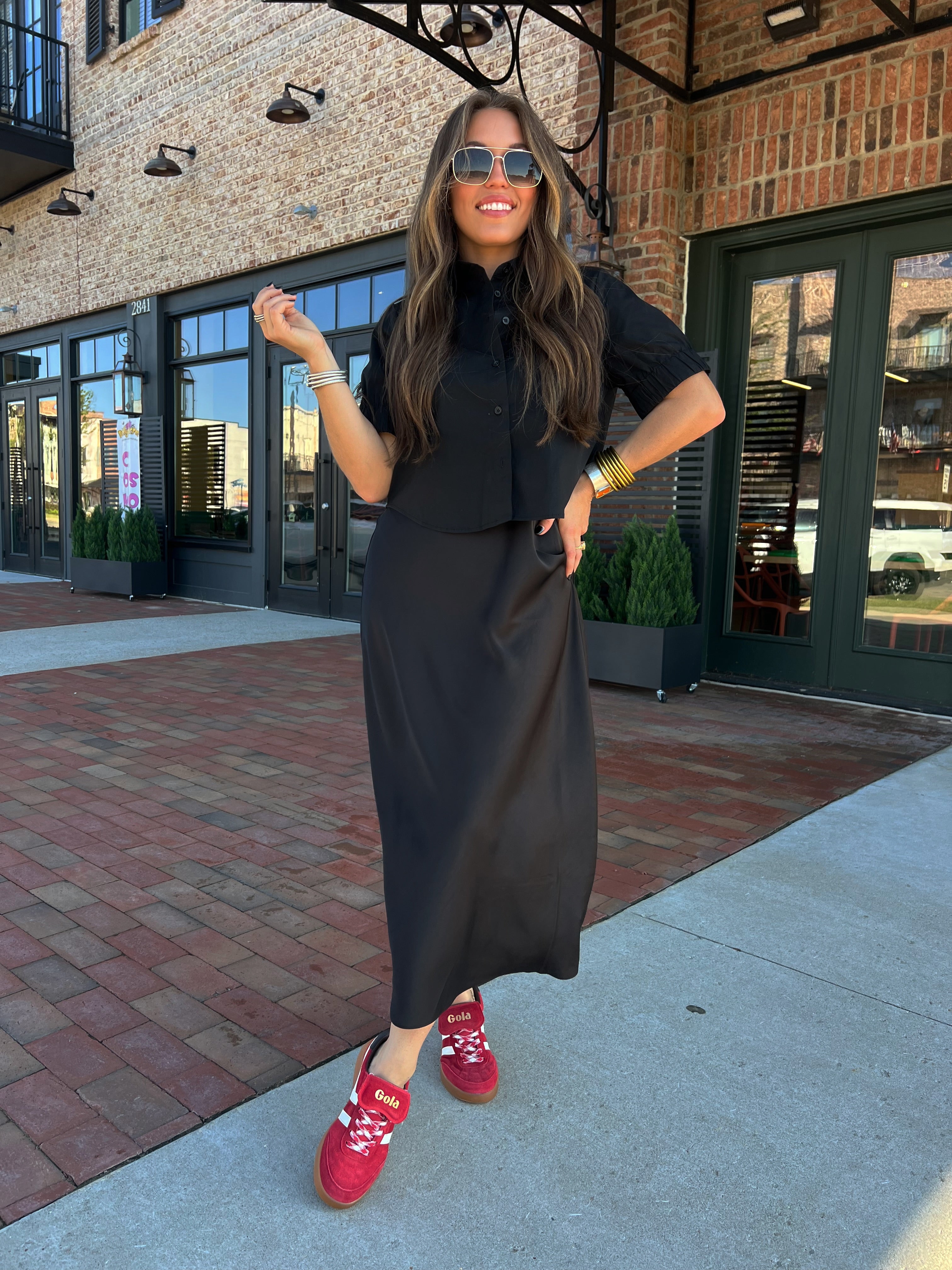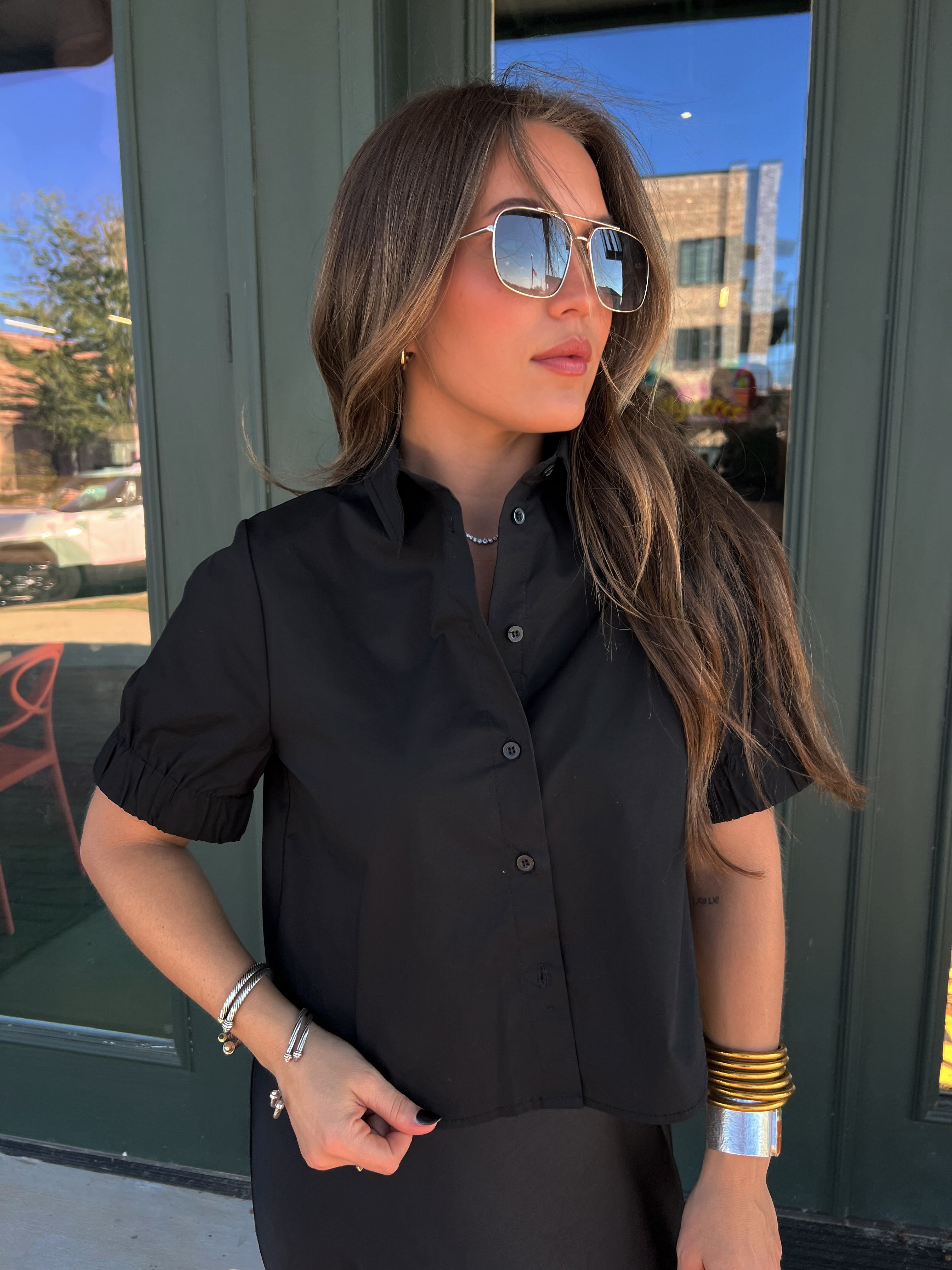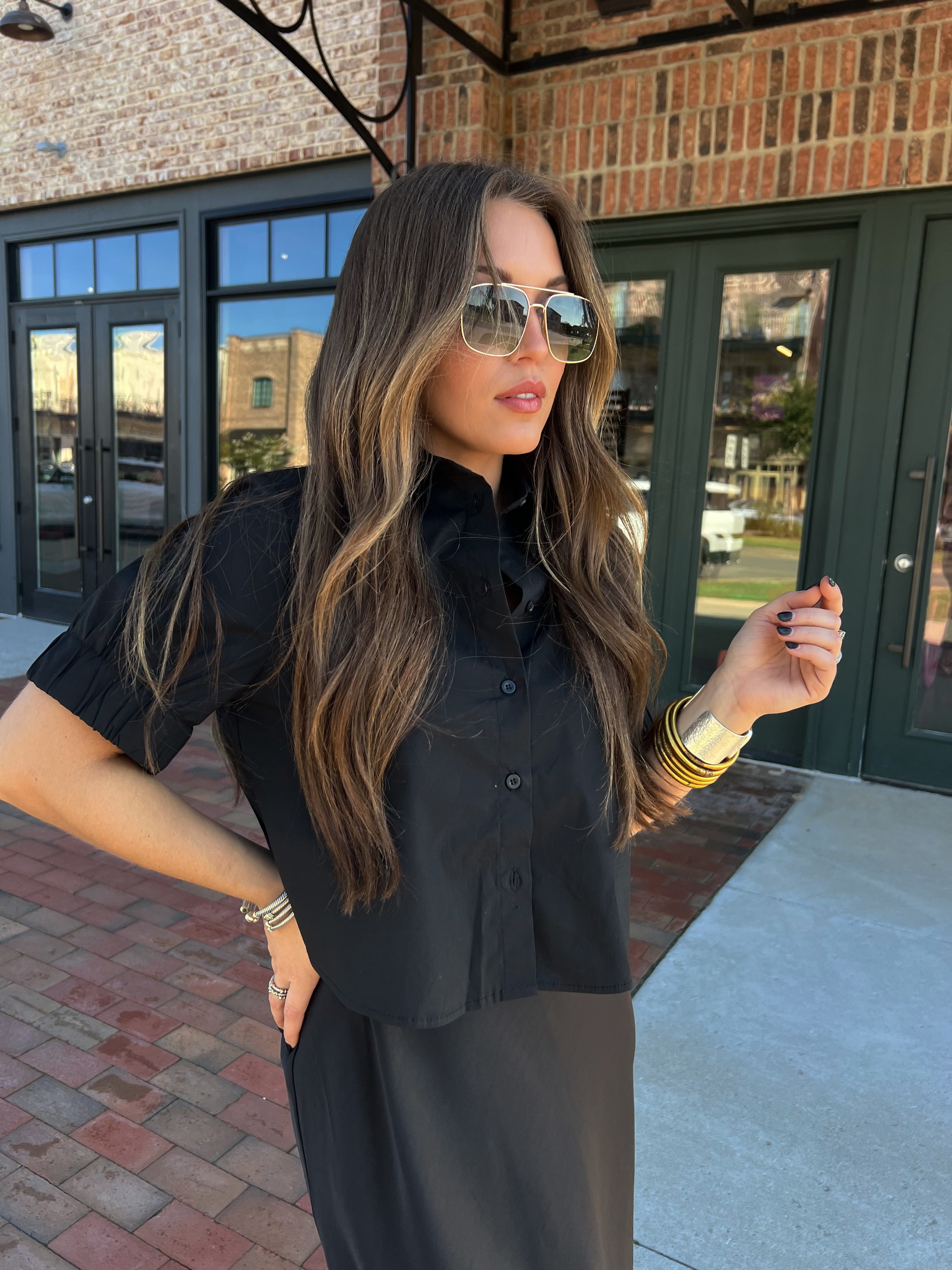 Effortlessly cool and easy to style — this black button crop top adds just the right amount of edge. The collared neckline and structured short sleeves give it a polished vibe, while the cropped length makes it perfect for pairing with high-waisted skirts or denim. A versatile staple that can take you from coffee runs to dinner plans in seconds.