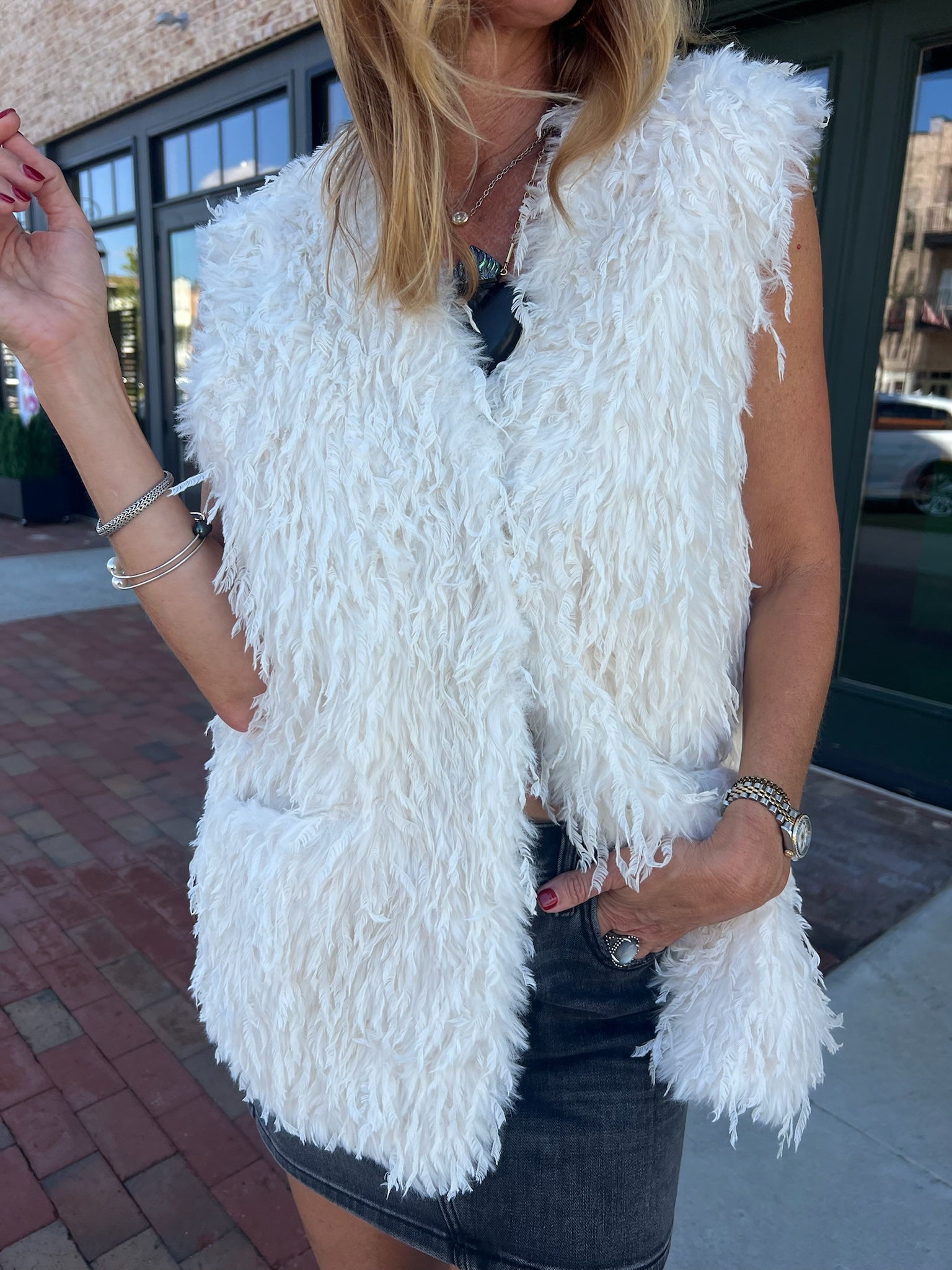 Get cozy and stylish this season with the Trailblazer Fringe Fur Long Vest! Made from 100% polyester faux fur and lined for comfort, this white vest brings warmth and flair to any outfit. Perfect for adding a playful touch to your outerwear collection, and is designed for women who love chic layering, and it’s a fun way to stand out while staying snug!