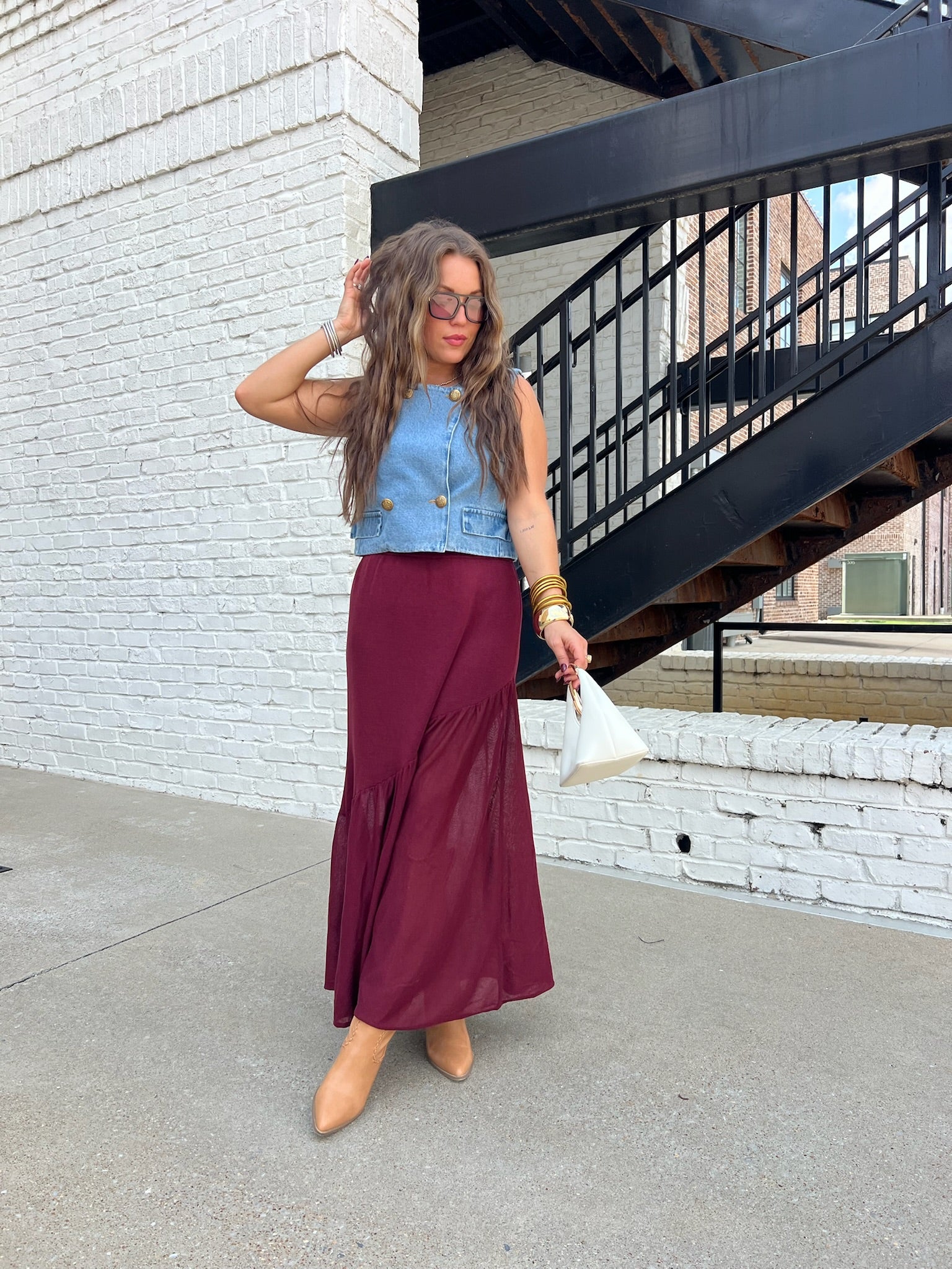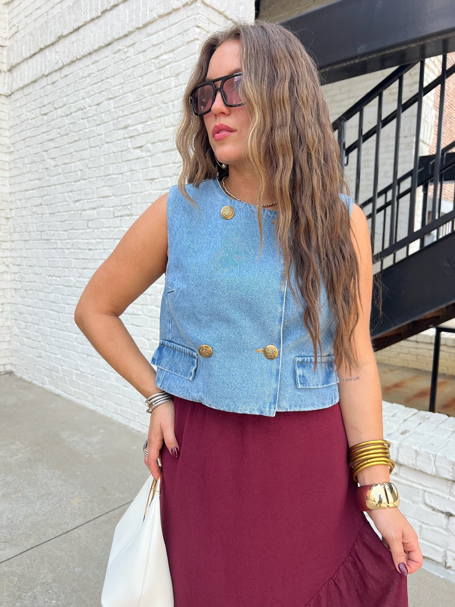 Structured yet chic—this denim vest features gold button detailing, a cropped cut, and a double-breasted silhouette that gives it a tailored finish. Perfect for layering over blouses, pairing with skirts, or styling solo for a modern edge, it’s the kind of versatile piece that makes your outfit feel instantly put-together.