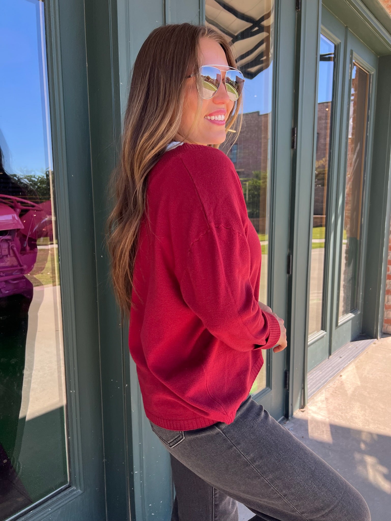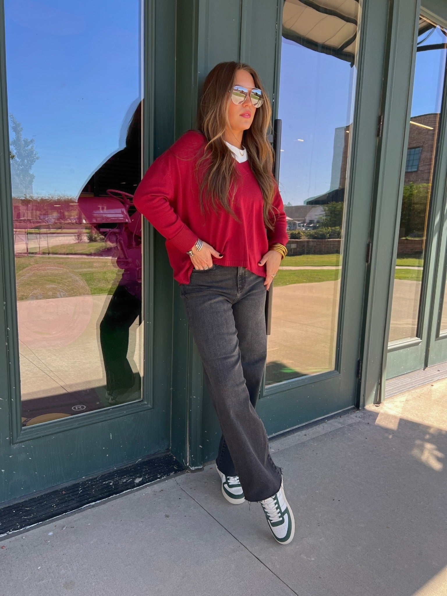 A timeless essential with endless layering potential. The Betuala Sweater features a relaxed V-neck silhouette in a rich crimson hue that adds instant polish. Crafted from a soft, mid-weight knit, it’s ideal for styling solo or layered over a crisp white crewneck for that effortless, preppy vibe we love.