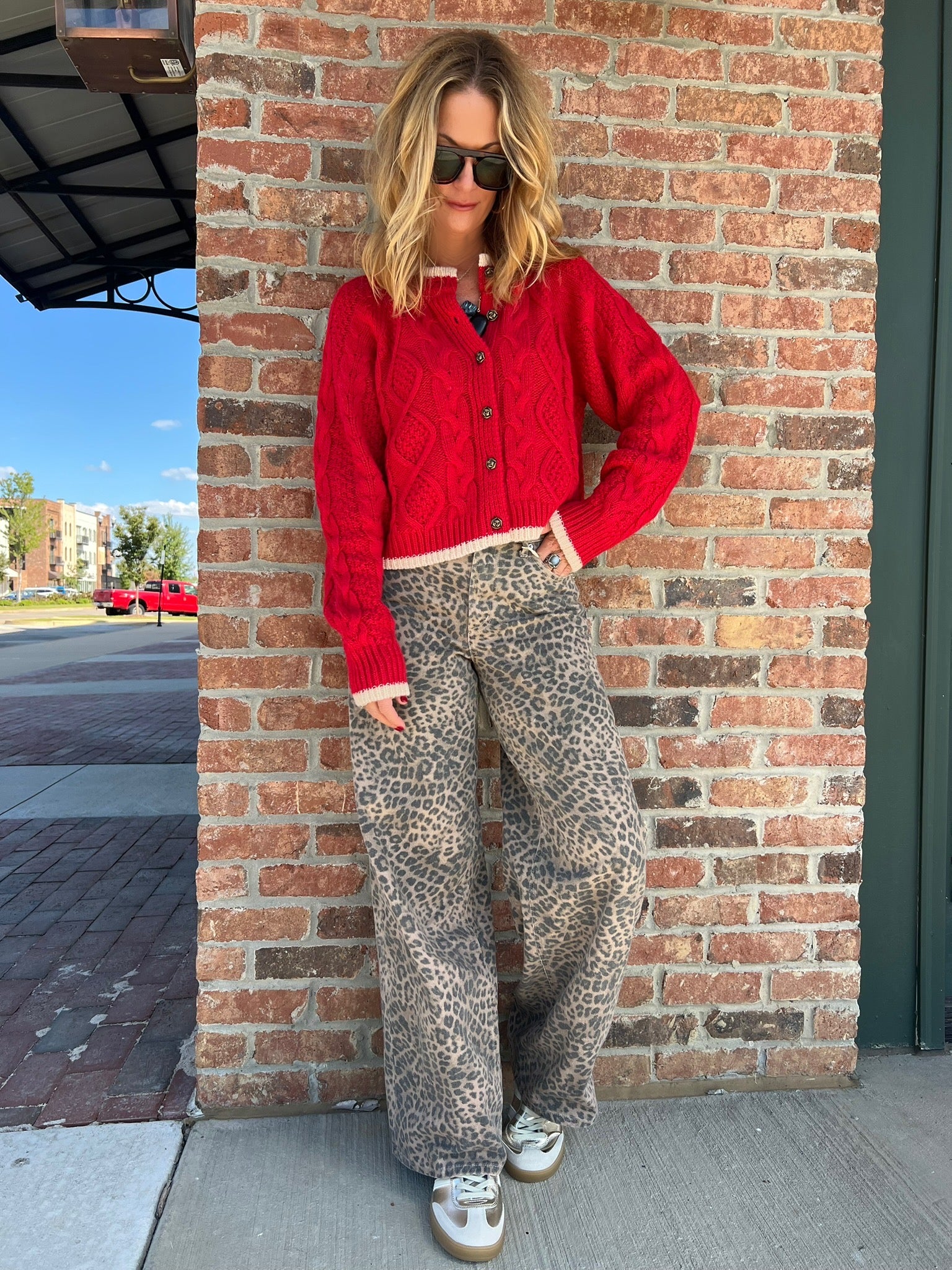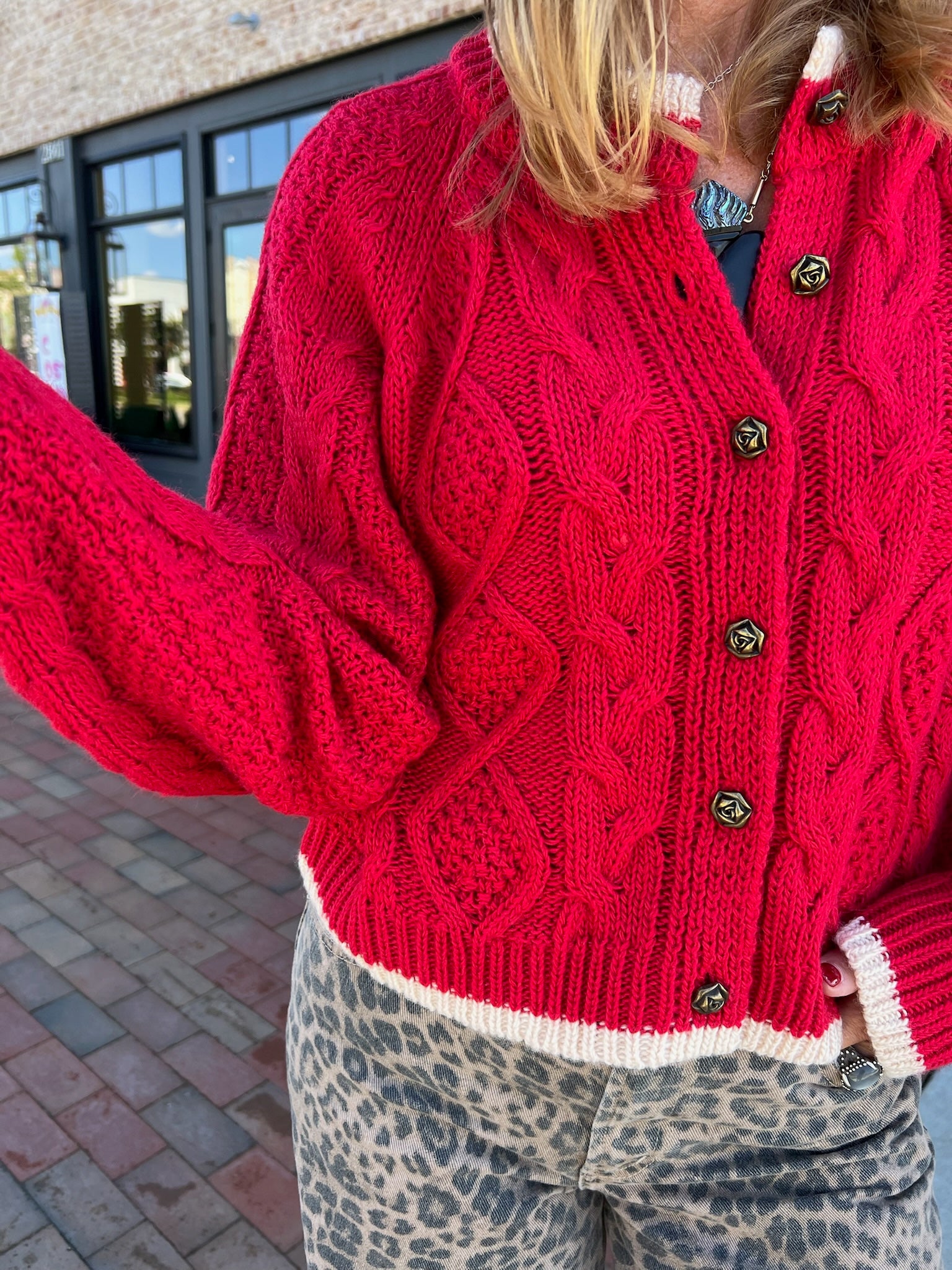 A pop of color you’ll reach for all season — this red cable knit cardigan is a statement layer with timeless charm. Featuring chunky cable stitching, contrast cream trim, and button-front closure, it’s perfect worn open over a tee or buttoned up with denim for a festive, cozy finish.