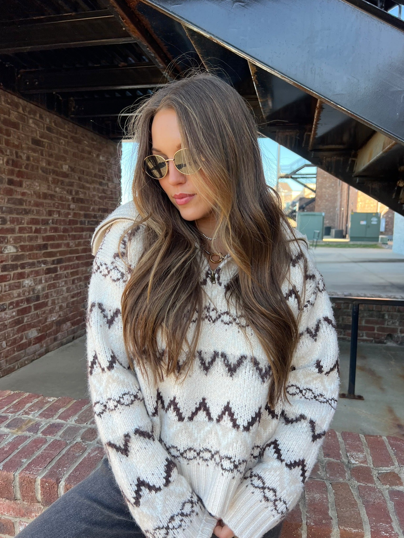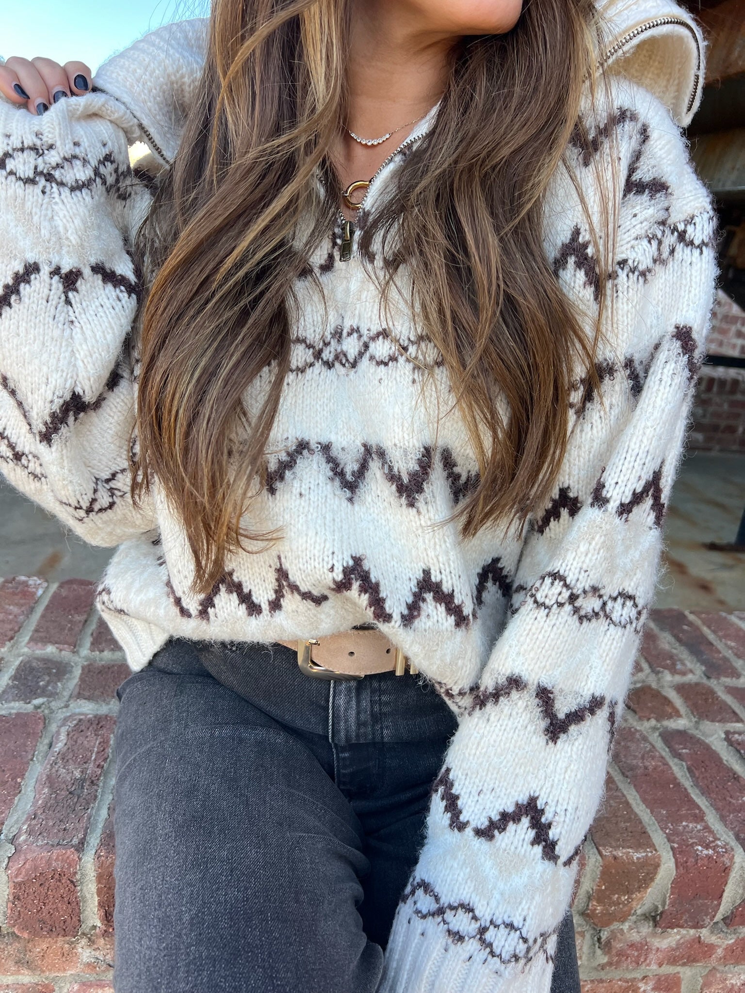 Stay cozy and chic with this Fair Isle half-zip sweater. Featuring a soft cream base with bold black patterning, a ribbed hem, and a functional half-zip neckline, it’s the perfect cold-weather staple. Style it zipped for warmth or open for a laid-back layered look.