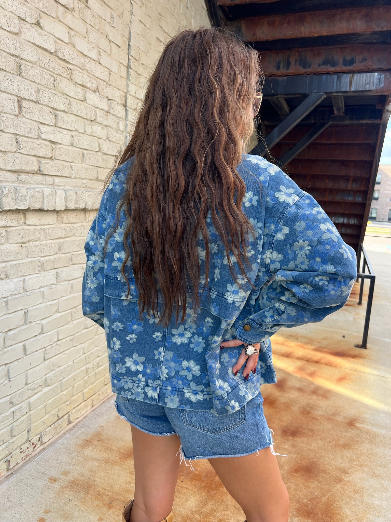 A playful twist on a classic—this medium wash denim jacket is scattered with allover floral print for a fresh, fun update. Finished with a corduroy contrast collar, button-front closure, and roomy pockets, it’s the ideal layering piece for your fall wardrobe. Pair it with denim, skirts, or dresses for a laid-back cool vibe.