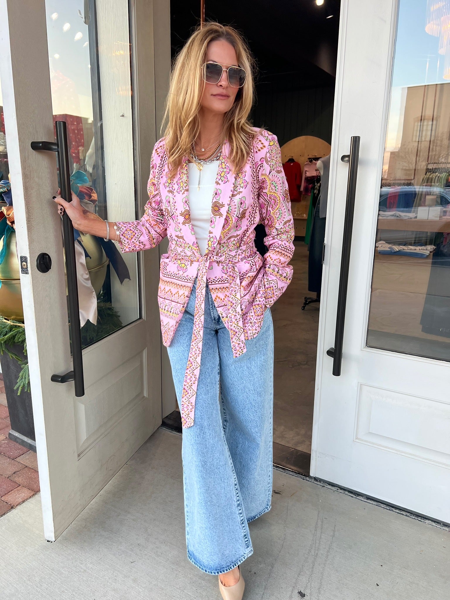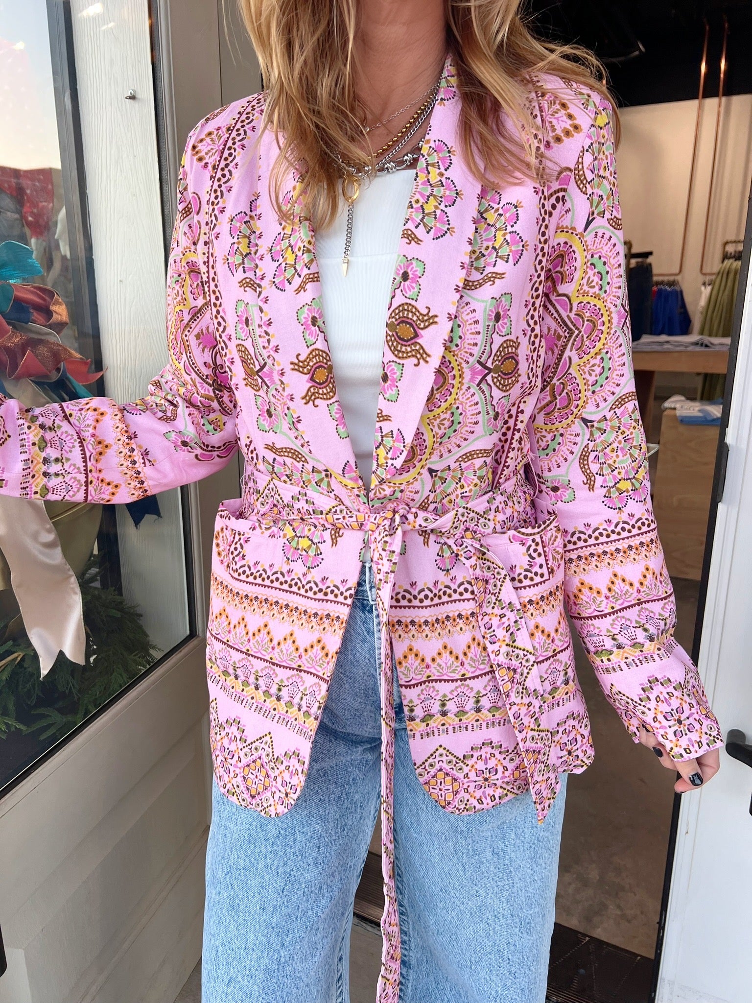 Bold but beautifully wearable, this printed blazer is a standout layering piece with a polished edge. Designed in a vibrant pink palette with intricate patterning throughout, it features a tailored silhouette, classic lapel, and a removable self tie belt that defines the waist just enough. The lightweight feel keeps it comfortable, while the statement print brings personality to even the simplest outfit.