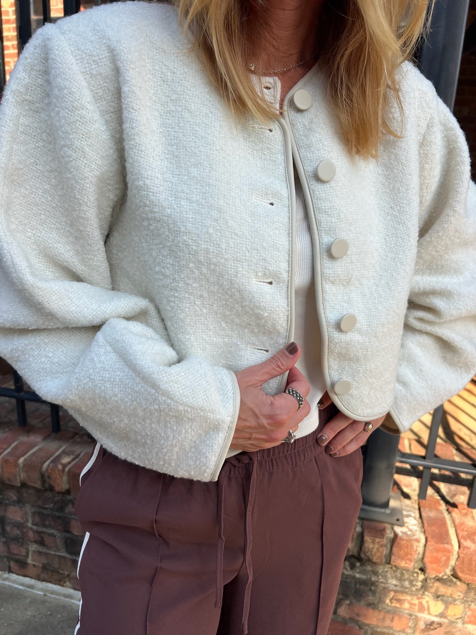Make a stylish statement with the Steve Madden Emili Jacket in Cream. Featuring playful bubble sleeves and classic button-up tailoring, this long-sleeved jacket blends comfort with a modern twist. Perfect for adding a fun, refined touch to both your work and casual looks.