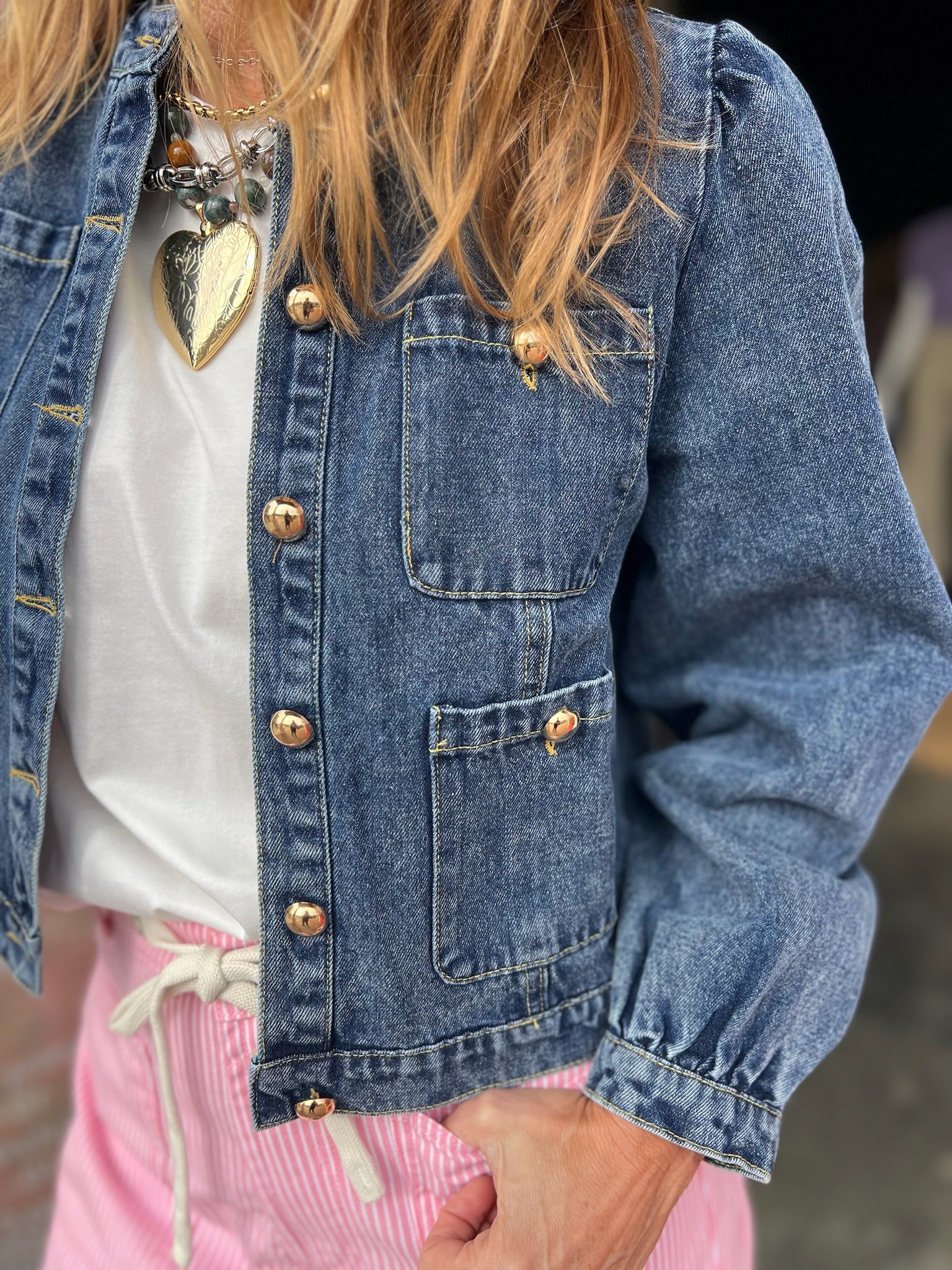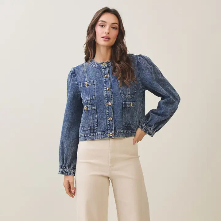 This denim jacket features a tailored silhouette with gentle volume through the sleeves and a clean, collarless neckline that feels modern and polished. The slightly cropped length works beautifully with high-rise denim, trousers, or layered over dresses. Finished with a full button front and subtle seam detailing, it offers structure without feeling stiff, making it an easy layer for everyday wear. We would wear this to work, church, brunch, or casual dinners when you want something pulled together but effortless.