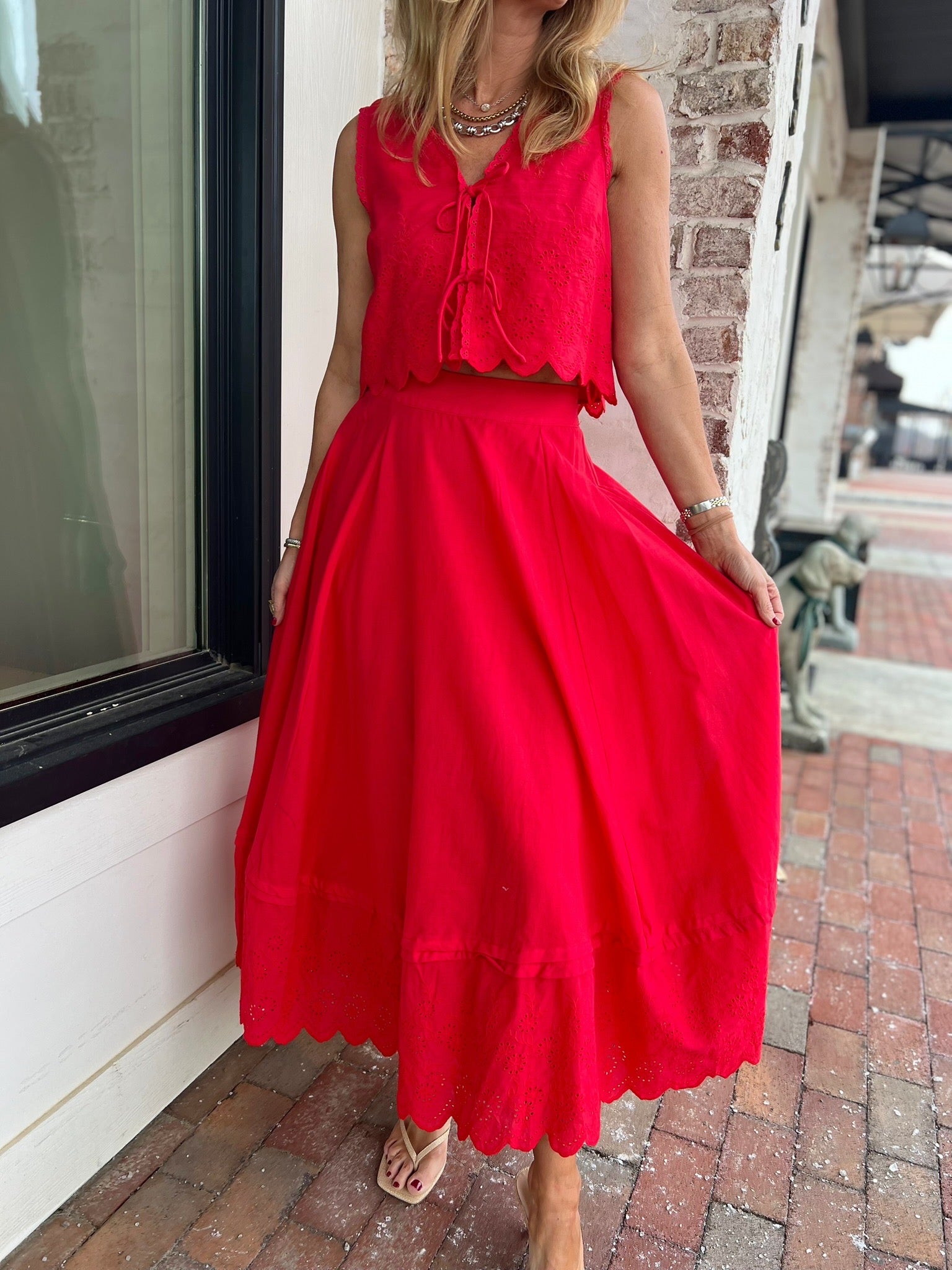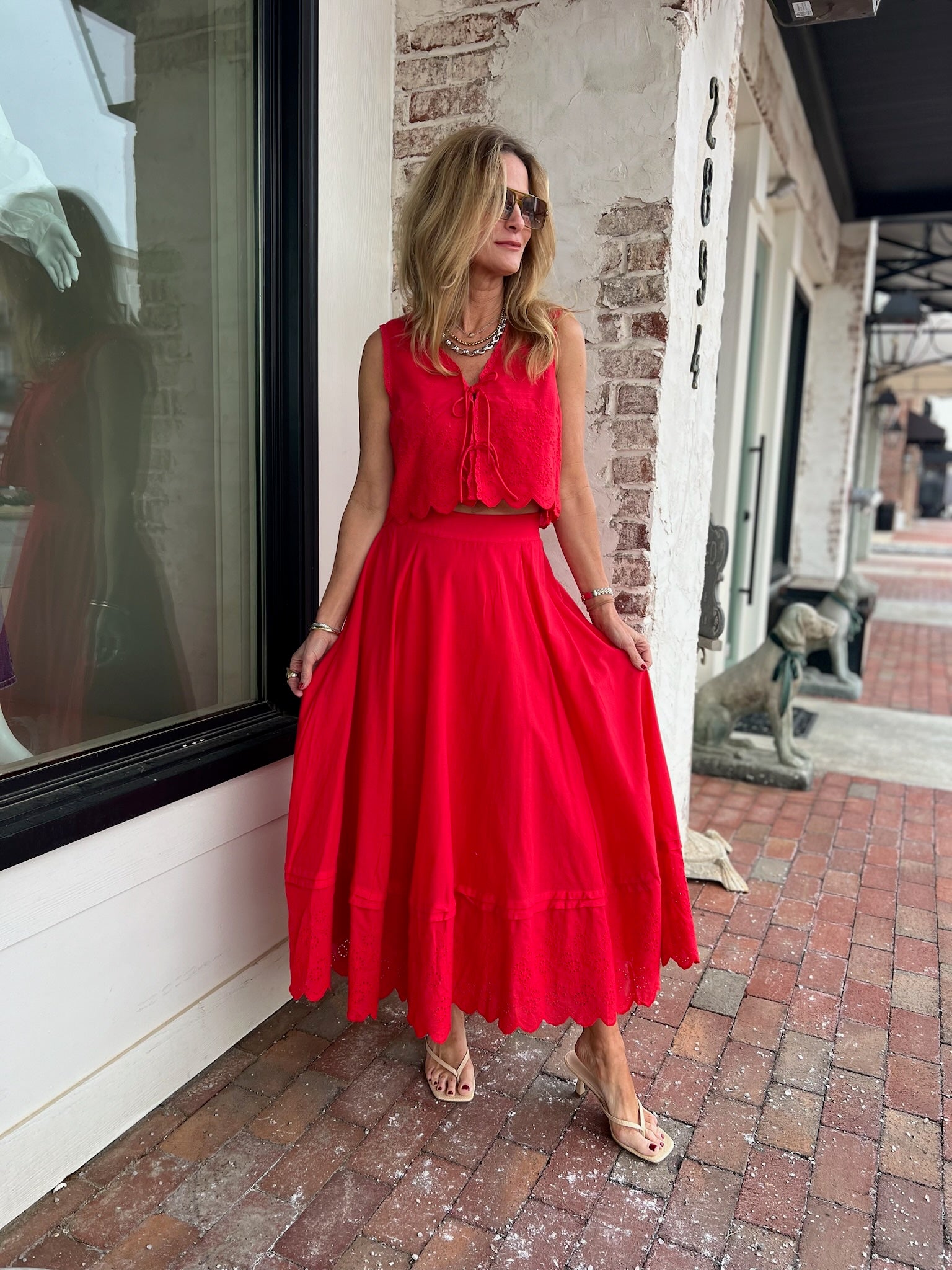 This red two-piece set is the perfect blend of romantic detail and easy wearability. The cropped sleeveless top features delicate eyelet embroidery, scalloped edges, and adjustable front ties that give it a soft, vintage-inspired feel. The matching midi skirt flows beautifully with subtle volume and finishes with a scalloped, eyelet-trimmed hem for a polished touch. The monochrome red makes it feel confident and statement-making while still staying timeless.
