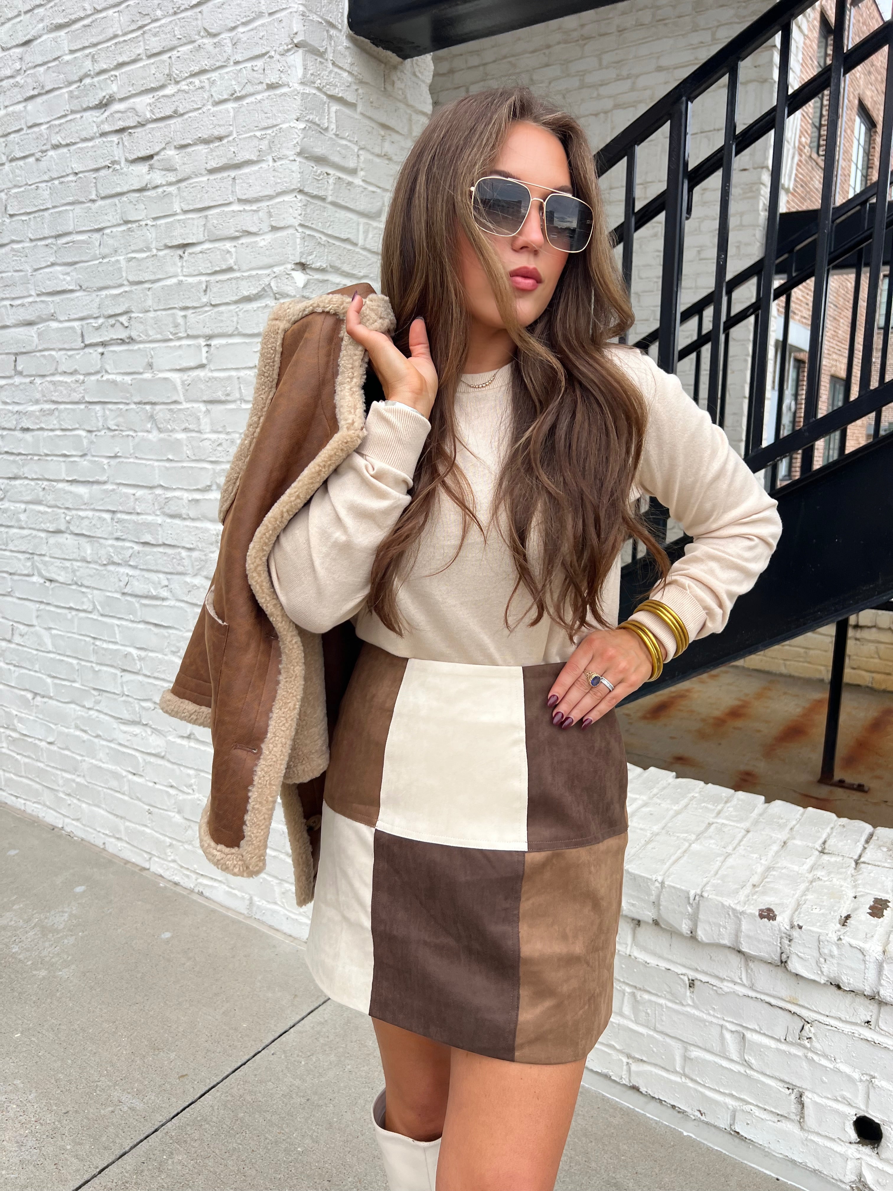 Retro-inspired and ready to wear—this mini skirt features a suede patchwork design in warm neutral tones. The straight fit makes it easy to pair with chunky knits, fitted tops, or boots for a cool girl fall vibe.