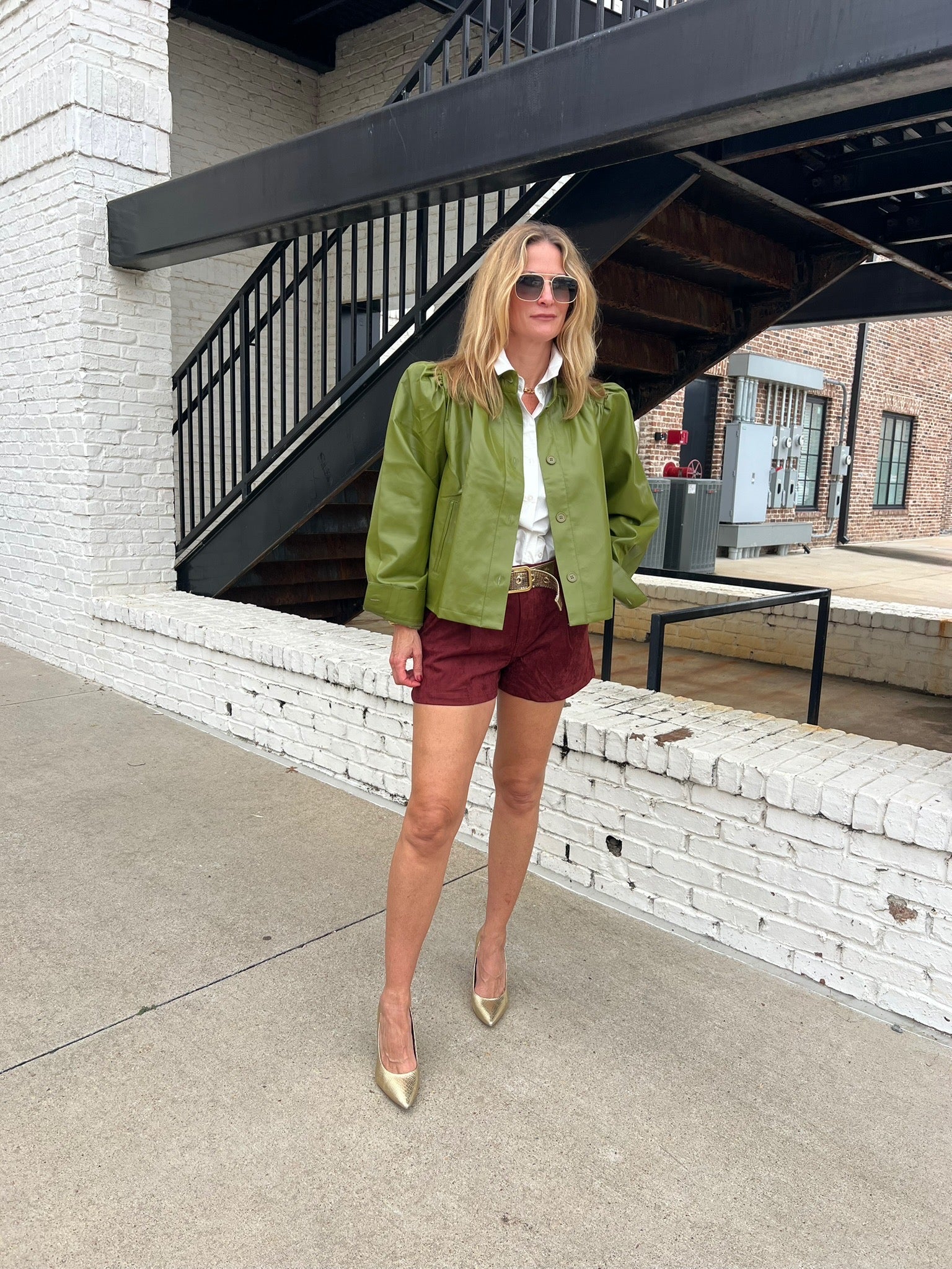 Polished yet easy to wear, these wine suede pleated shorts are the perfect match to their coordinating jacket or a standout on their own. Featuring a high-rise waist with belt loops, side pockets, and soft pleating through the front, they deliver a flattering fit with a touch of sophistication. Style them with a tucked-in blouse, a casual tee, or the matching jacket for a full chic set.