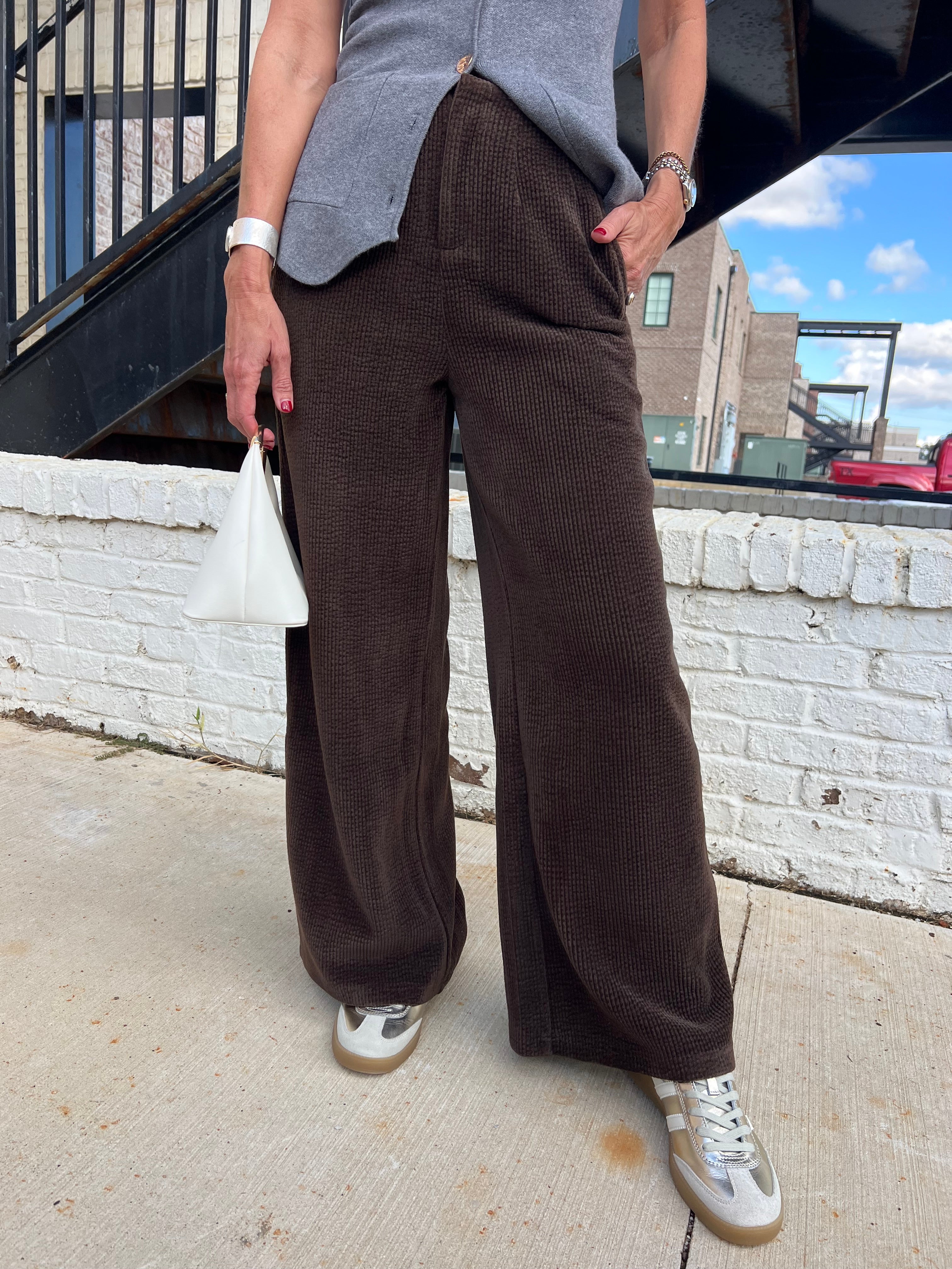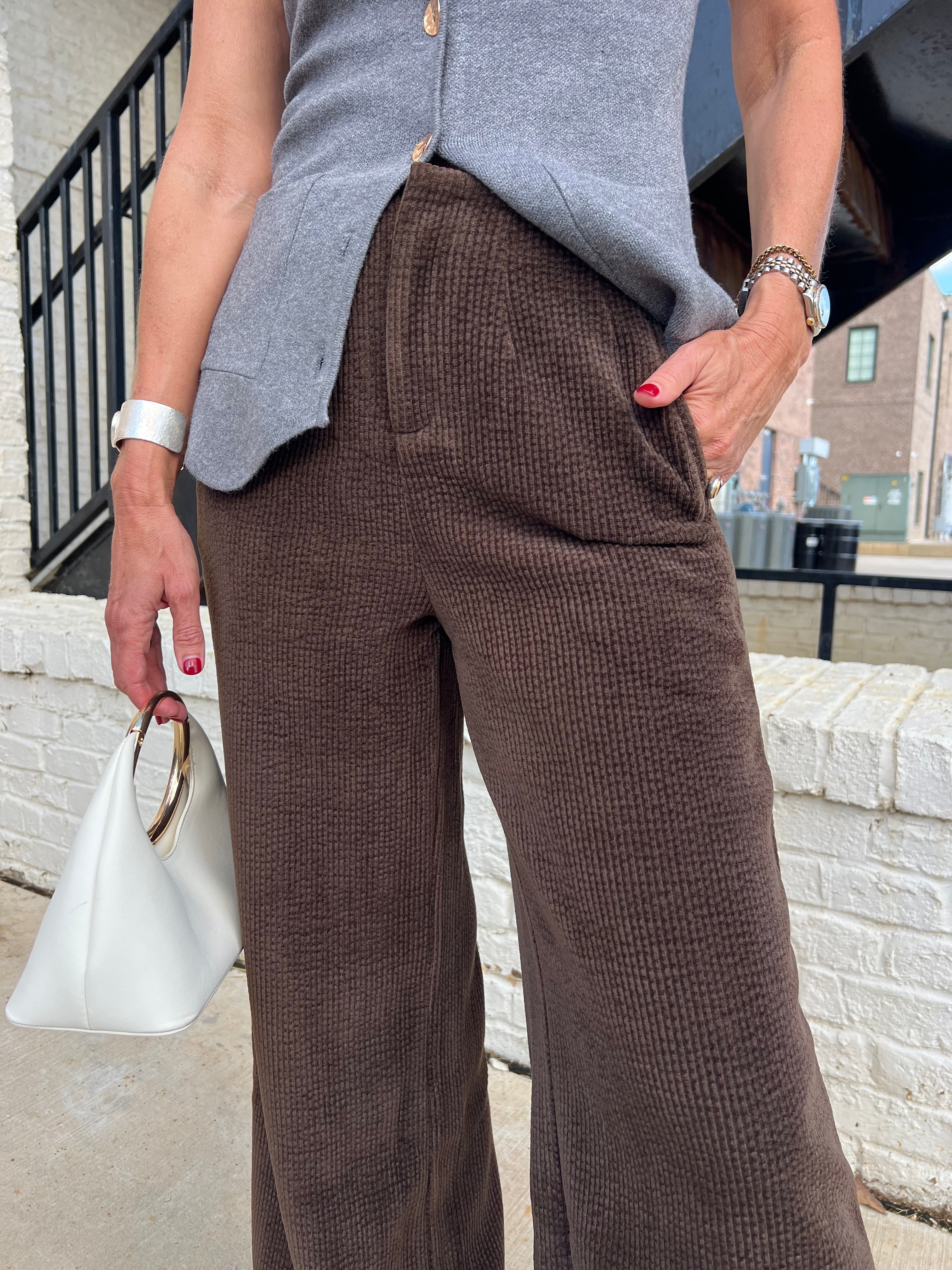 Effortlessly chic with a touch of vintage charm — these chocolate corduroy wide leg pants are a fall favorite. The soft ribbed texture and high-waisted fit make them as flattering as they are comfortable. Designed with subtle front seams and a flowy leg for that perfectly relaxed yet tailored silhouette.