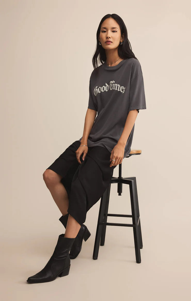 Pair it with a fitted top, chunky sweater, or a matching black crop button down (shown here) for a chic coordinated look.