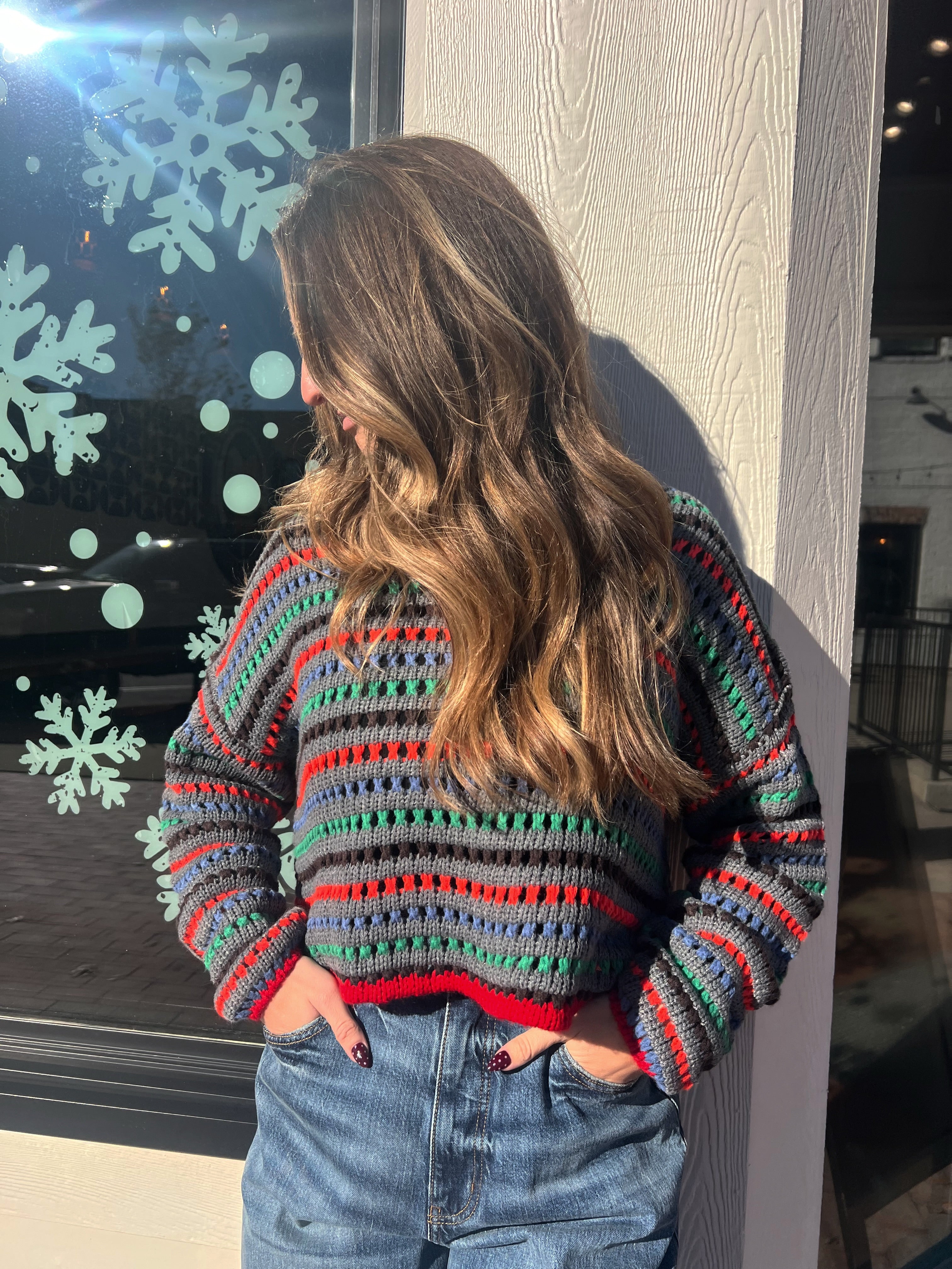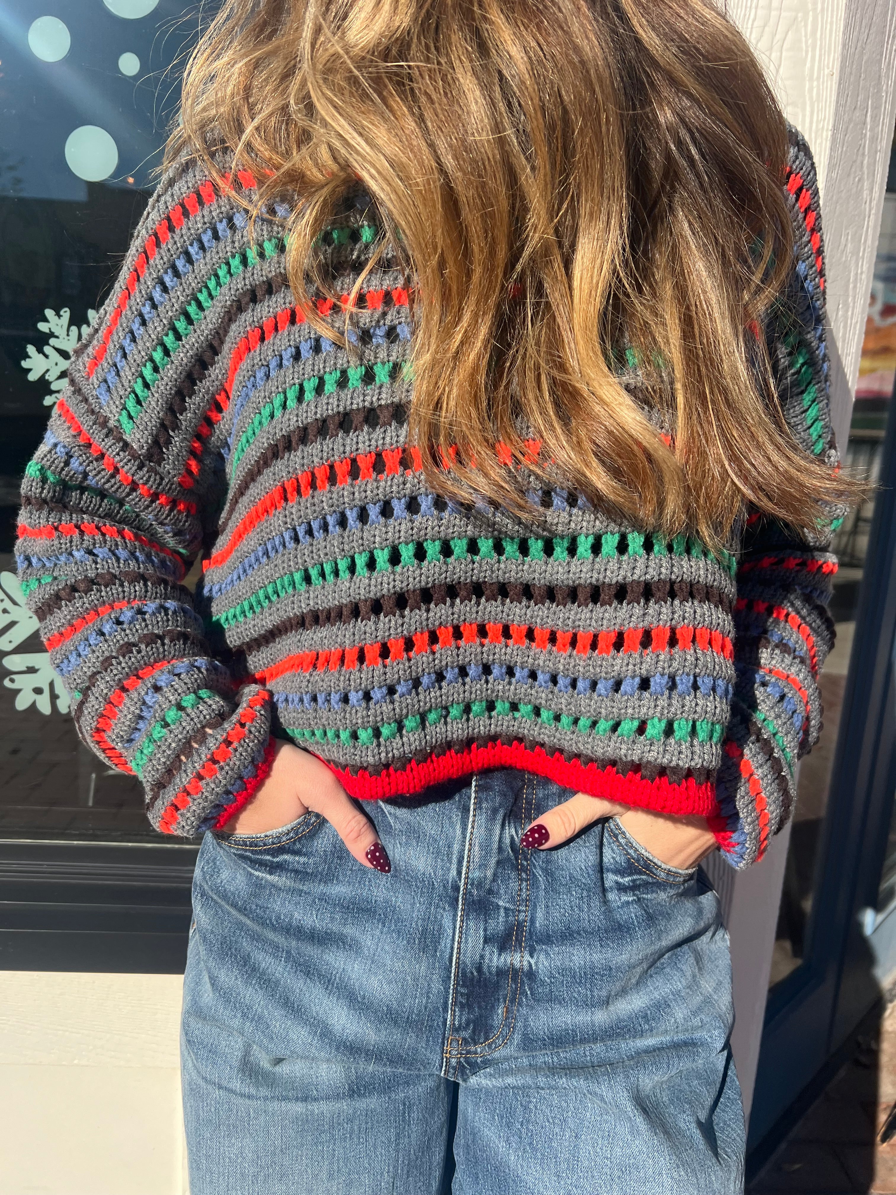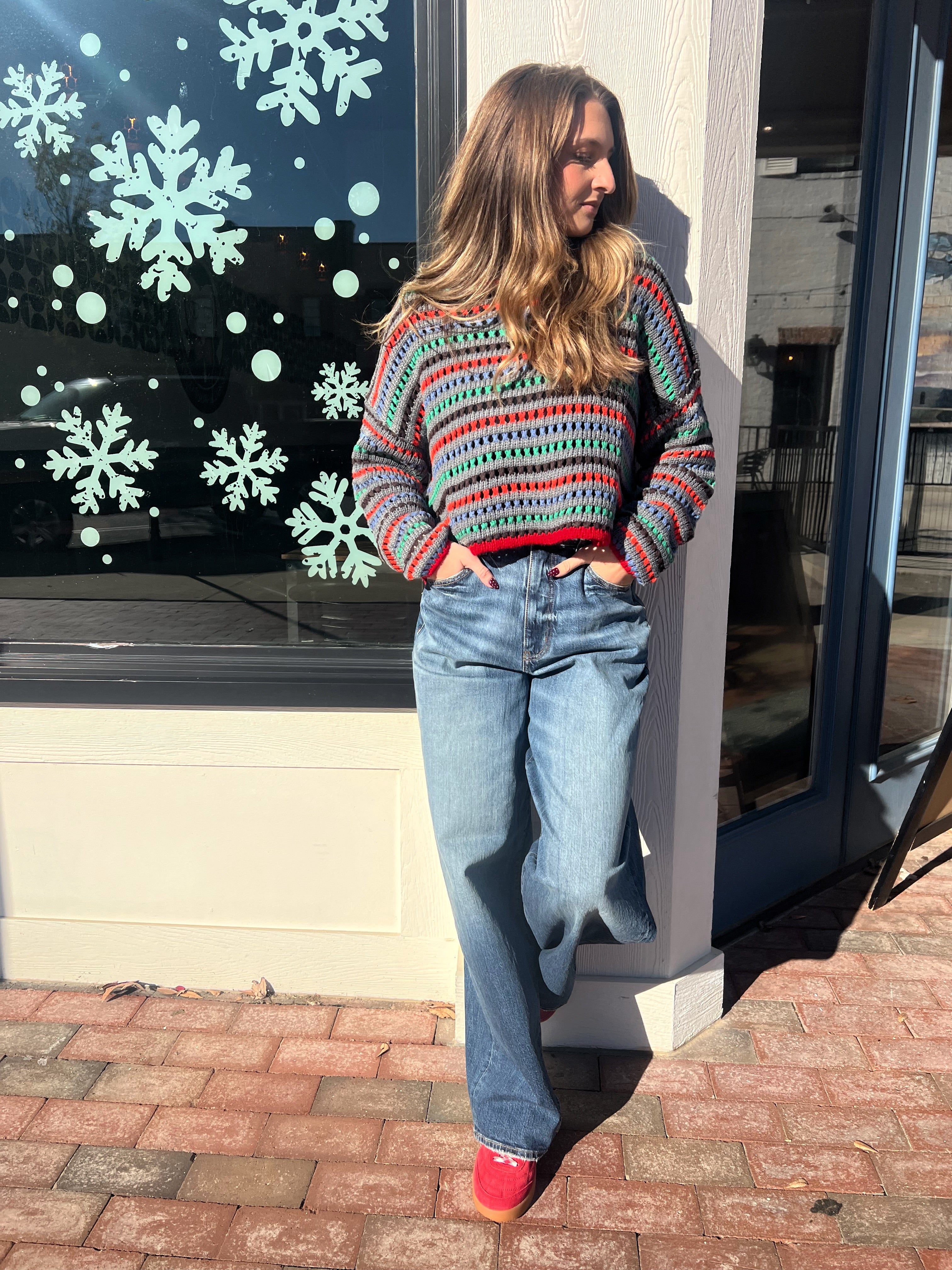 Designed for standout charm, this oversized sweater features a multi-stripe pattern, adding a vibrant touch to your wardrobe. Perfect for layering over fitted jeans or sleek leggings, it ensures comfort and style in cooler weather or casual outings. Match with ankle boots and a statement handbag for an elevated look.