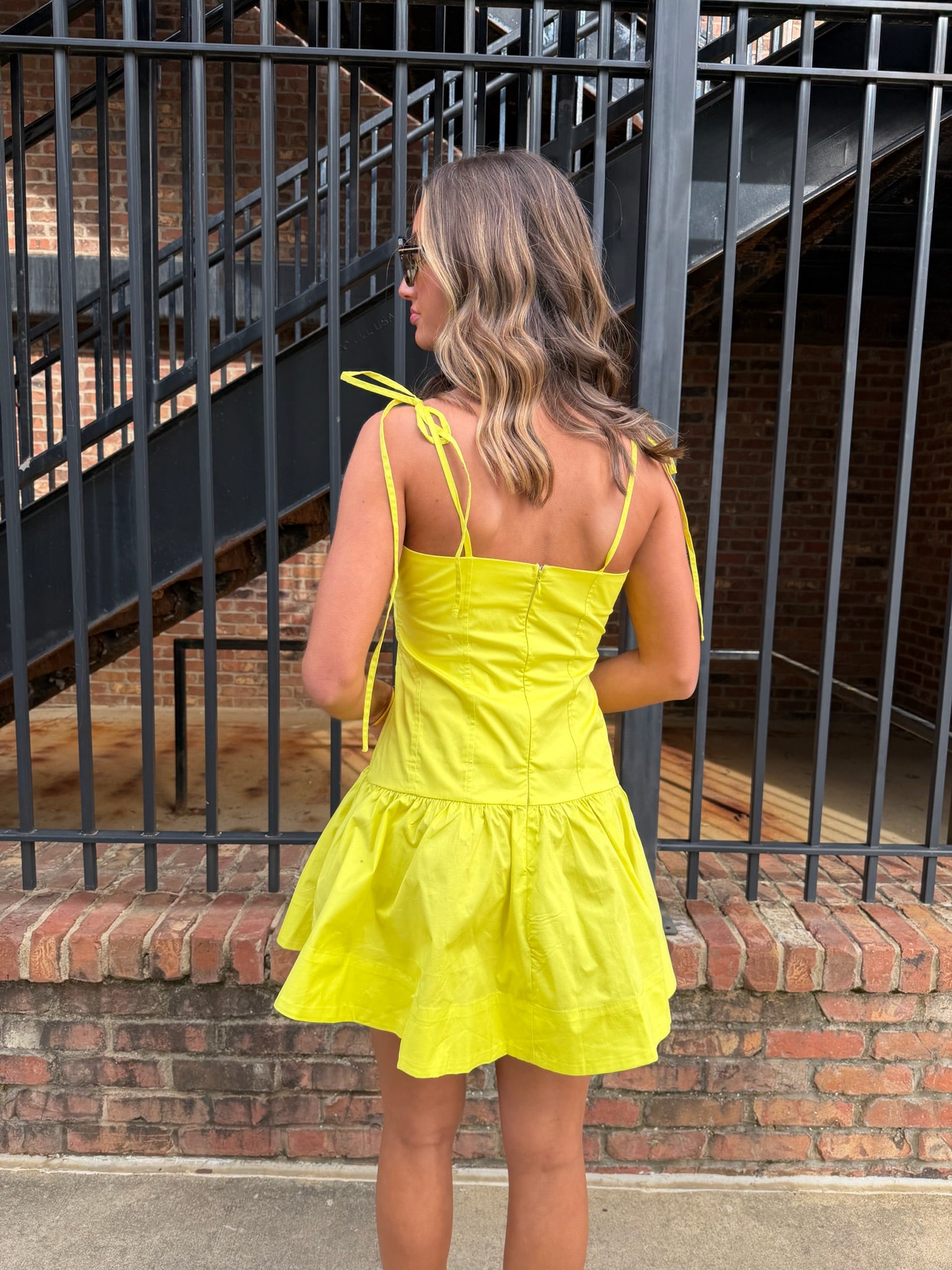 This mini dress features a fitted bodice with delicate strap details and a flared ruffle hem that gives it movement. The color does all the talking here, making it a true statement piece.