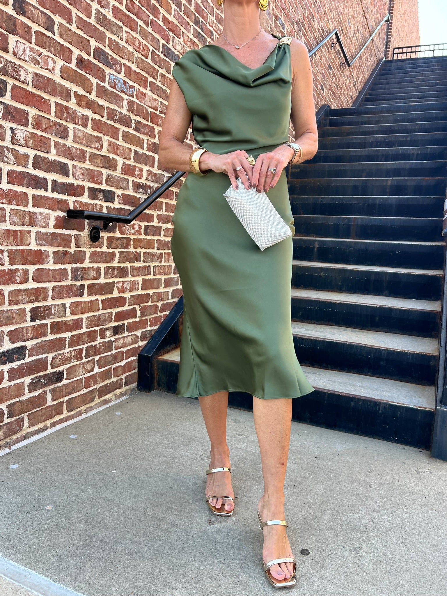 Chic and timeless, this olive satin midi dress is designed with a draped cowl neckline and adjustable shoulder ties for an elegant touch. The sleek silhouette skims the body while the midi length makes it perfect for weddings, cocktail parties, or holiday dinners. Pair it with heels and statement jewelry for an effortlessly refined look.