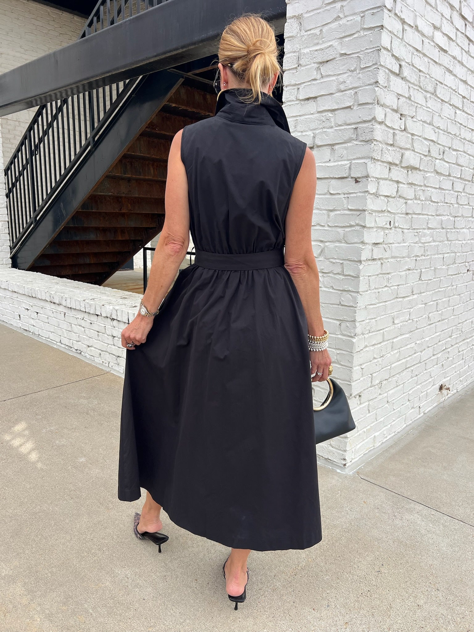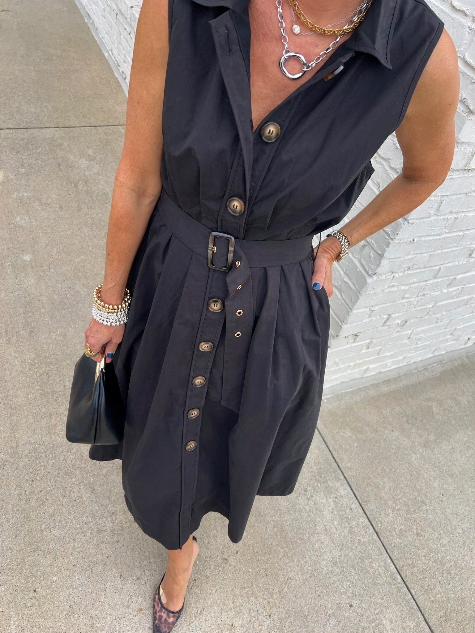 From daytime polish to evening sophistication, this sleeveless midi dress knows how to do it all. The crisp black fabric shapes a collared neckline, button-front detail, and a waist-defining belt that flatters every curve. The full A-line skirt gives it movement, while the structured fit keeps it effortlessly chic. Perfect with heels for a night out or styled with sneakers and a tote for a modern street look.