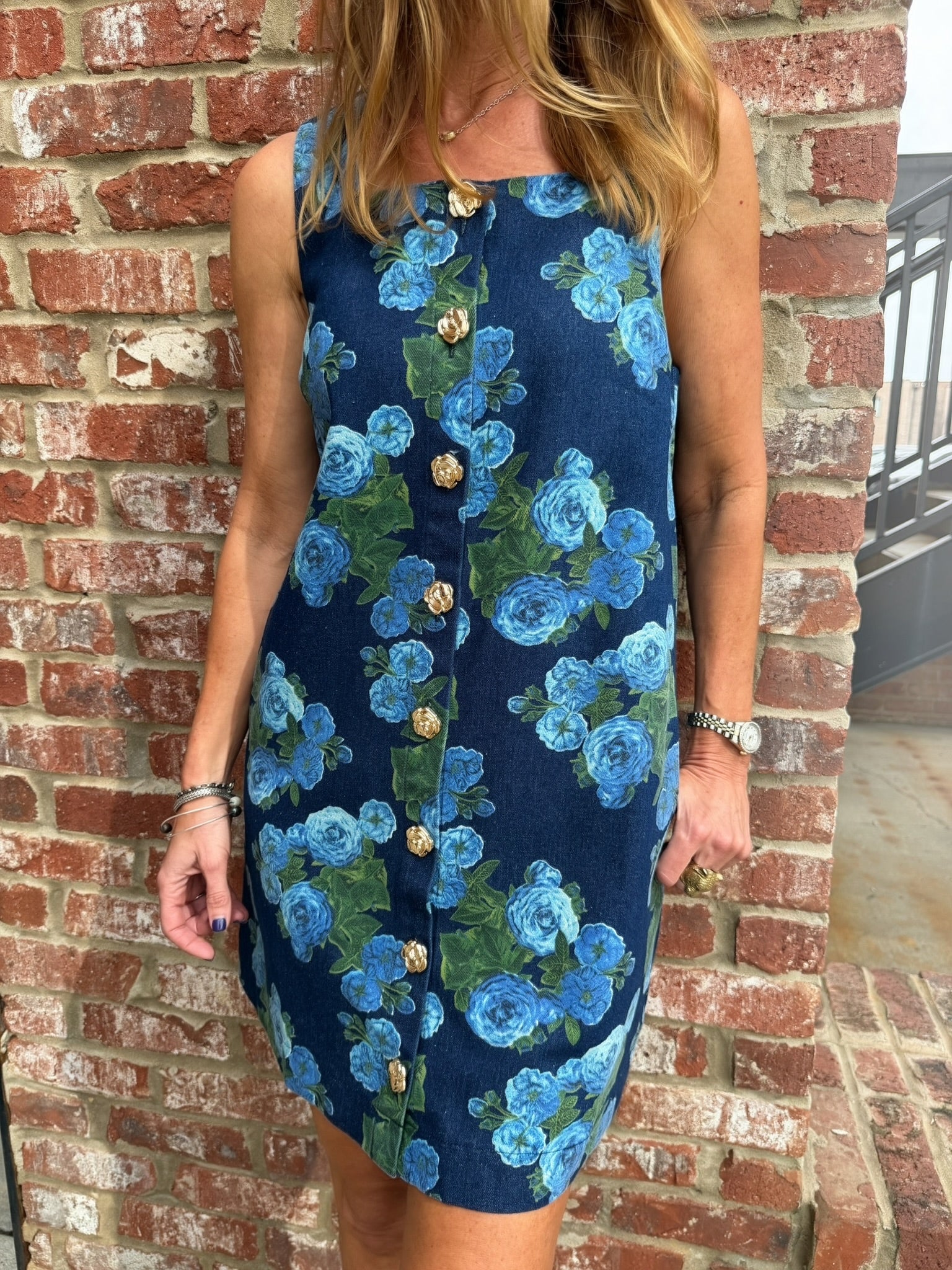 Rich color and bold florals give this dress a striking, polished look. The Geranium Blues Denim Dress features a deep navy base with vibrant blue floral prints that create beautiful contrast throughout the piece. The sleeveless silhouette keeps the look clean and structured, while the gold statement buttons down the front add a touch of classic detail.