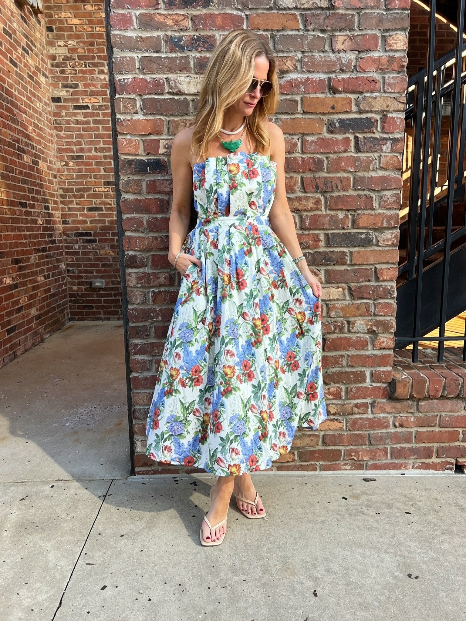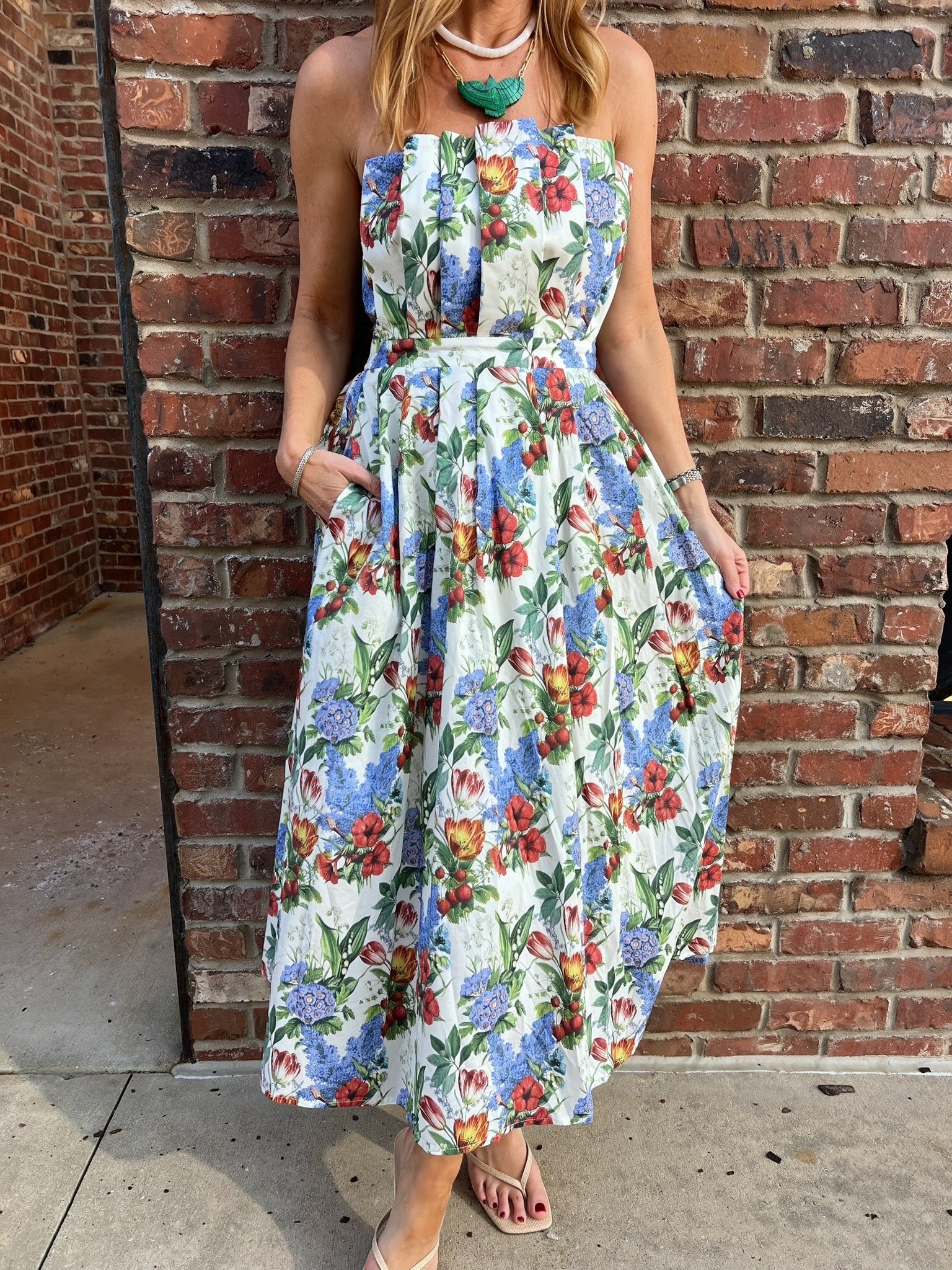 Effortless elegance meets spring style with The Gardens Midi Dress. This strapless stunner features a charming pleated front that flatters your silhouette, while the smocked back with zipper closure adds a touch of sophisticated detail. Whether you're attending a garden party, brunch with friends, or a special celebration, this versatile midi dress transitions seamlessly from day to night. The perfect companion for all your spring adventures.