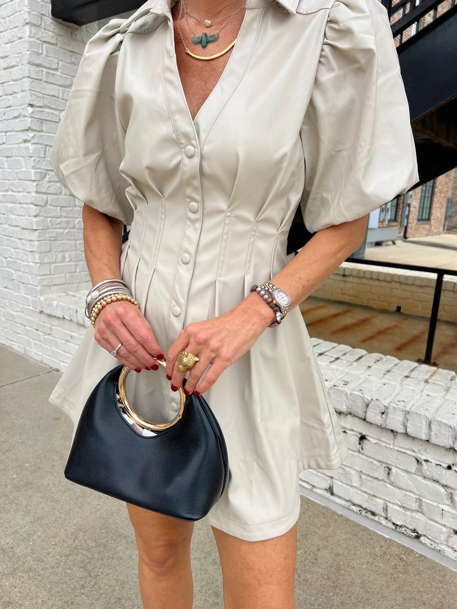 Bold yet polished, this cream faux leather dress is designed with dramatic puff sleeves and a flattering button-down front. The structured shape defines your waist while keeping the look edgy and chic. Perfect for pairing with boots or heels for a standout fall outfit.