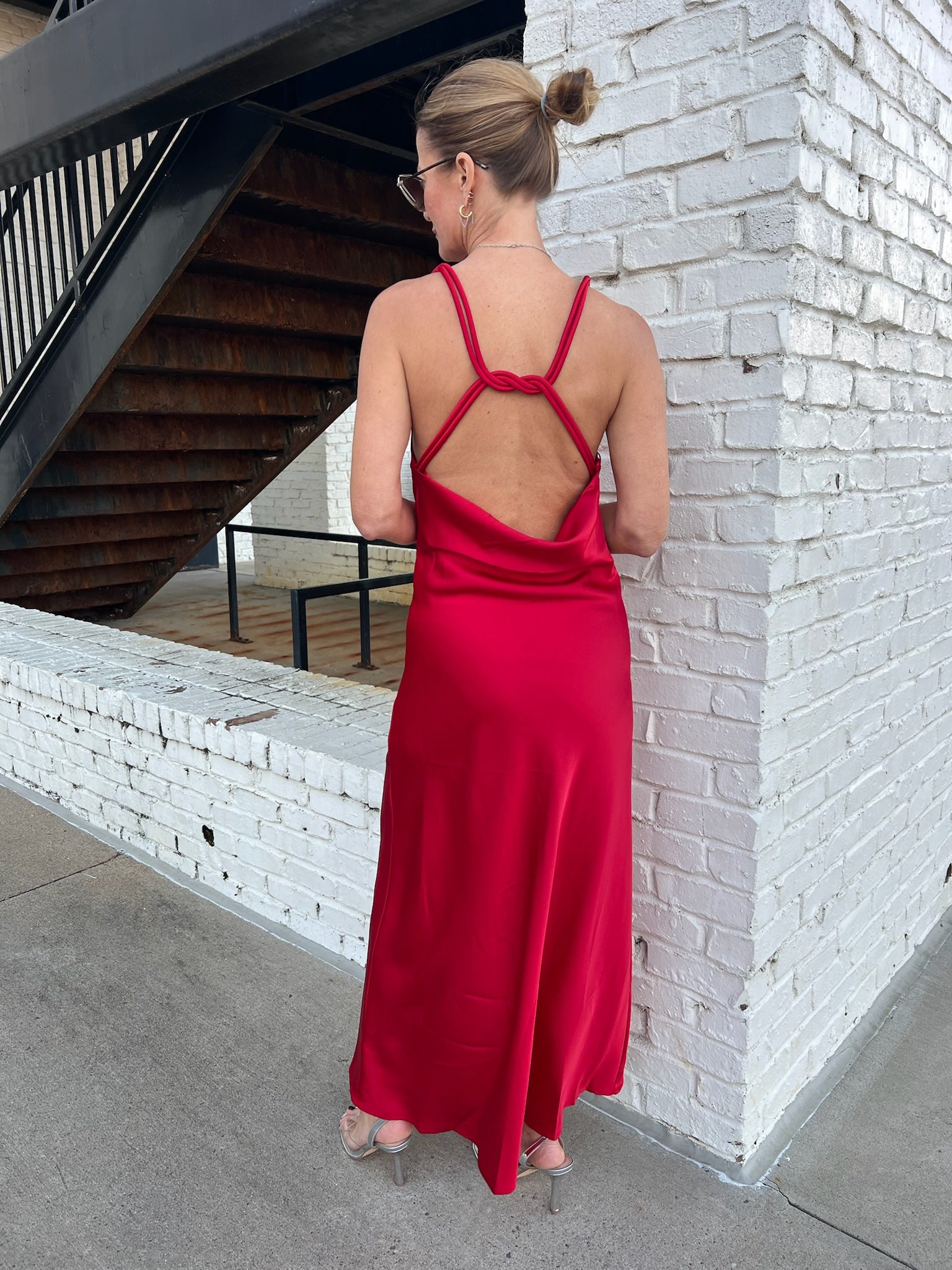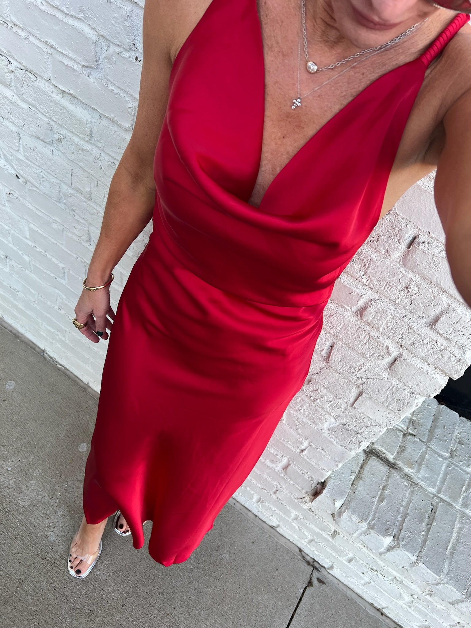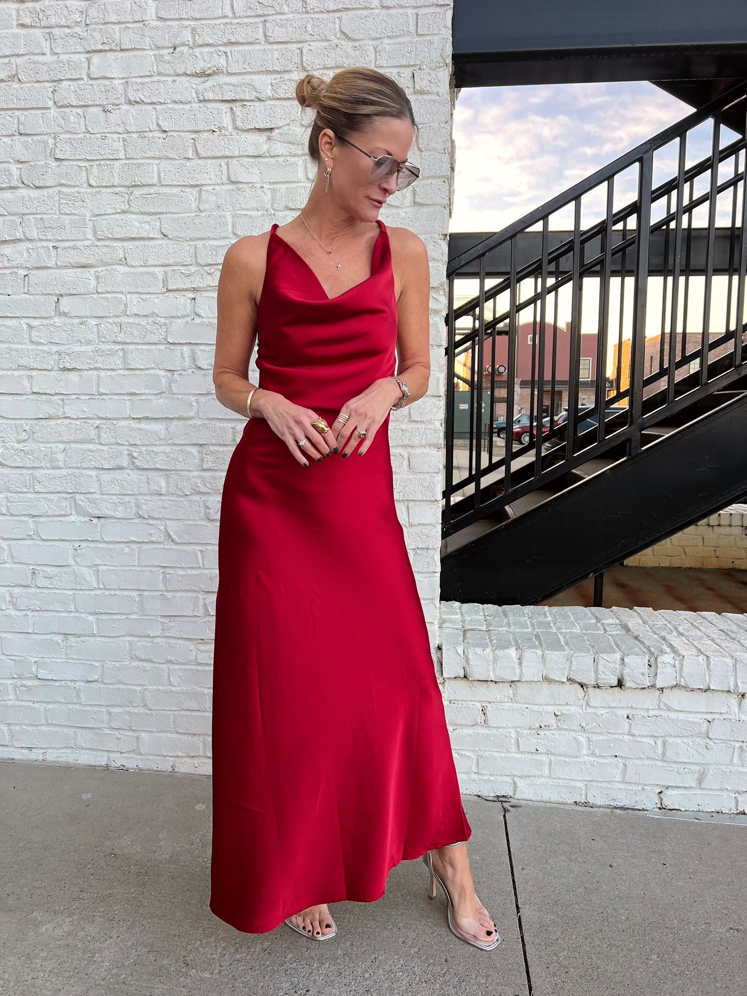 Elegance made effortless. This satin gown drapes beautifully with its soft cowl neckline, slim straps, and fluid silhouette that skims the body without clinging. The rich red tone makes it a stunning choice for holiday parties, winter weddings, or any formal night out. Timeless, sleek, and incredibly flattering.