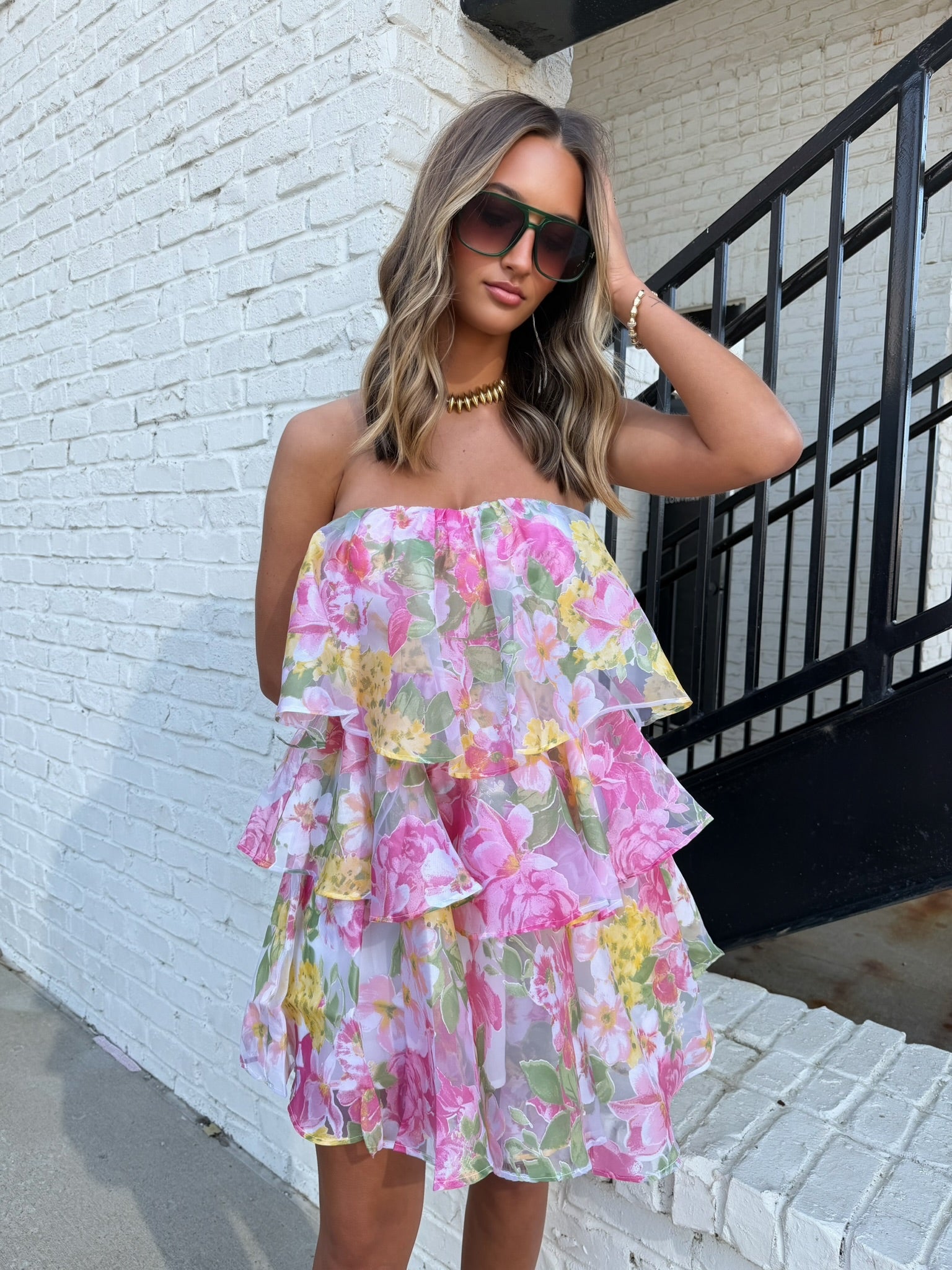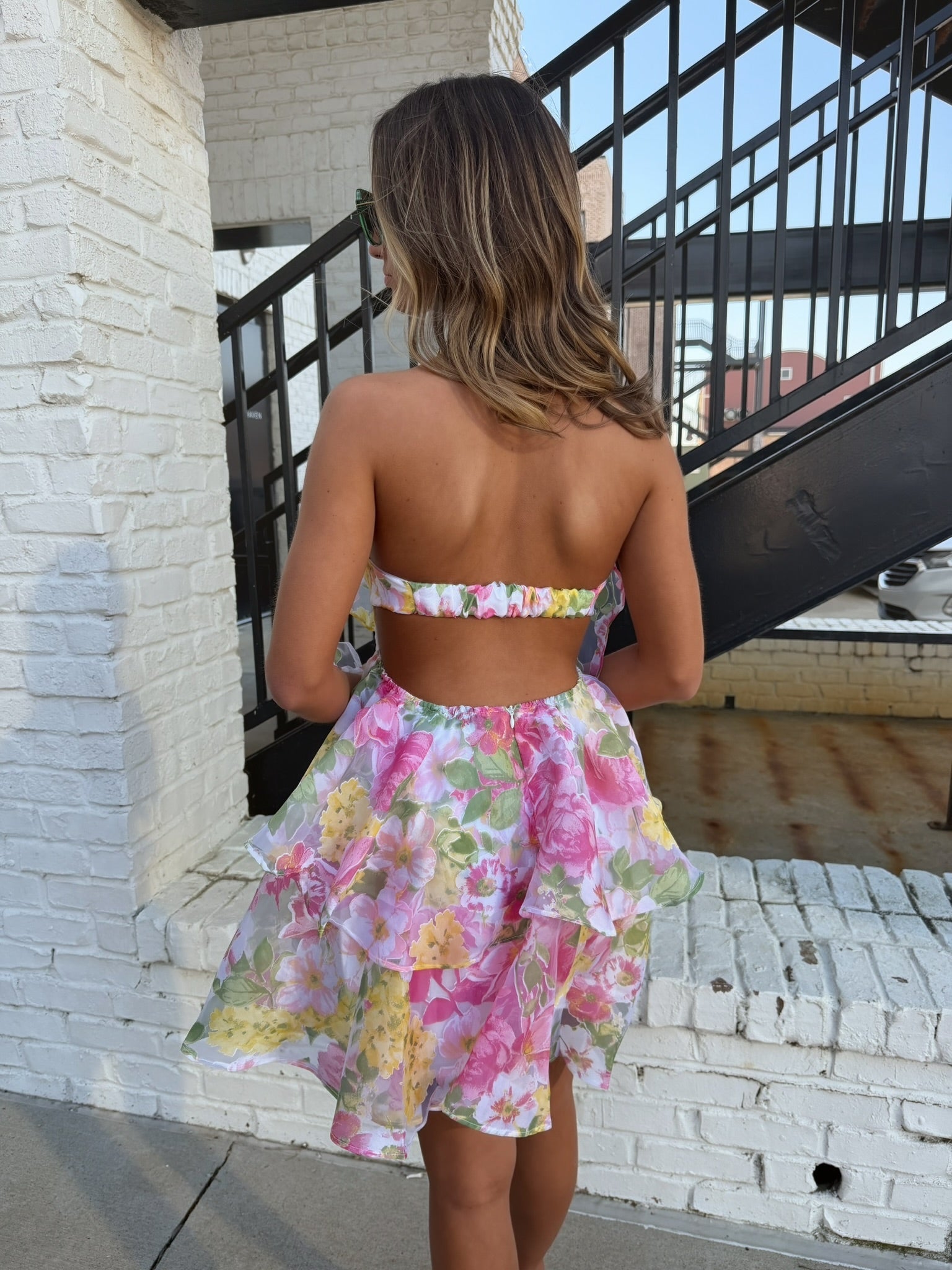This strapless floral dress features soft layered ruffles that create movement with every step, paired with a delicate pastel print that feels fresh and feminine. The elastic neckline keeps it comfortably in place, while the open back adds an unexpected, elevated detail. The silhouette is easy and flowy, giving you that effortless feel without losing shape.