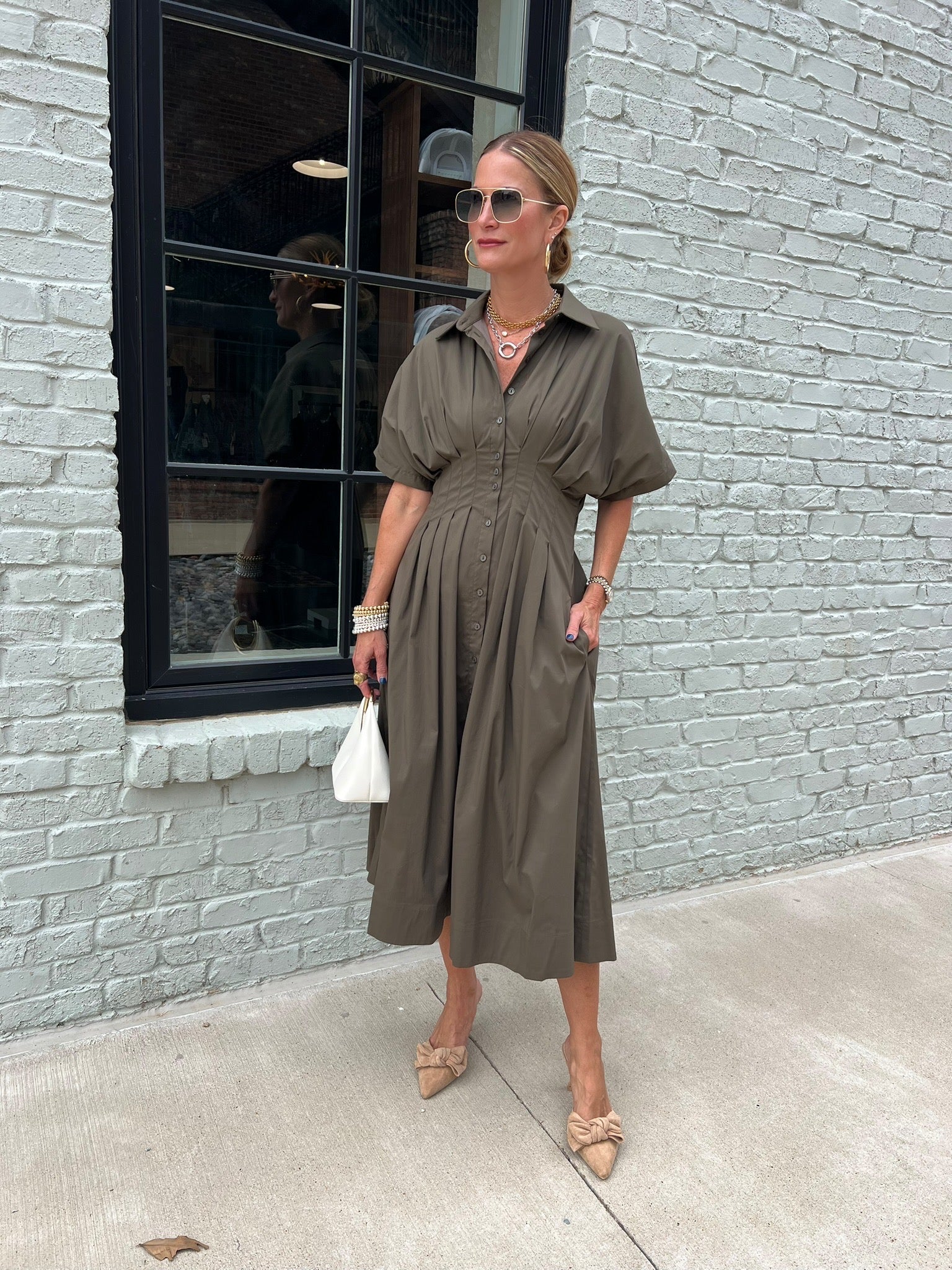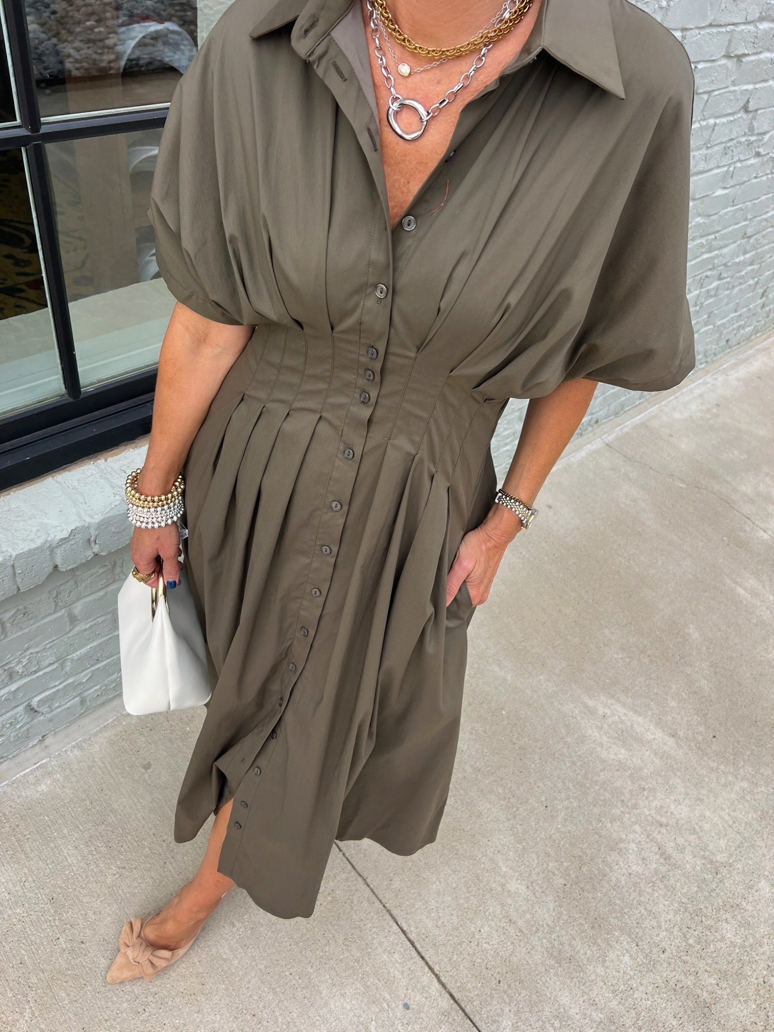 Classic tailoring meets modern ease in the olive pleated by Reset by Jane. Designed with a collared neckline, button-front closure, and soft pleating through the waist, this dress flatters the figure while keeping things effortless. The midi length and relaxed short sleeves make it perfect for everything from the office to dinner out—just switch up your shoes to take it from day to night.
