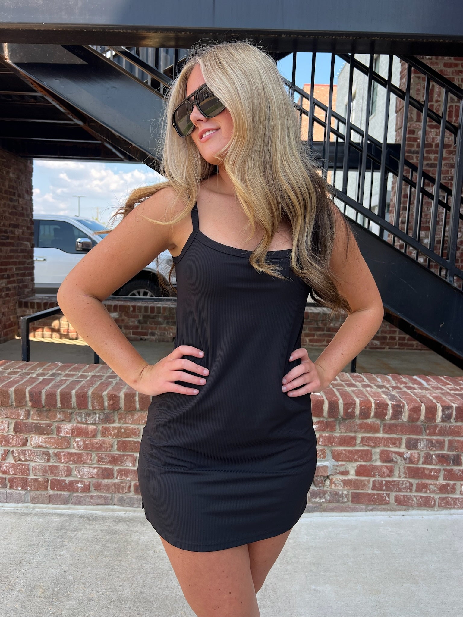 Sporty meets sweet in this square-neck mini, designed with delicate straps, grippy interior shorts, and moisture-wicking stretch for easy movement all day.
