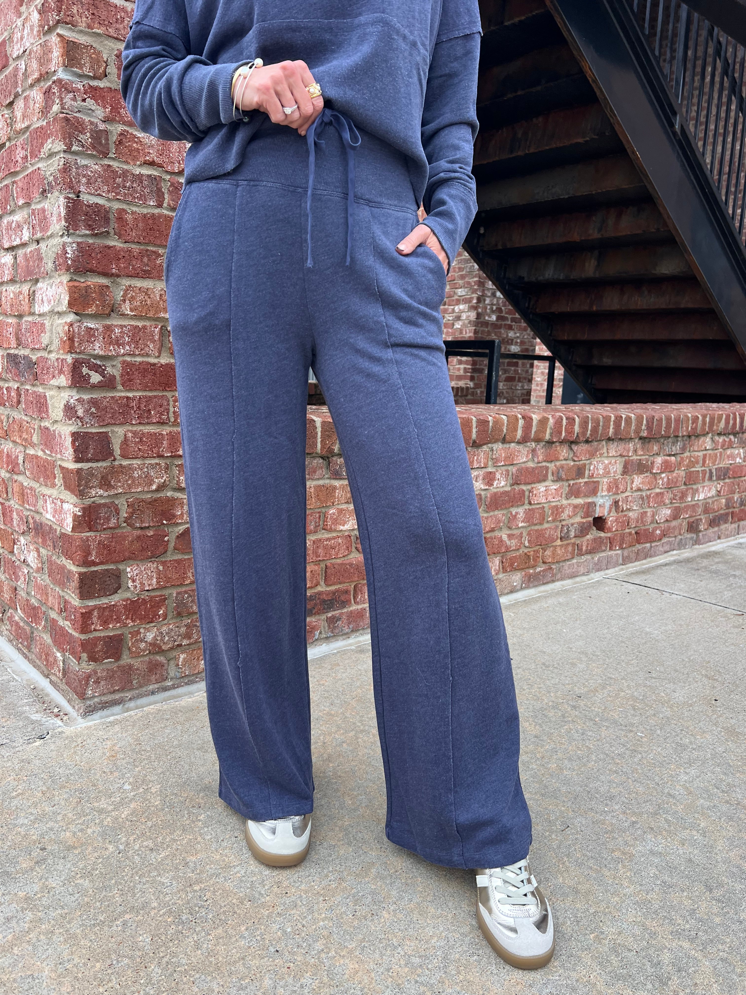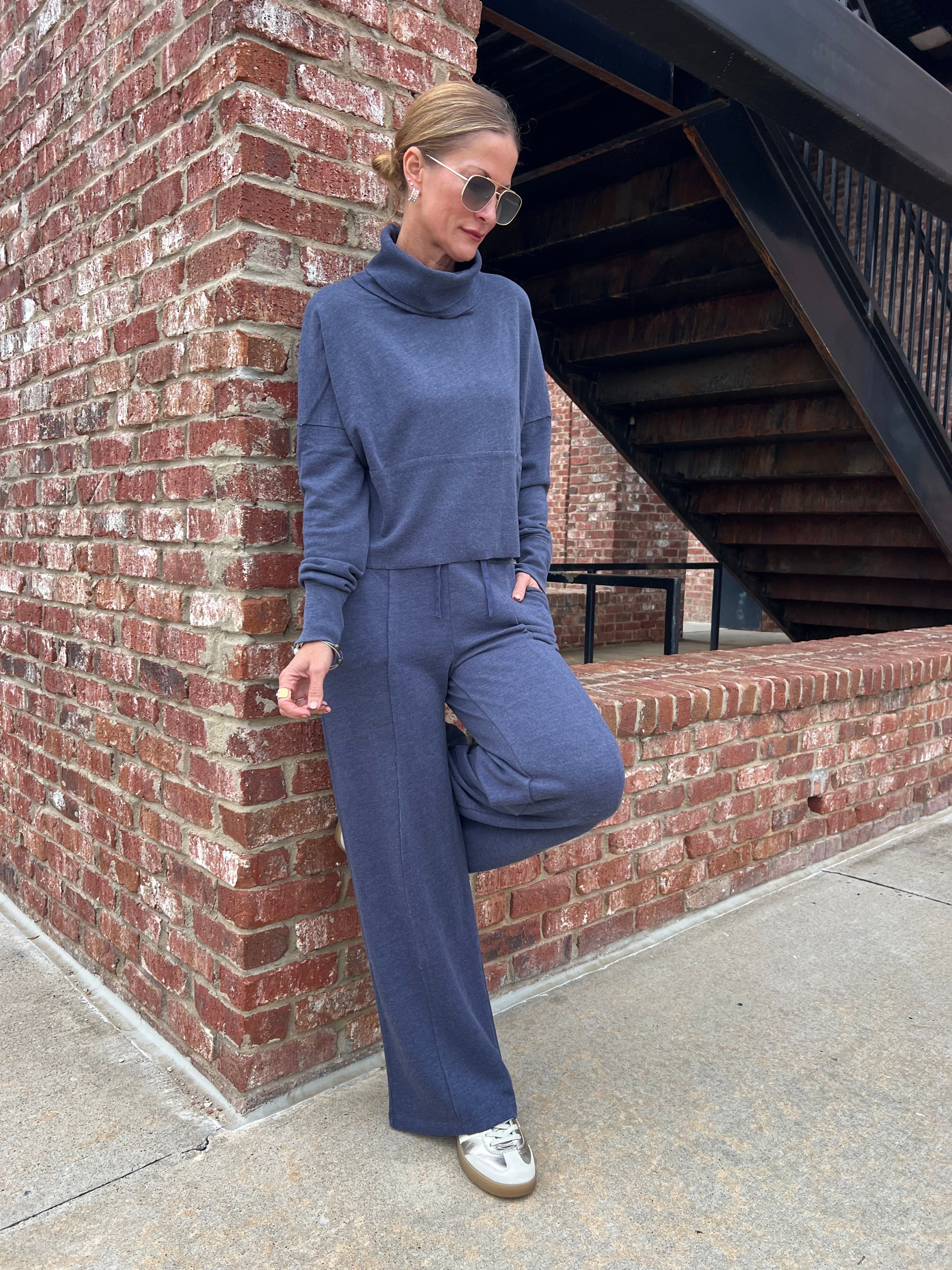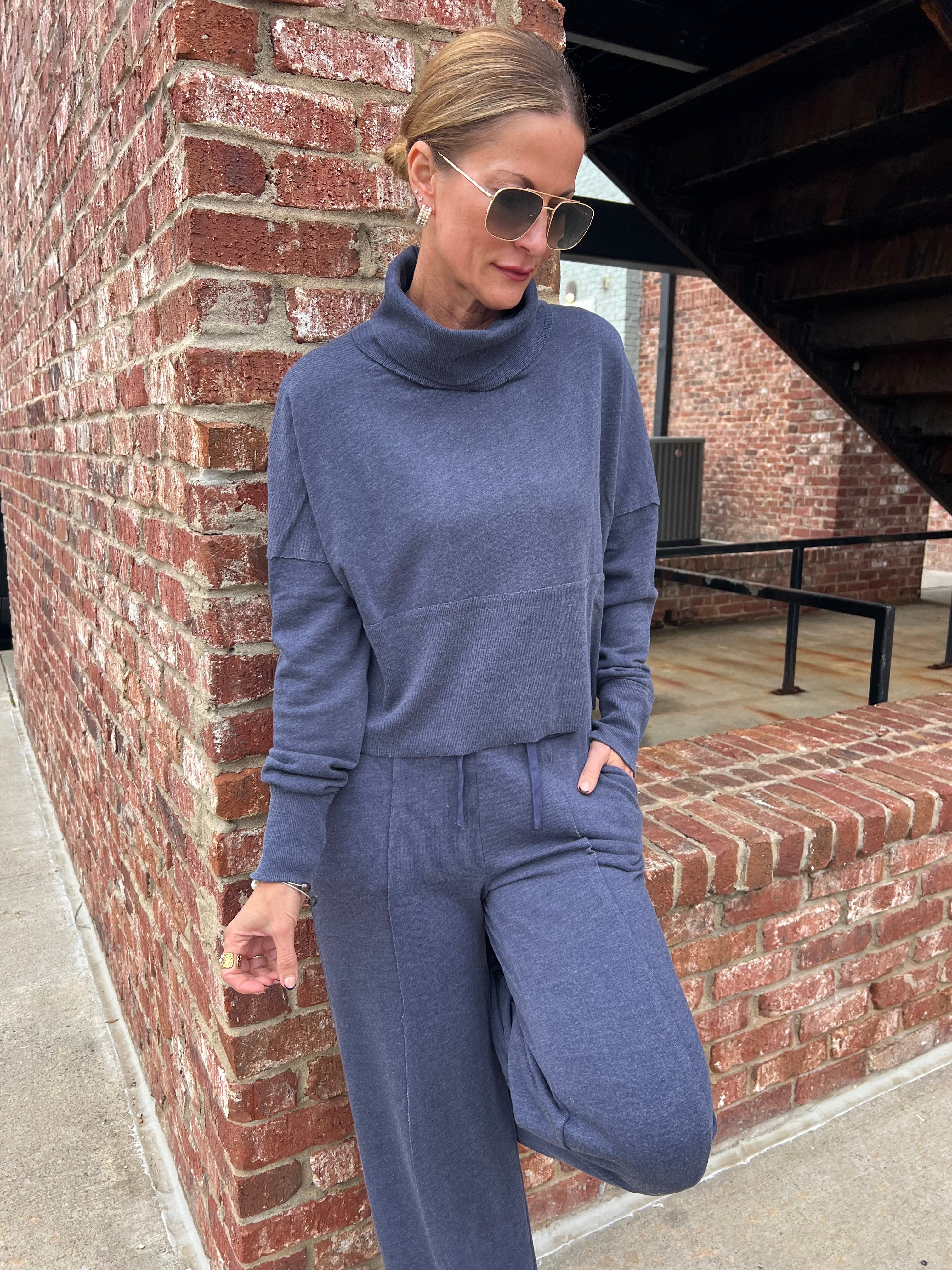 Soft, relaxed, and so easy to wear, this teal lounge set brings effortless comfort with a polished look. The top features a relaxed cowl neckline and a slightly cropped silhouette that pairs perfectly with the matching wide-leg pant. The pants have an easy drawstring waist and a drapey full-length fit that moves beautifully. Cozy without feeling bulky, lightweight without feeling thin.