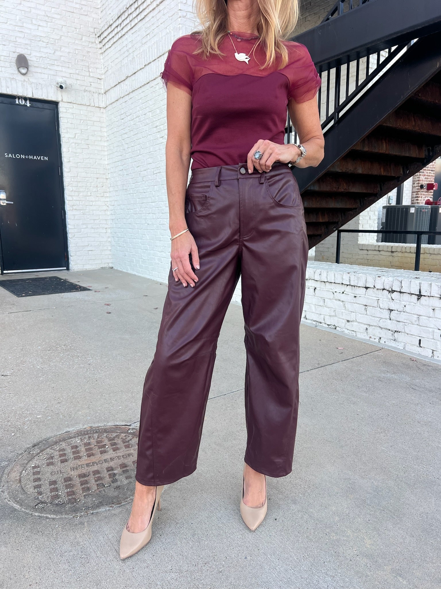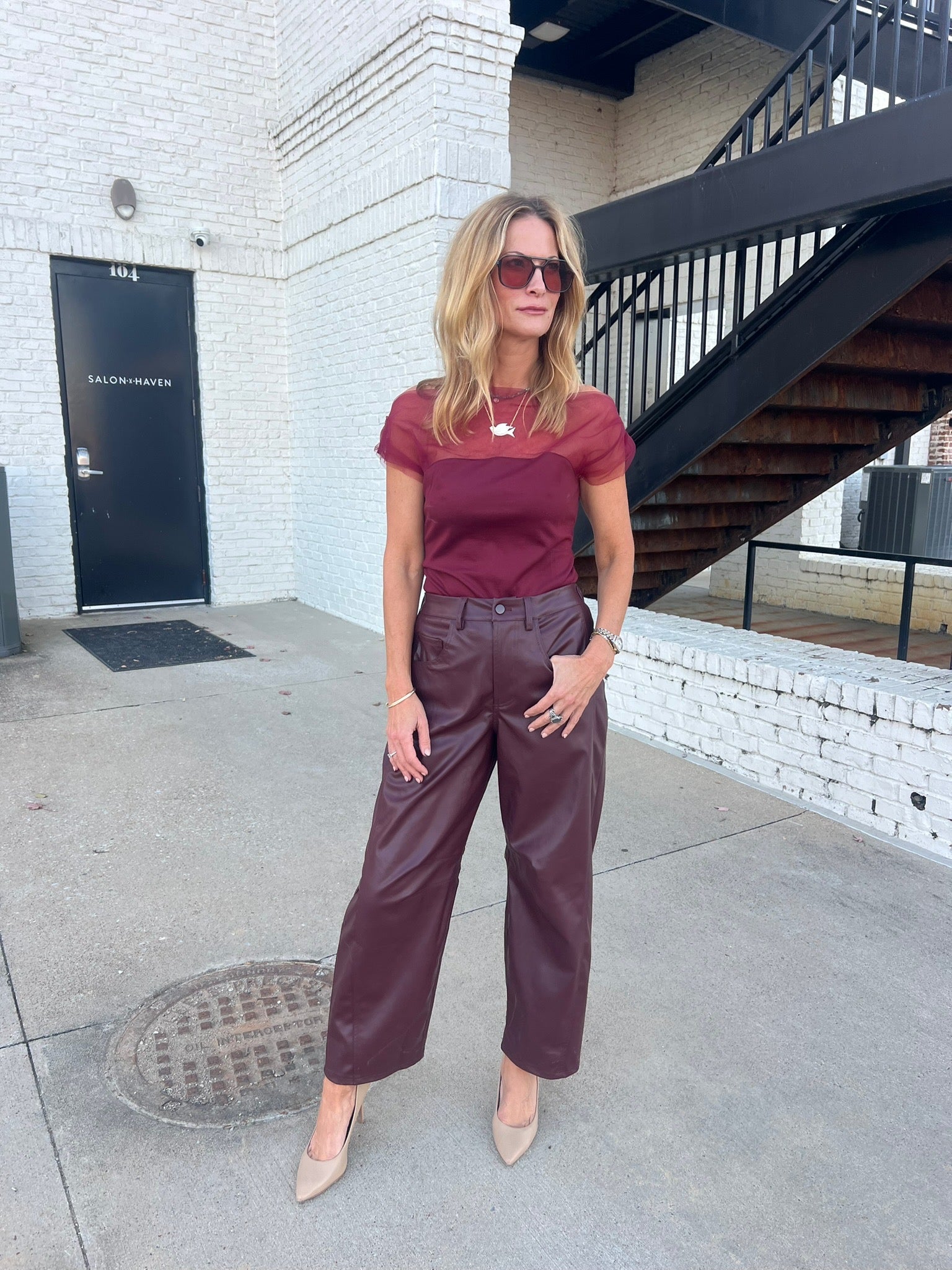 There’s something about burgundy faux leather that instantly feels elevated, and these wide leg pants prove it. The moment you slip them on, the fit feels structured but comfortable, giving you that tailored look without the stiffness. The slight sheen catches the light beautifully, making them a standout piece for fall nights and holiday plans 🍷 We would wear these to dinner dates, girls’ night, or a dressier event where you want to look polished without trying too hard.