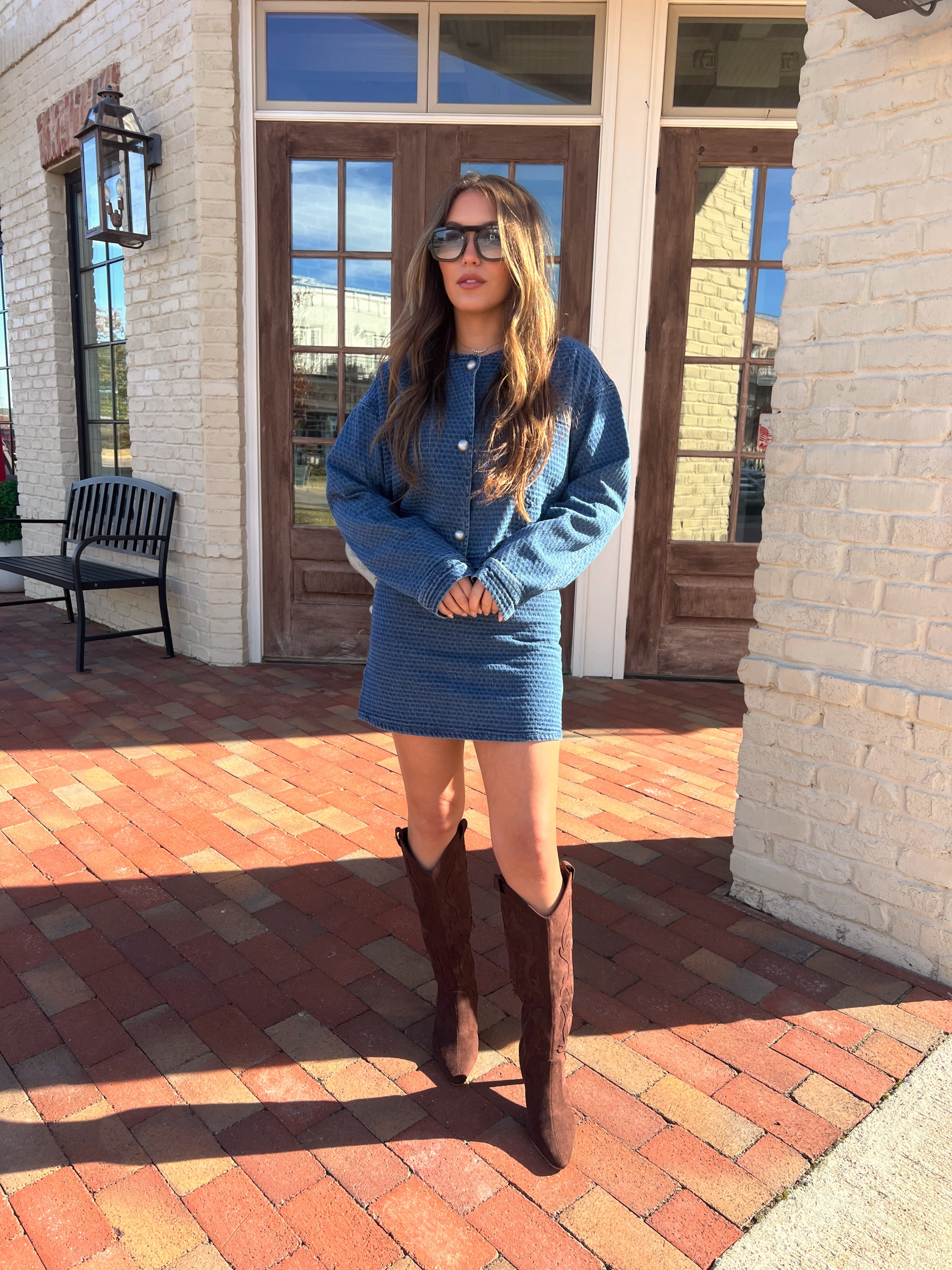 This skirt brings a fun, modern spin to classic denim. The textured blue fabric gives it a unique look, and the clean, straight silhouette keeps it polished and easy to style 💙 The stretch makes it comfortable for all-day wear, and it pairs perfectly with the matching jacket for a chic, coordinated moment. We would wear this to brunch, a casual date night, or a day of shopping.