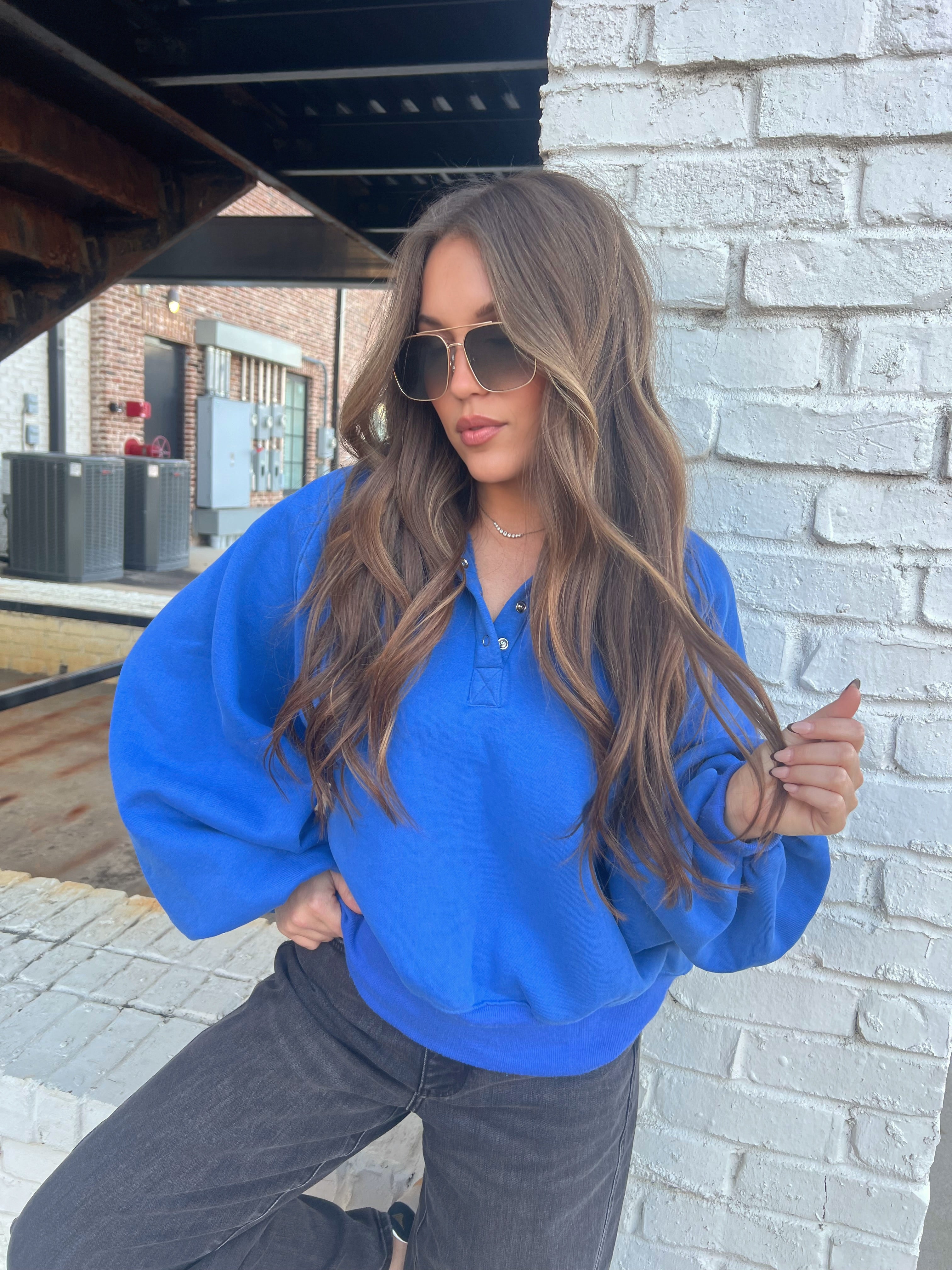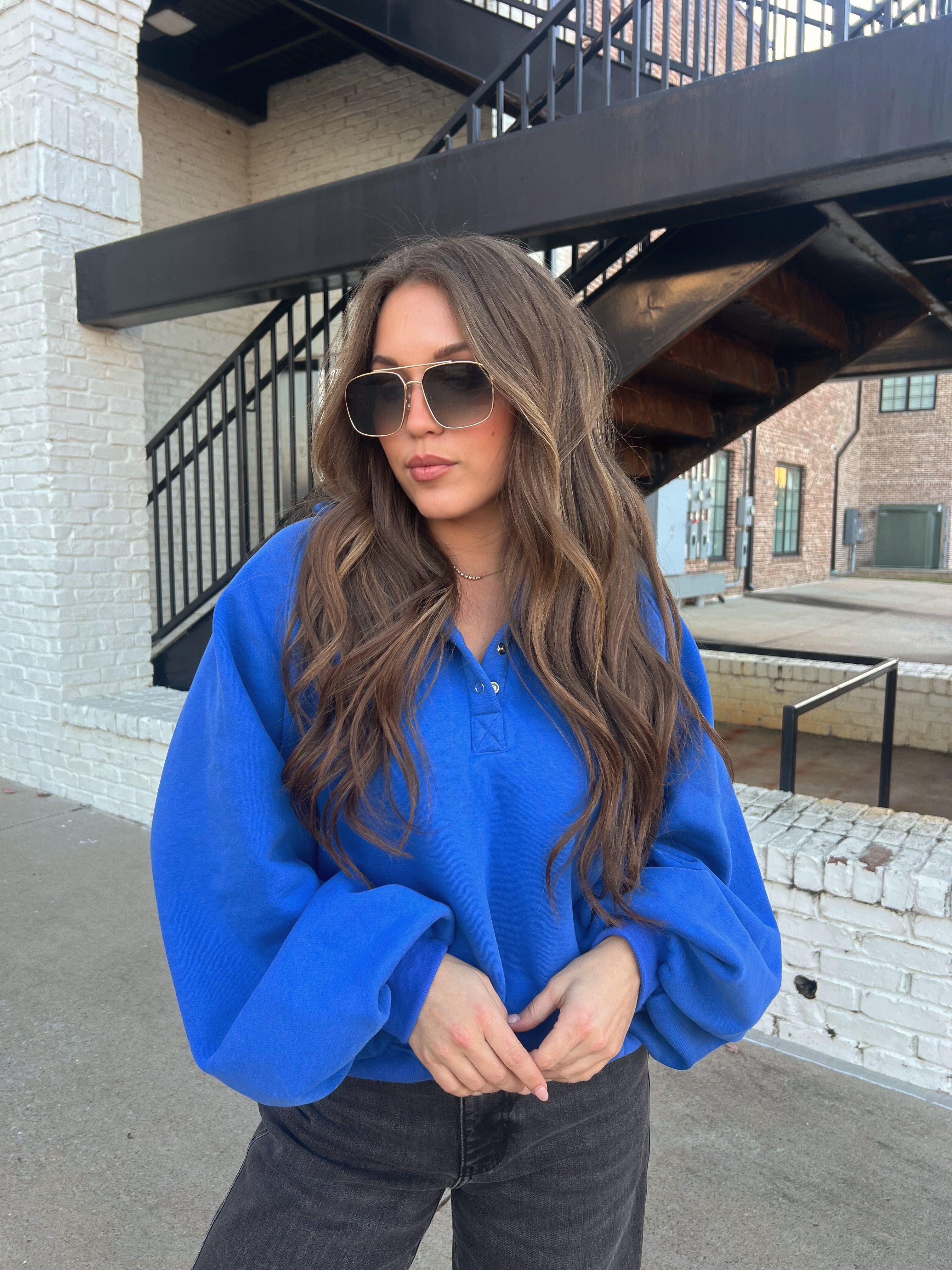 Made for cozy mornings and spontaneous coffee runs, this popover has that perfect mix of comfort and polish. The vibrant red hue makes a statement on its own, while the oversized sleeves and soft brushed texture give it an easy, relaxed feel. Snap buttons add a little edge, making it the ideal throw-on for crisp days when you still want to look put-together.