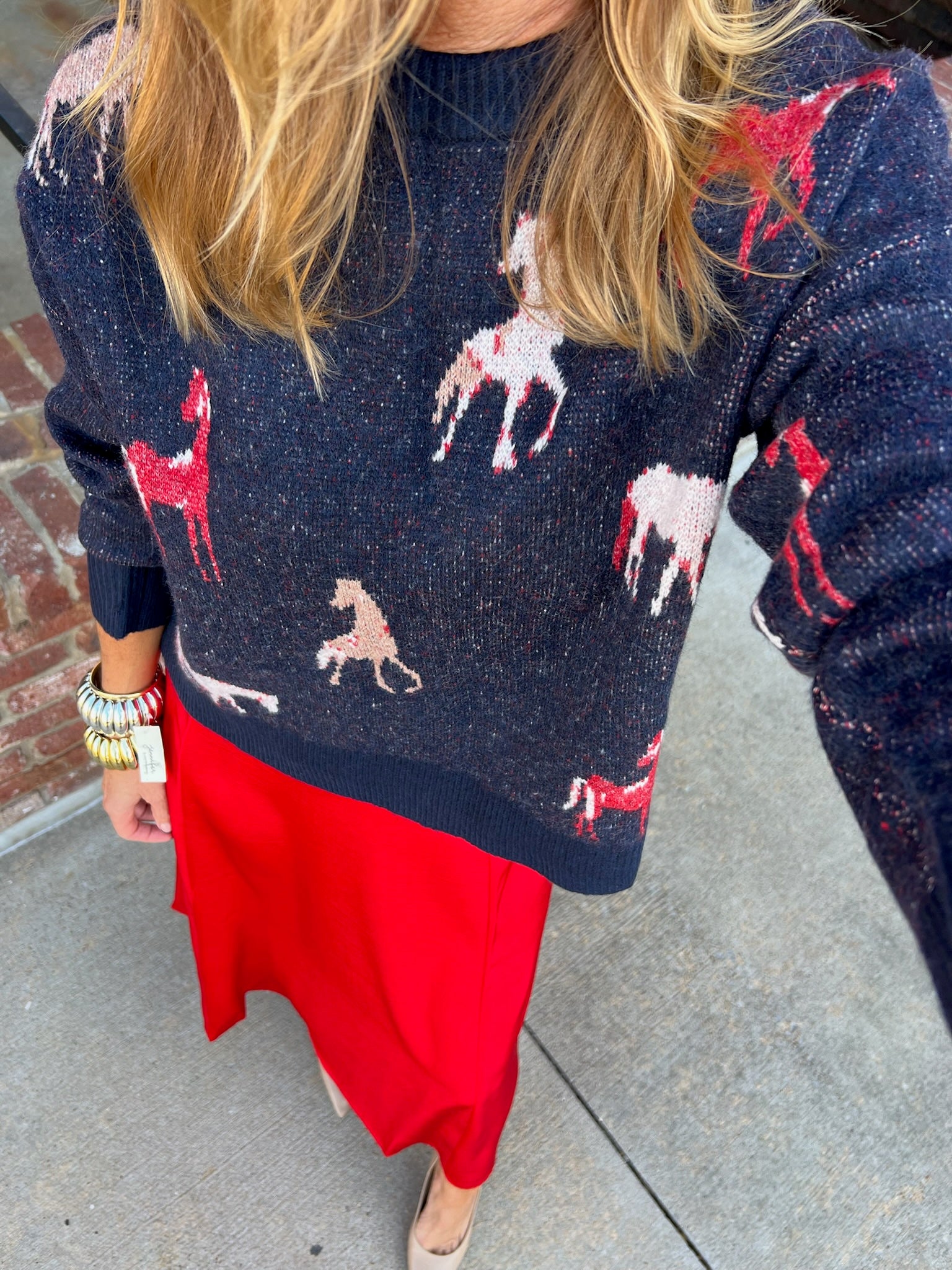 This sweater feels like a little piece of whimsy for your winter wardrobe. The navy knit is soft with a cozy, flecked texture, and the playful horse pattern adds the sweetest touch of charm without feeling too young 🐎 The relaxed fit makes it easy to tuck or wear loose, and the ribbed trim keeps the shape clean and classic. We would wear this to holiday gatherings, casual office days, or a festive weekend outing.