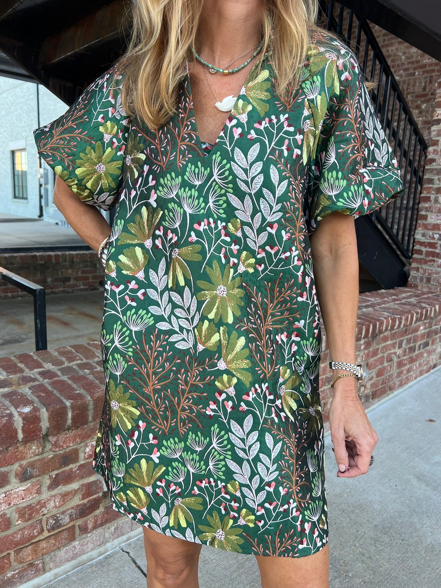 Some dresses just feel like a breath of fresh air, and this green floral print brings that feeling to life. The rich botanicals, soft shimmer details, and easy shift silhouette make it one of those pieces you slip on and instantly feel pretty 🌿 The lightweight fabric and flutter sleeves keep it comfortable, while the bold pattern does all the work. We would wear this to garden parties, church, or a sweet weekend lunch.