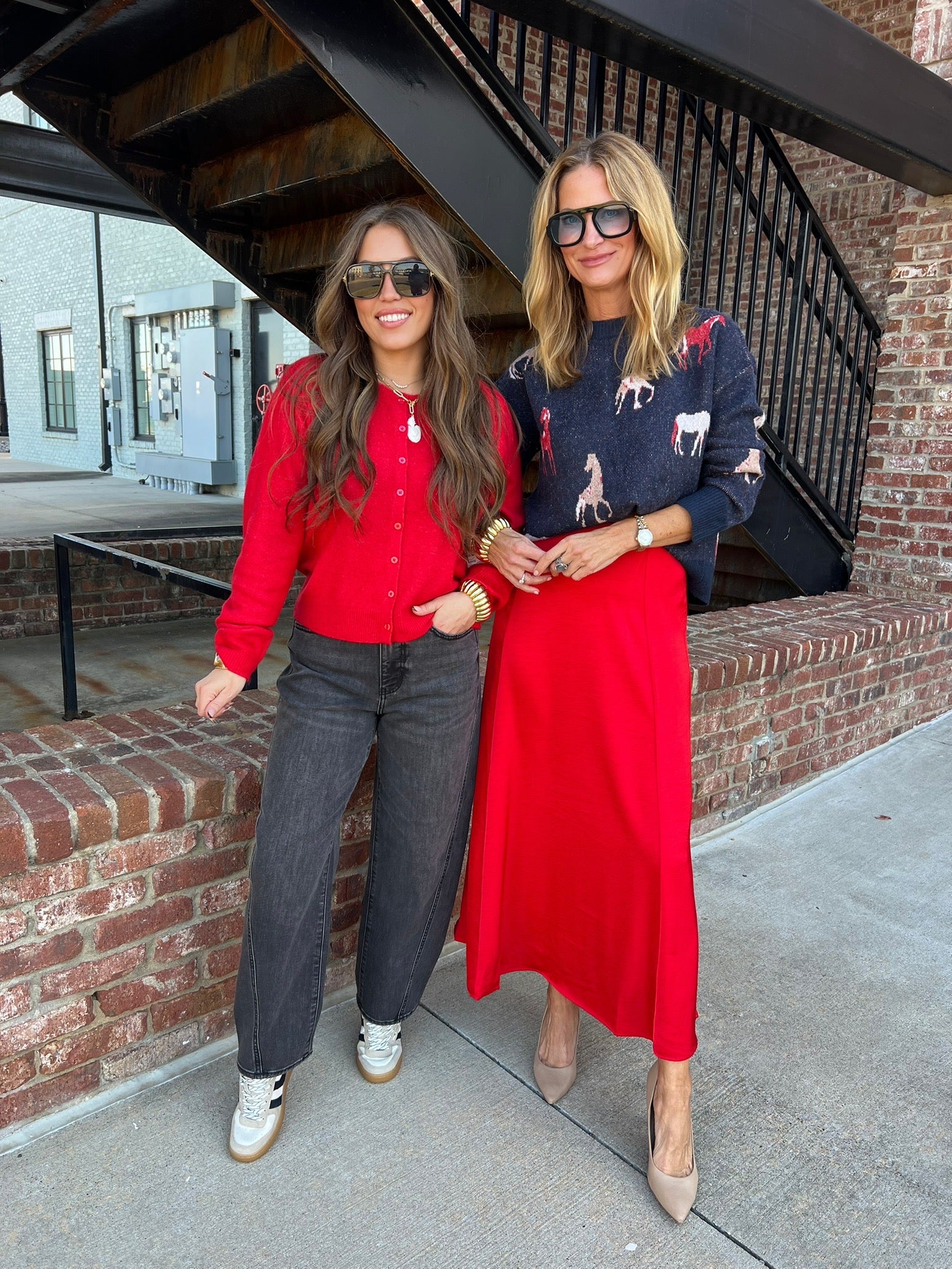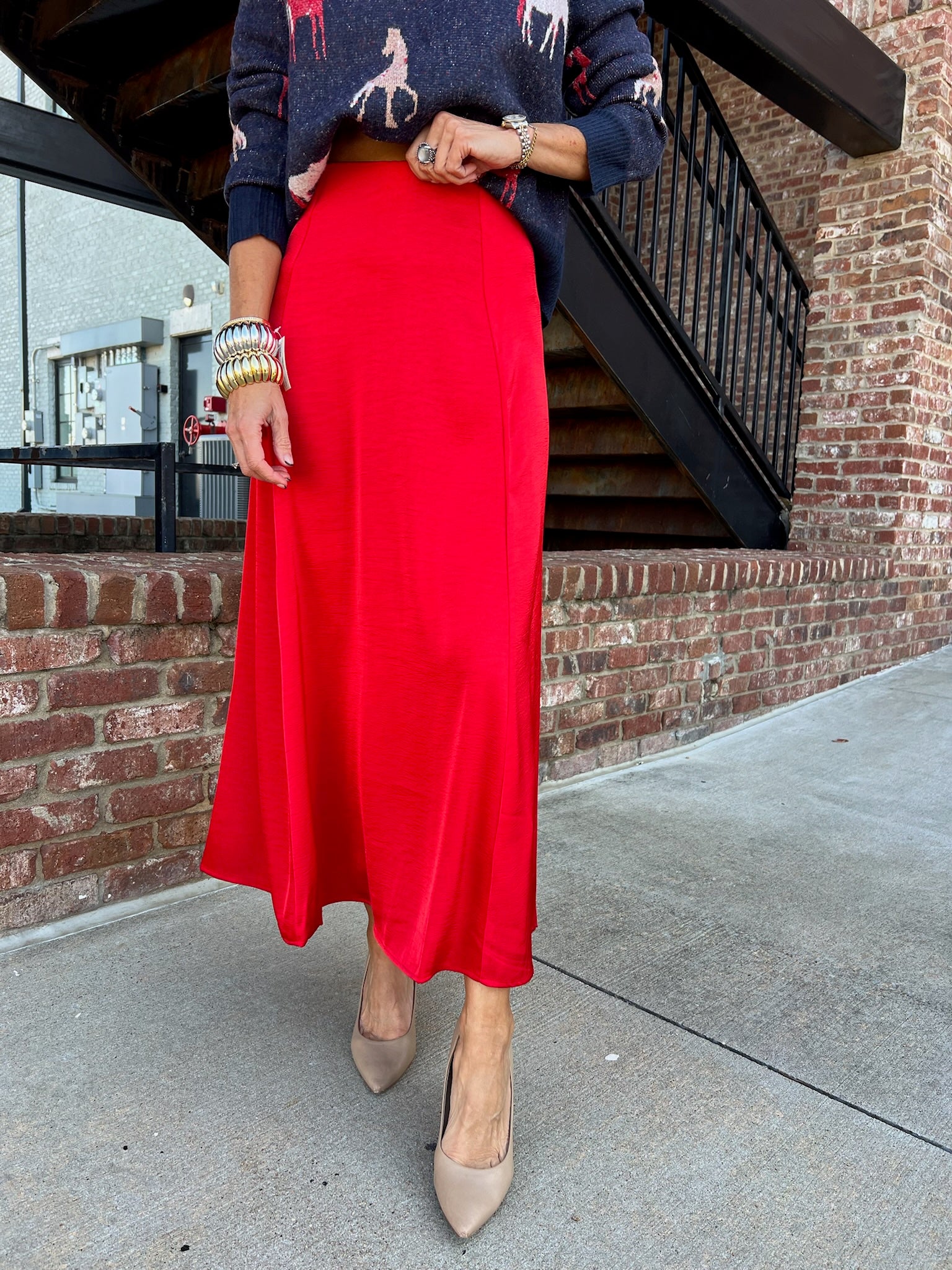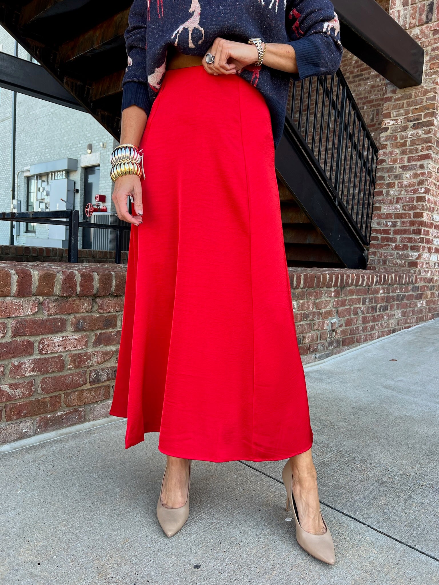 Elevate your seasonal wardrobe with this stunning midi skirt that effortlessly transitions from day to night. The high-rise fit flatters your silhouette while the invisible zip closure delivers a sleek, polished look. Crafted in a rich festive red, this versatile piece pairs beautifully with everything from casual tees to elegant tops, making it the ultimate go-to for any occasion this season.