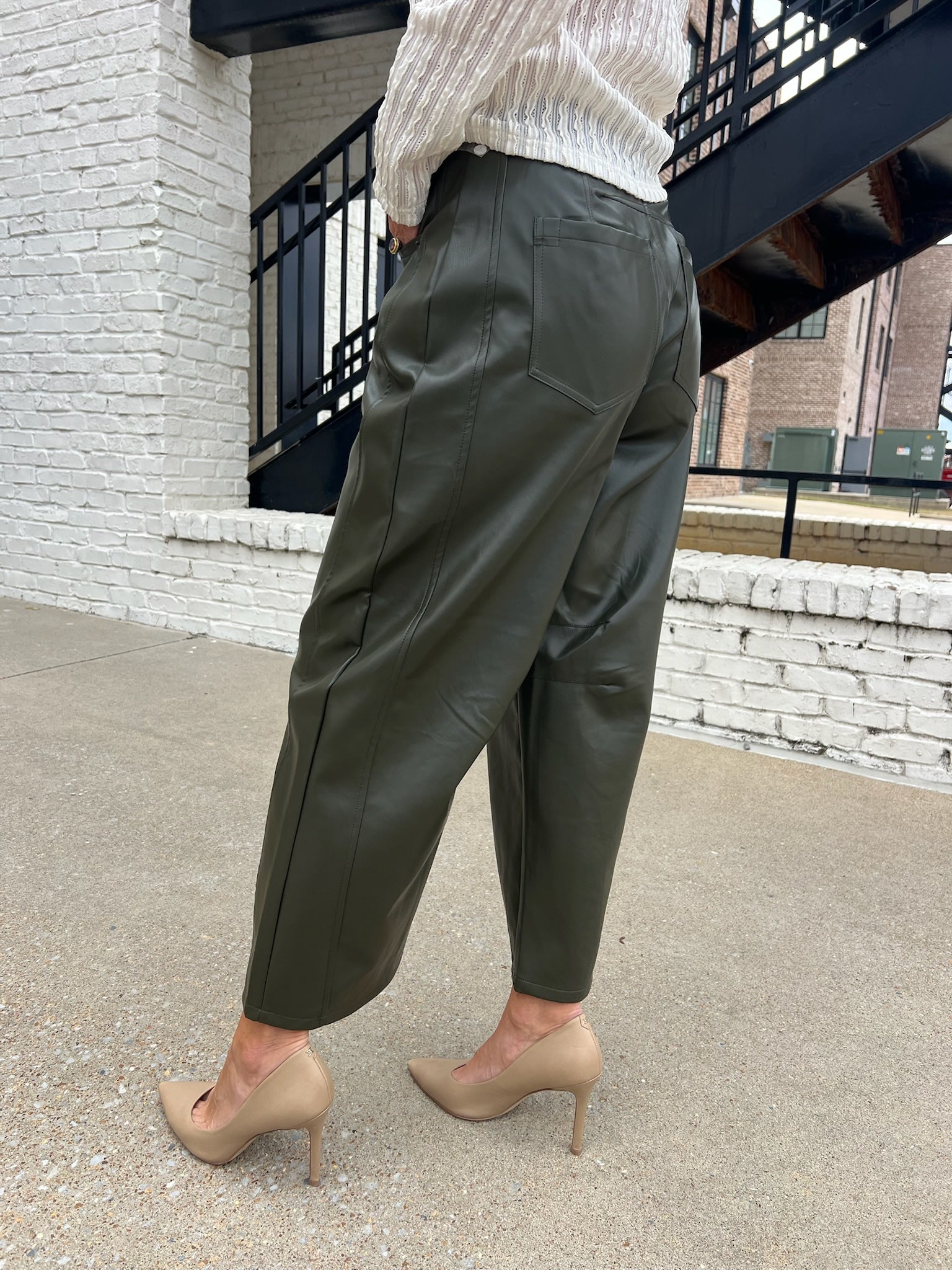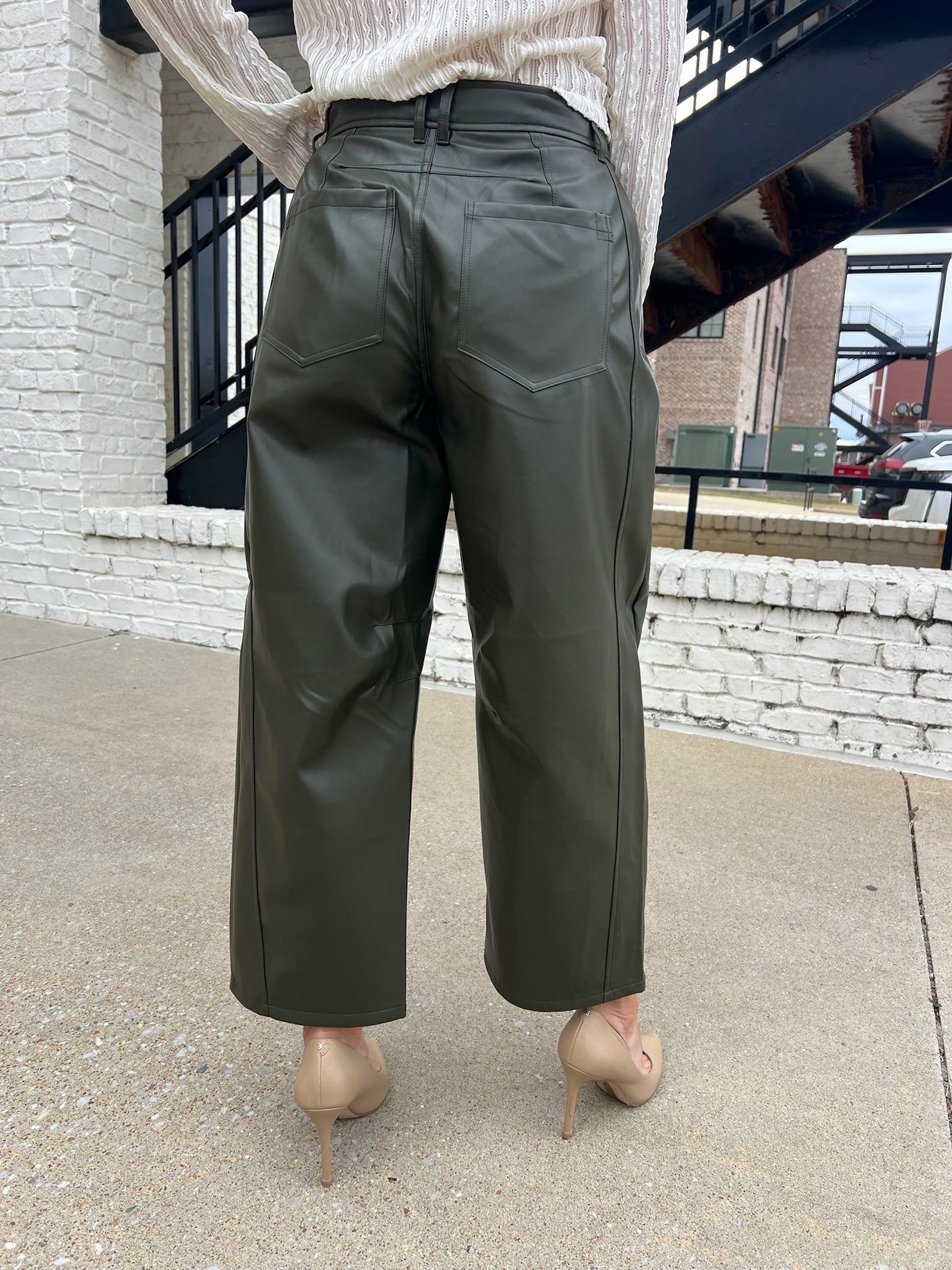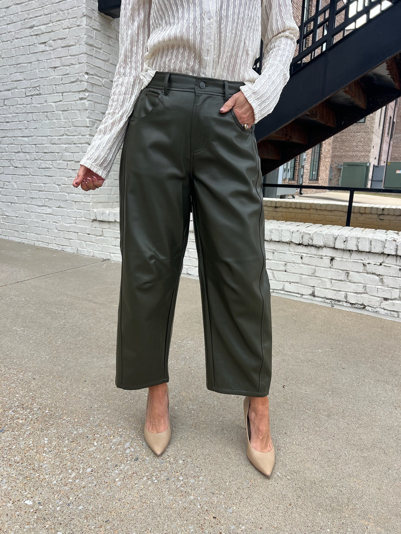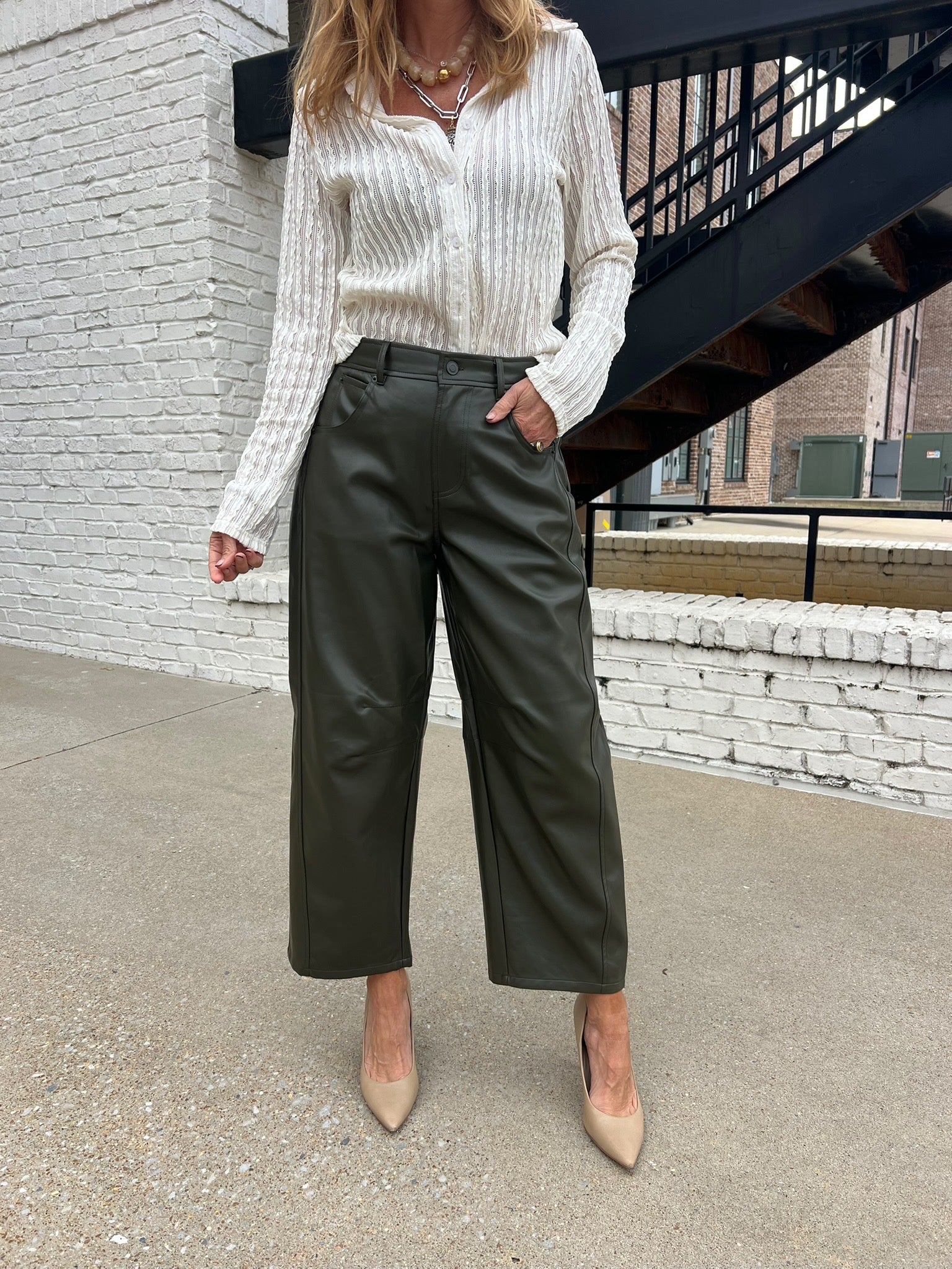 These olive faux leather pants bring a modern, elevated edge to your fall lineup. The high-rise fit feels structured and flattering, while the straight leg keeps the silhouette clean and effortless. The finish is soft with just the right amount of sheen, making them easy to dress up with heels or keep casual with a cozy sweater. They’re the kind of statement pant that works for so many looks. 🤎✨