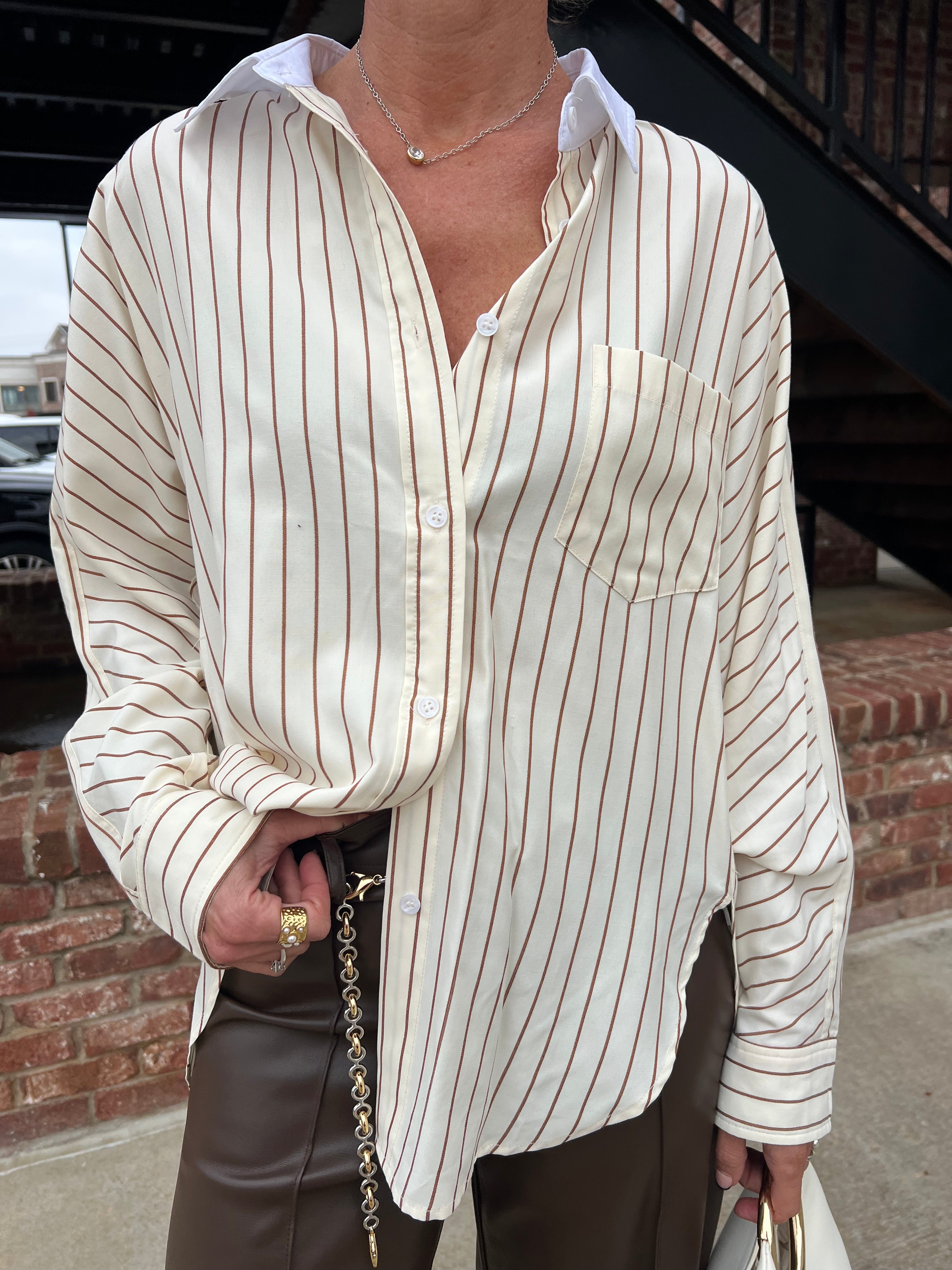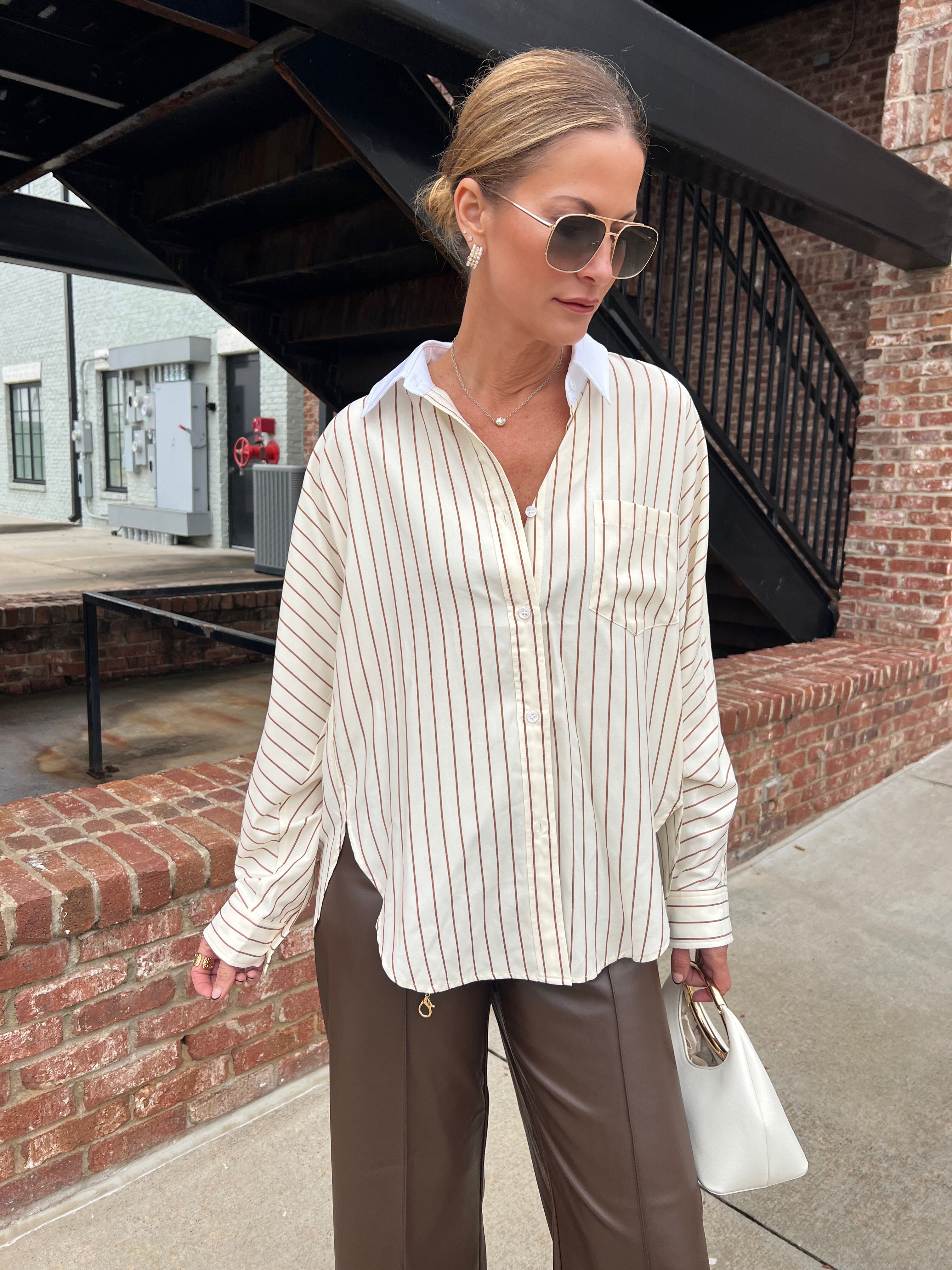 From the soft drape to the crisp white collar, this blouse has that effortless polish that instantly pulls an outfit together. The relaxed fit hangs just right, and the mocha pinstripes feel modern and timeless all at once. Wear it tucked, half-tucked, or loose for a cool, undone vibe. Lightweight, easy, and perfect for layering with your favorite faux leather bottoms.