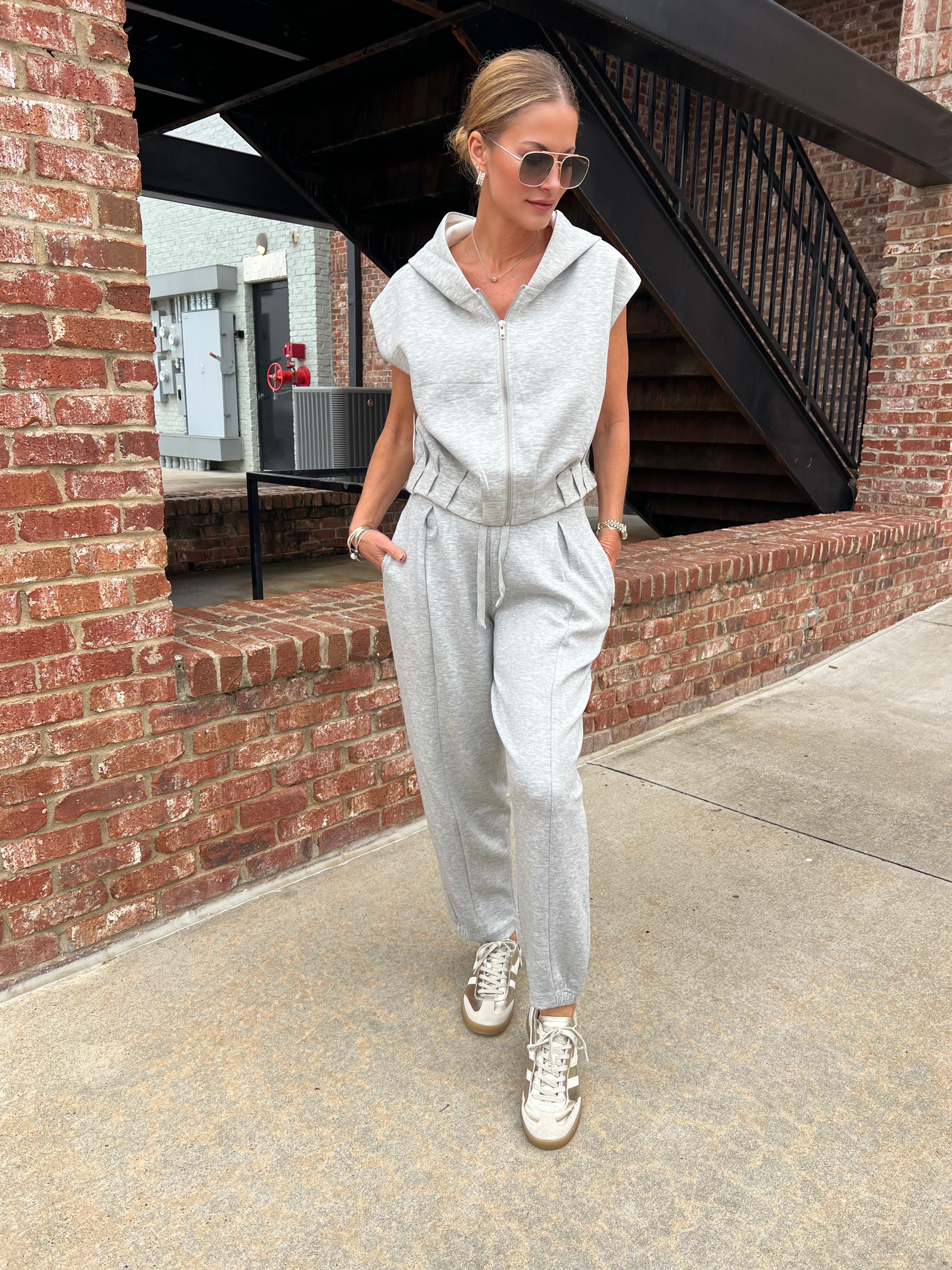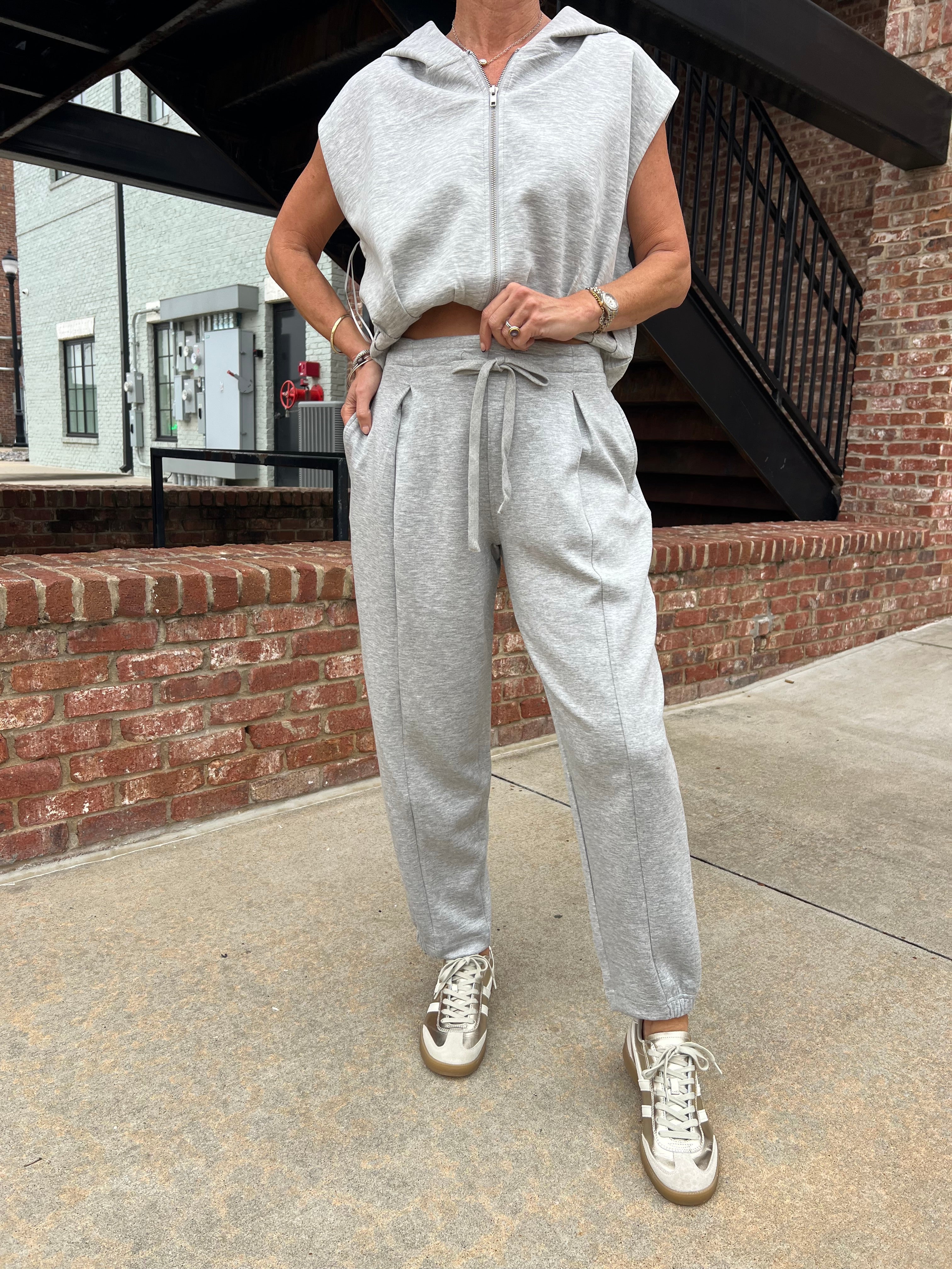 A cool, relaxed take on athleisure, this soft gray set brings a fresh shape to your everyday lineup. The sleeveless zip-up hoodie has an oversized drape, a roomy hood, and an easy cinched waist detail that meets perfectly with the tapered jogger. The pants have a soft drawstring waist, front pleats, and a flattering cuffed ankle fit. Lightweight, comfy, and modern.