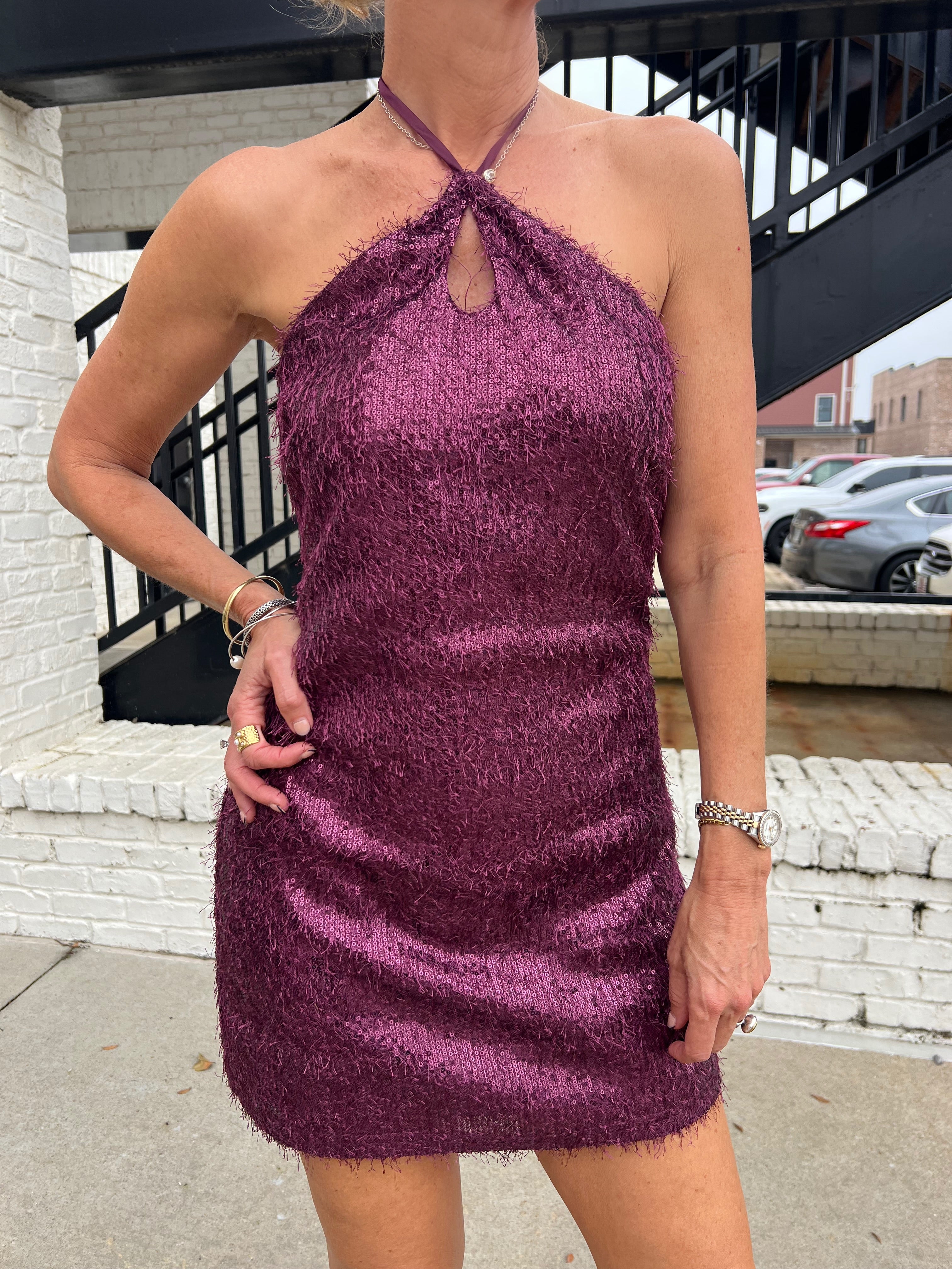 From the moment the light catches that raspberry shimmer, this dress feels like the main-character moment you’ve been waiting for. The halter neckline frames your shoulders beautifully, the keyhole detail adds just enough drama, and the textured, eyelash-style fabric brings that luxe holiday glow. The fit is sleek, flattering, and ready for every festive night on your calendar.