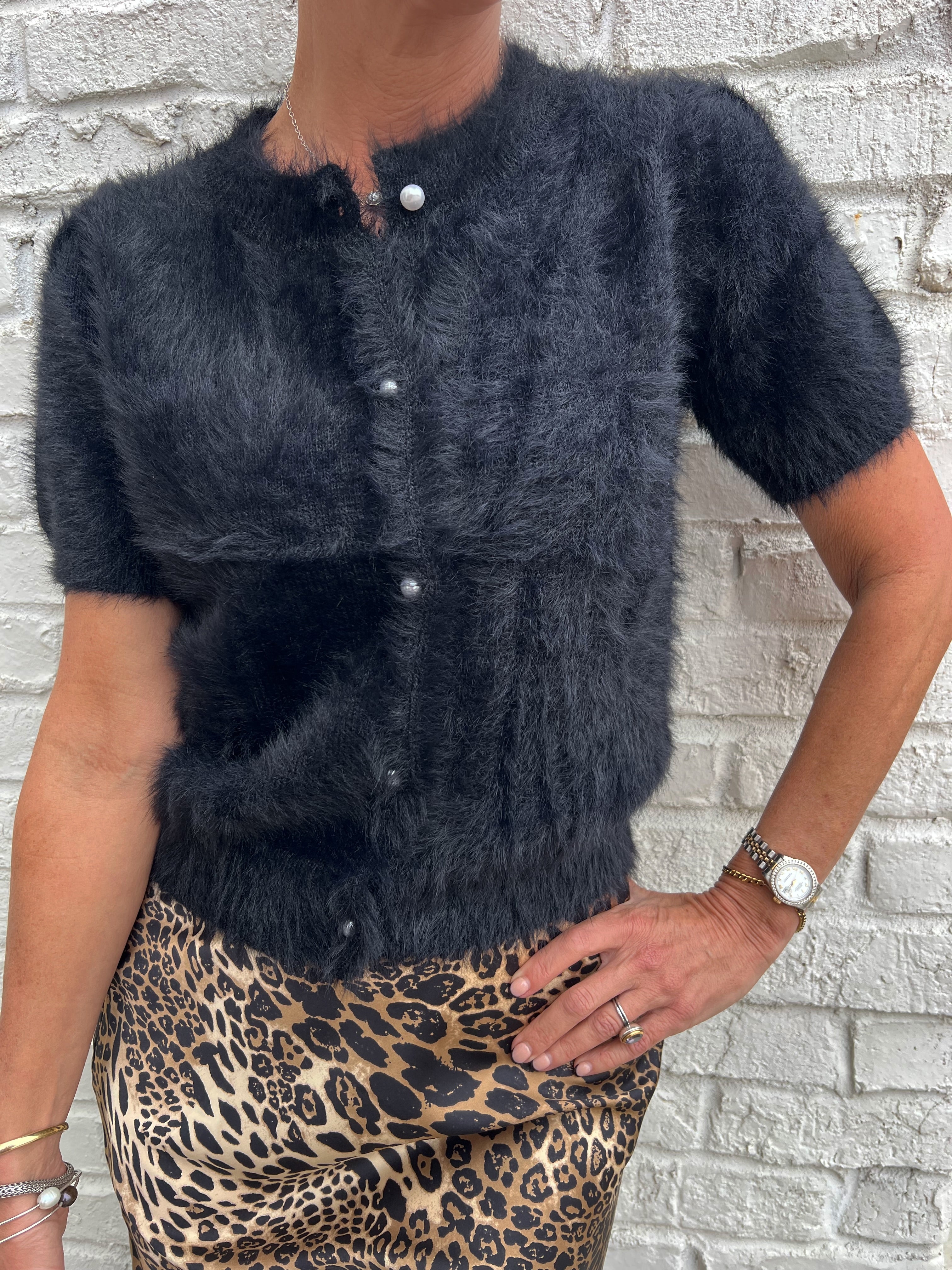 Soft, cozy, and a little bit glam, this top feels like slipping into something special the moment you button it up. The plush black knit has the prettiest texture, the short sleeves make it an easy transitional piece, and the pearl-style buttons add just the right hint of polish. Pair it with denim for an elevated everyday look or dress it up with a skirt for a night out.