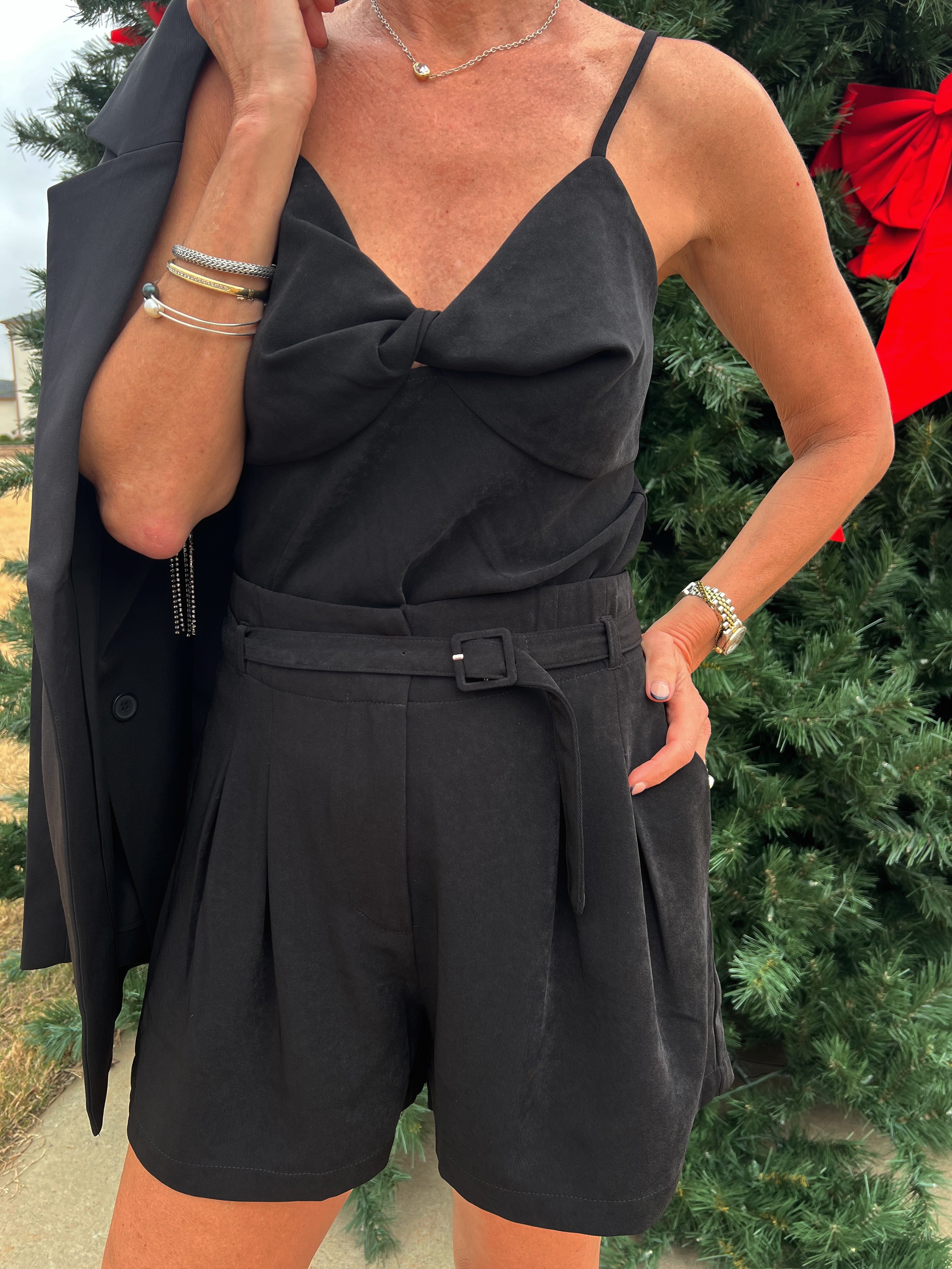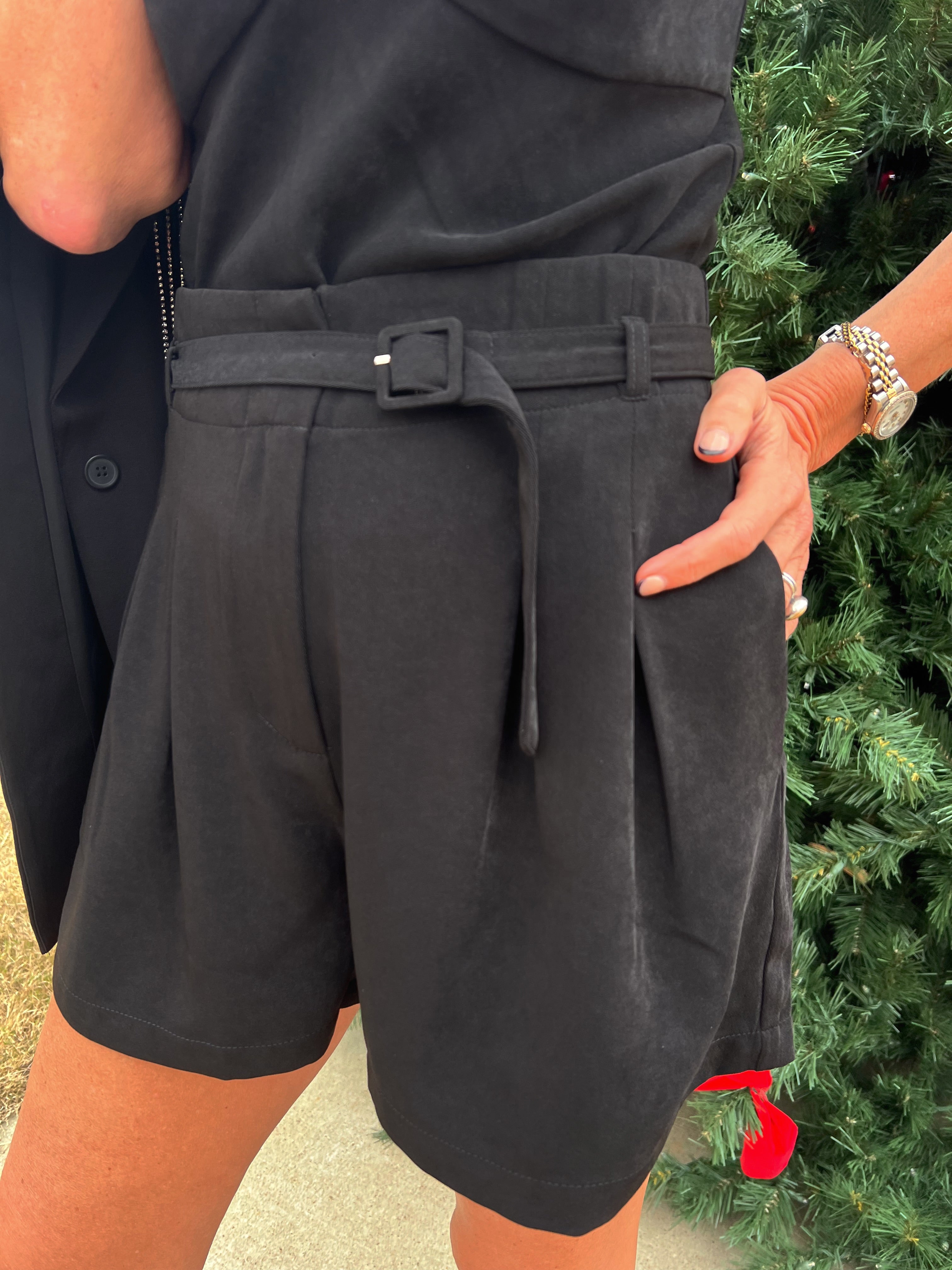 Clean lines, a flawless fit, and that dressed-up-but-still-easy vibe. These black belted shorts bring a polished shape with front pleating, a comfy mid-rise, and a soft brushed finish that feels elevated without trying. The removable belt lets you style them your way, and the length is perfect with tights, boots, or a sleek heel.
