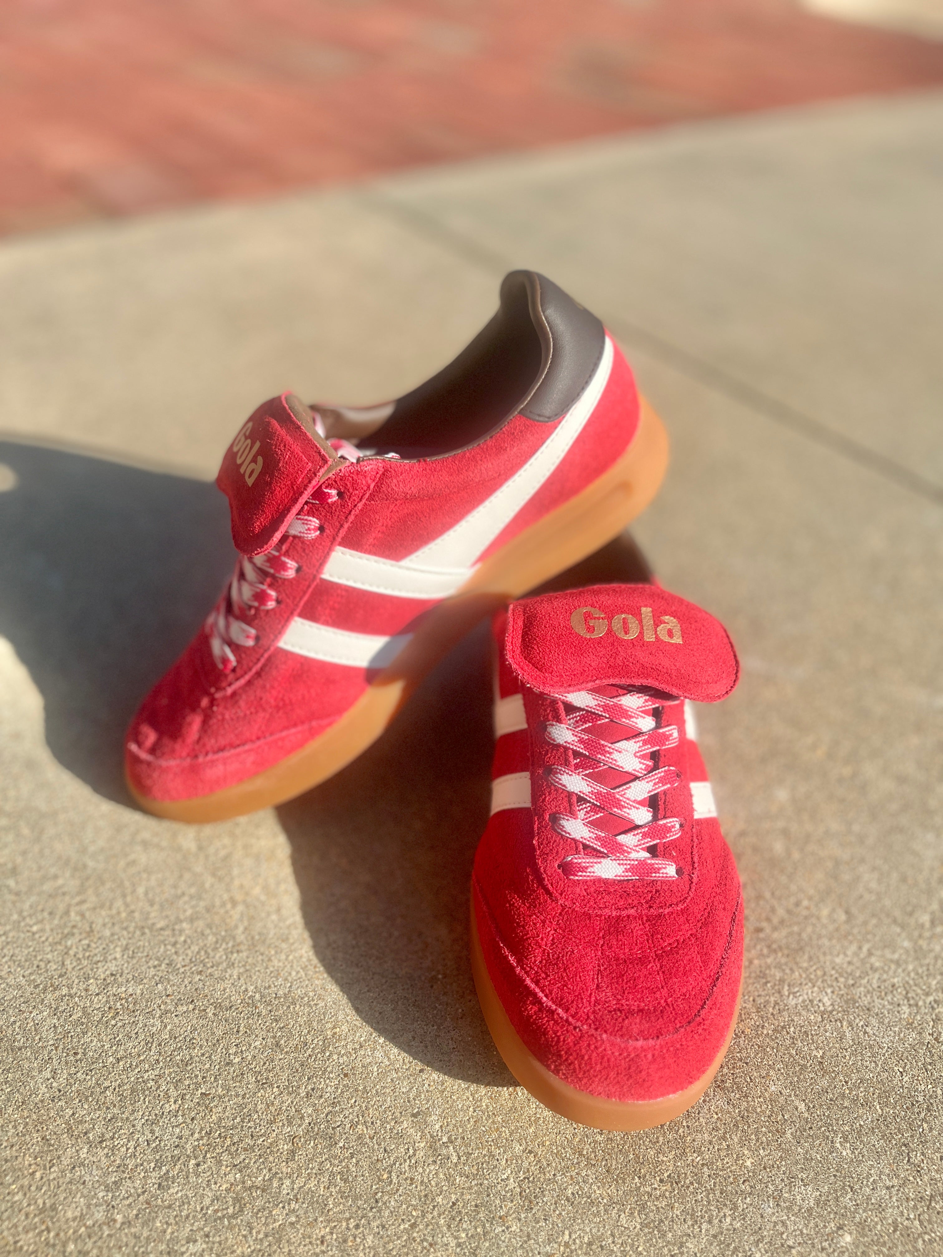 The women’s Stadia ‘86 references Gola’s heritage with a vintage football silhouette and a gum cup sole, red suede upper and check laces. A signature off white wing flash trim and dark brown tab are complimented with a fold over tongue in this new AW women’s sneaker from Gola.