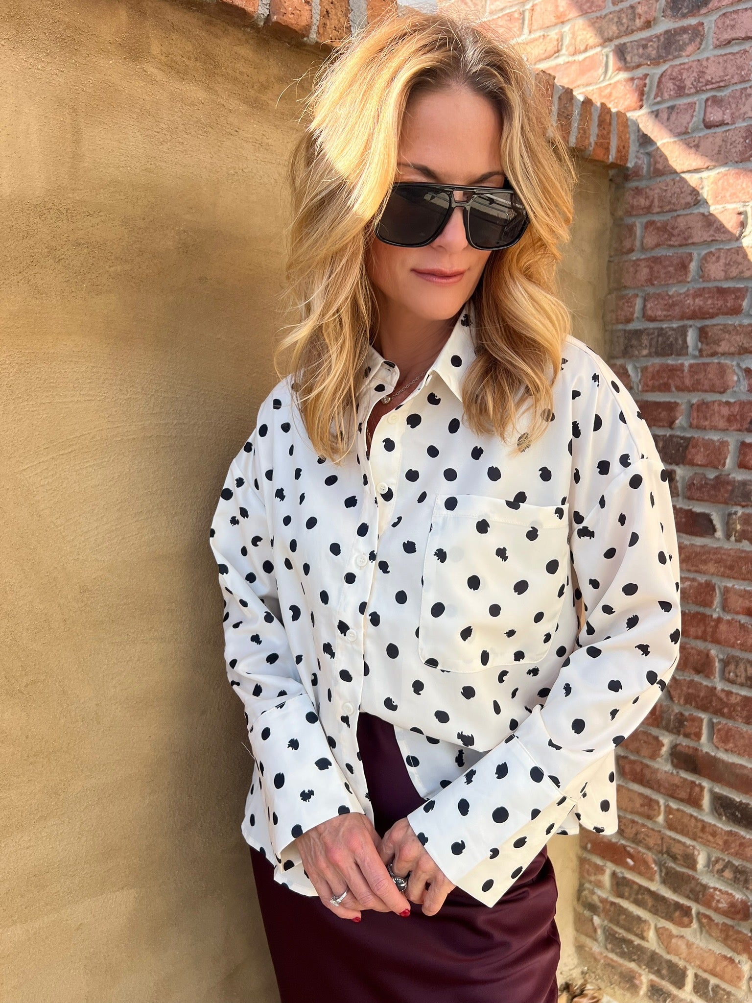 Playful, polished, and perfectly versatile—the Ink Spot Blouse is made to move from desk to dinner with ease. Its crisp white base is scattered with hand-drawn black polka dots, giving a fresh twist to a timeless pattern. The relaxed button-down fit features a front pocket, curved hemline, and slightly oversized sleeves for that effortless “borrowed-from-the-boys” feel, softened by the feminine drape of the fabric. Pair it with tailored trousers, denim, or a sleek skirt for a look that feels as easy as it does elevated.