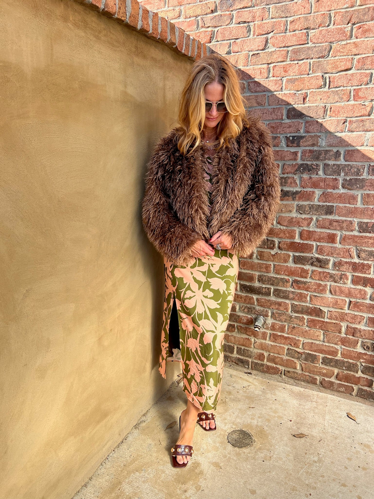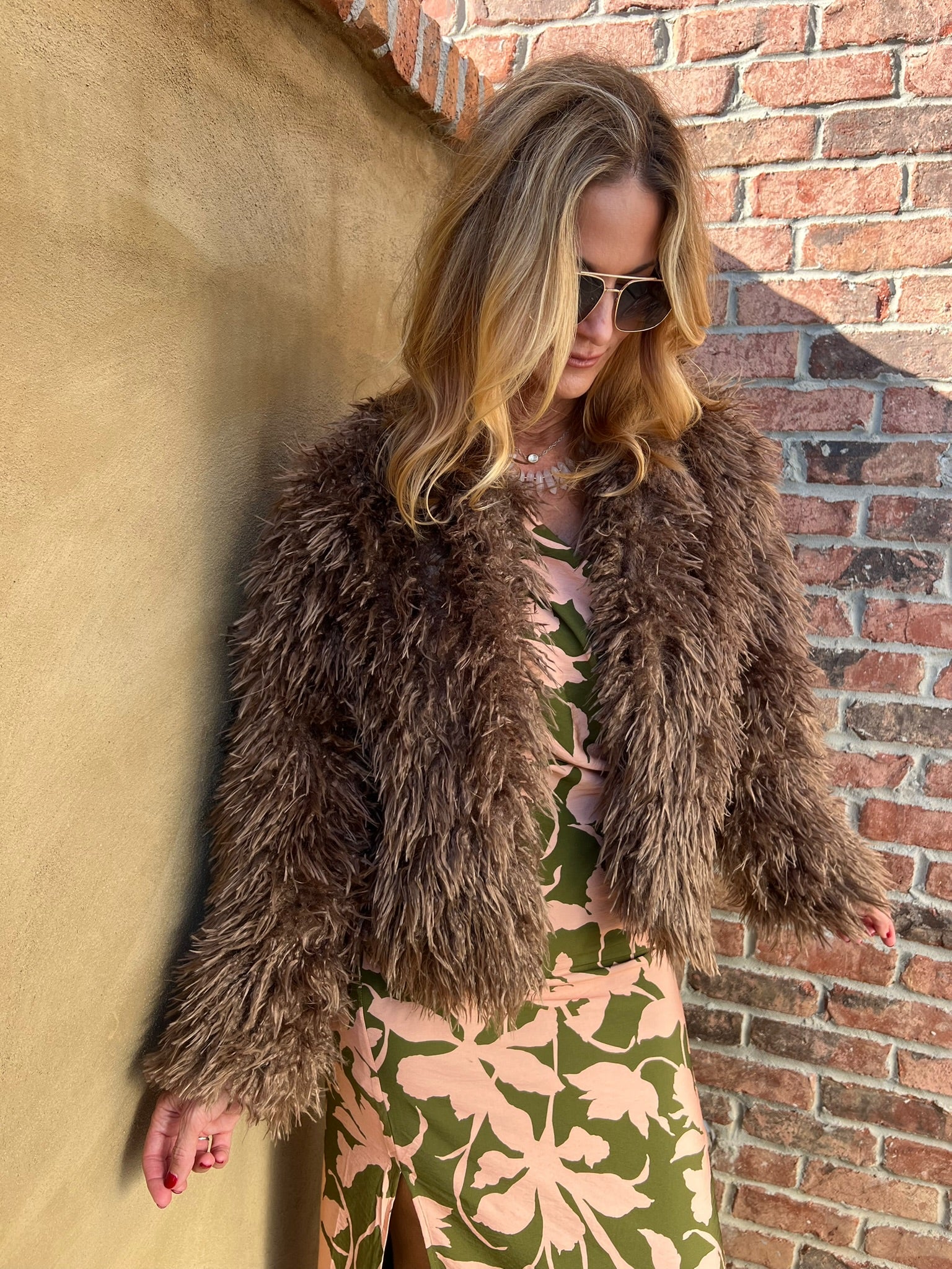 Bring the drama in the coziest way possible—this mocha-toned shaggy faux fur coat is a total statement piece. The textured finish gives it high-fashion flair, while the cropped cut makes it perfect for layering over dresses or denim. Equal parts bold and wearable, it’s the jacket that instantly elevates your fall wardrobe